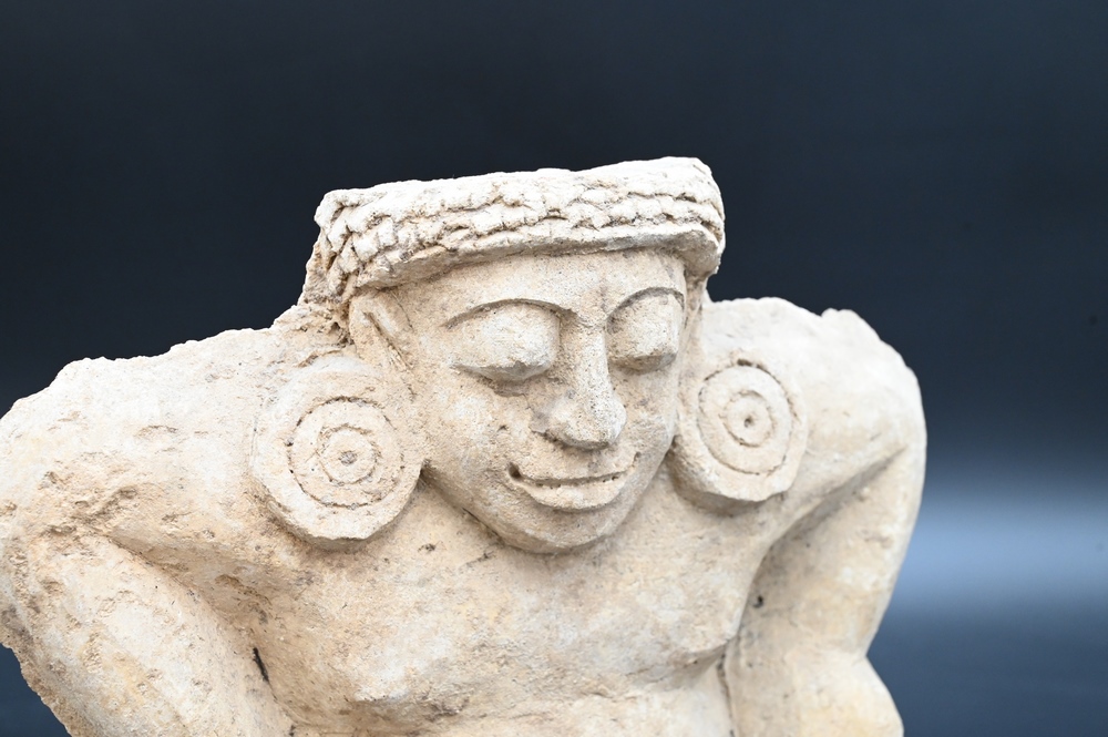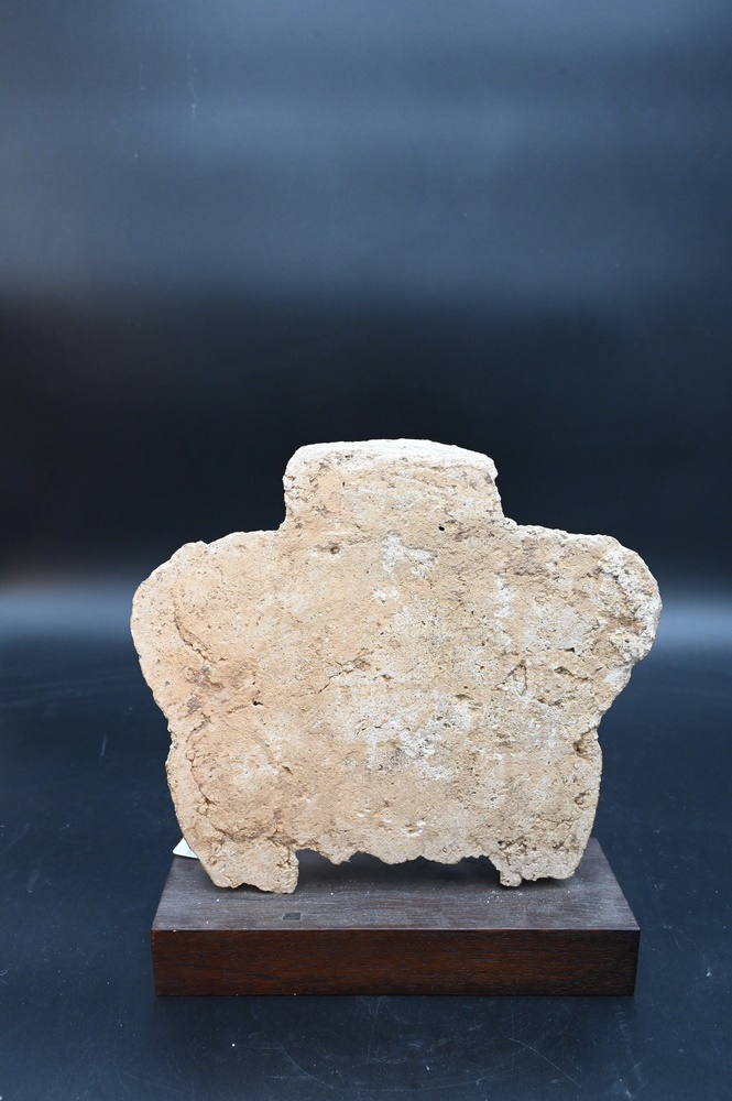 Lot 231: Terracotta Yaksha, India or Southeast Asia, 6th century, on wood base, height without base 8 1/2 inches.