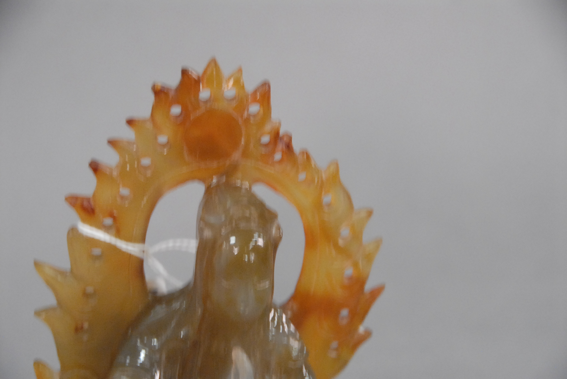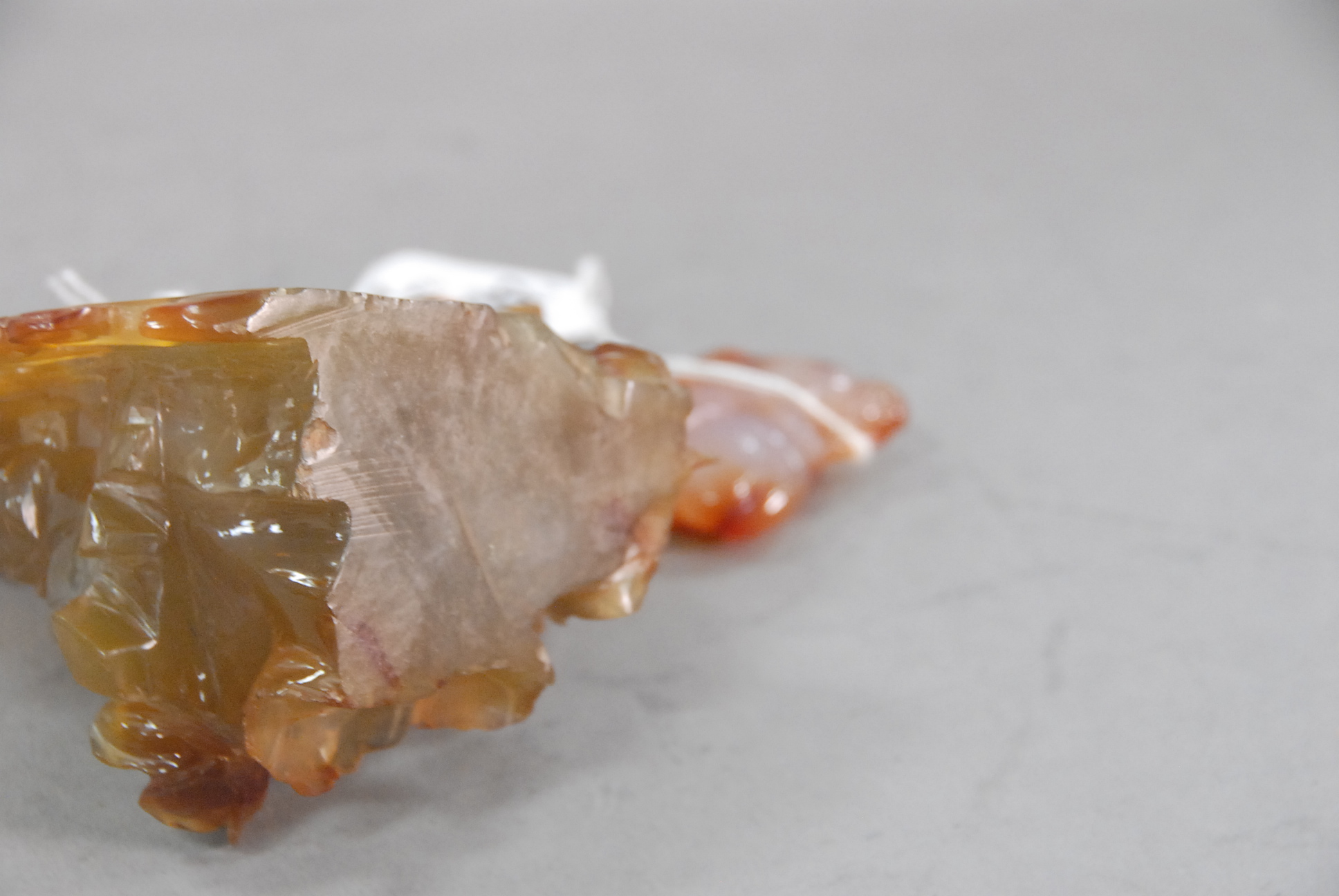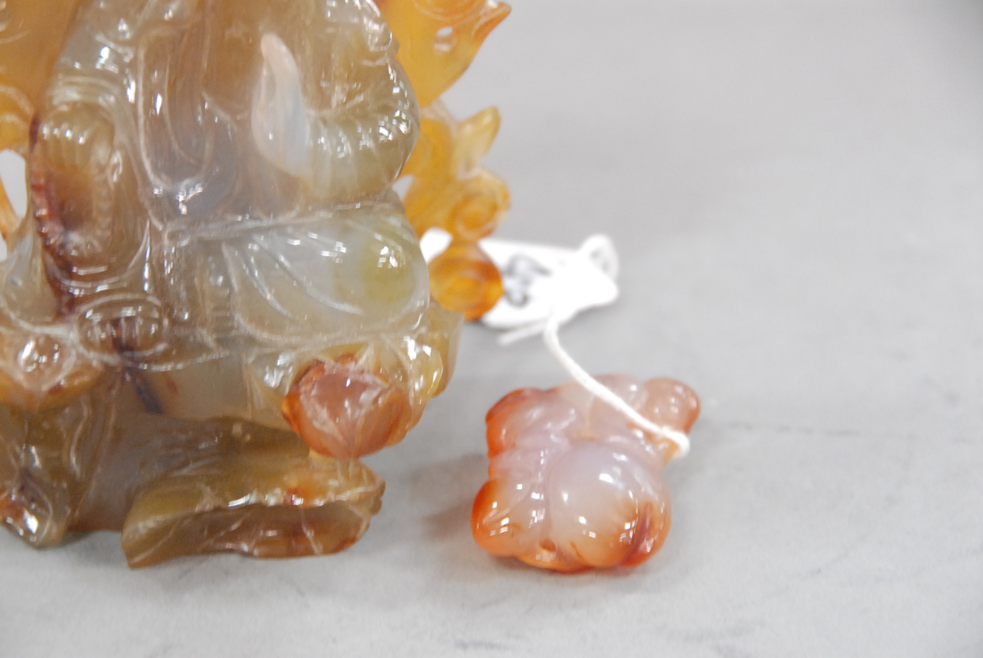 Two piece lot: carnelian carving of lady with beads and lotus, and carnelian pendant.