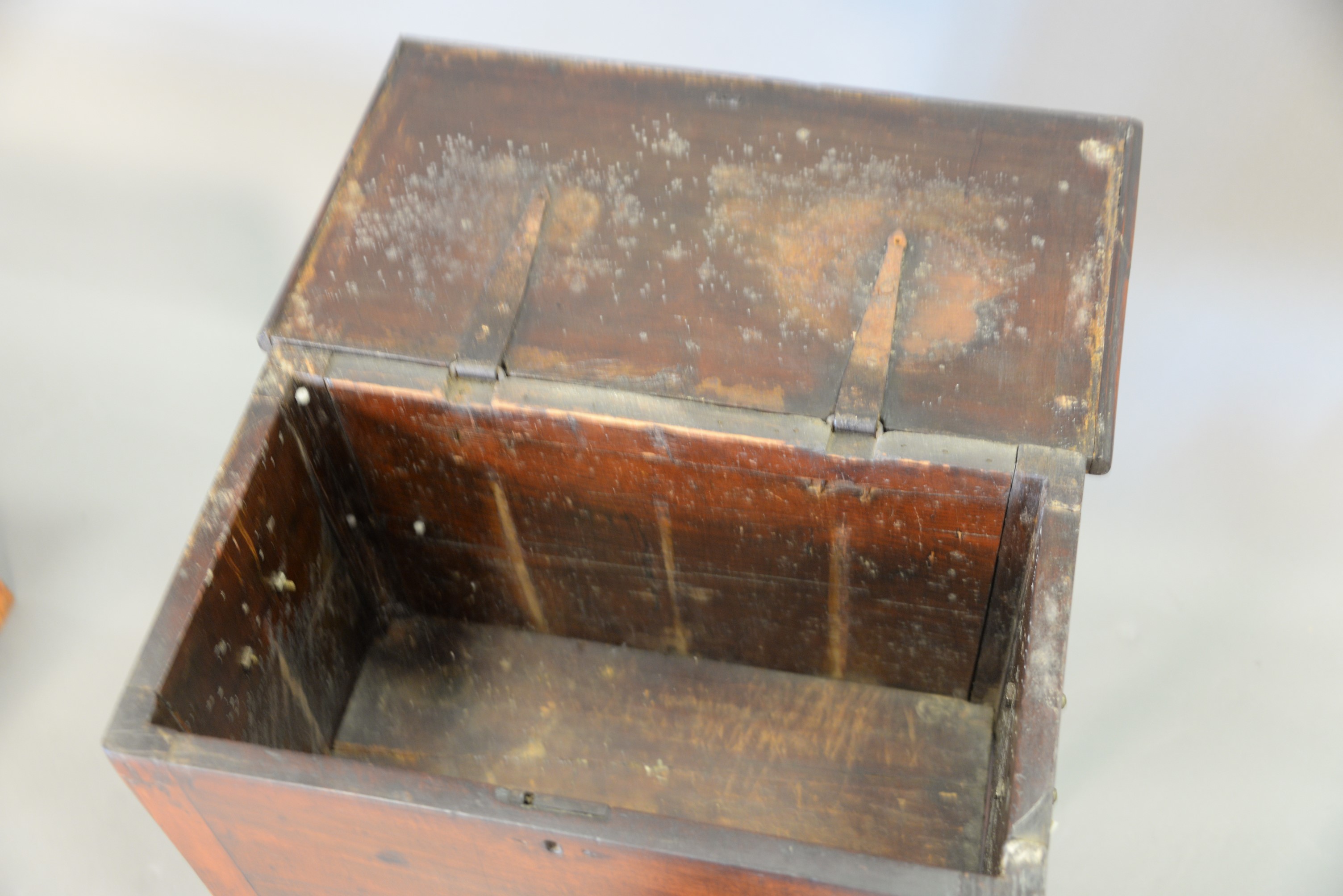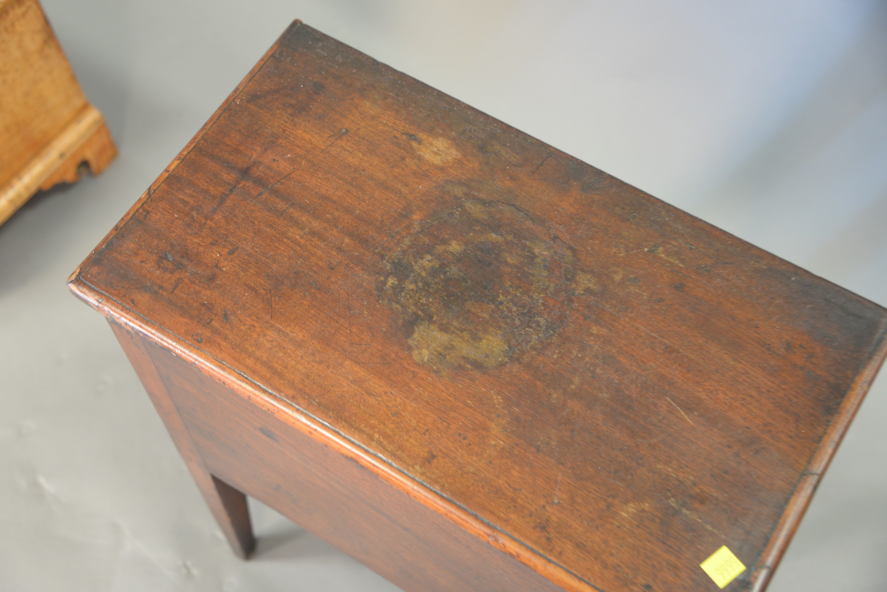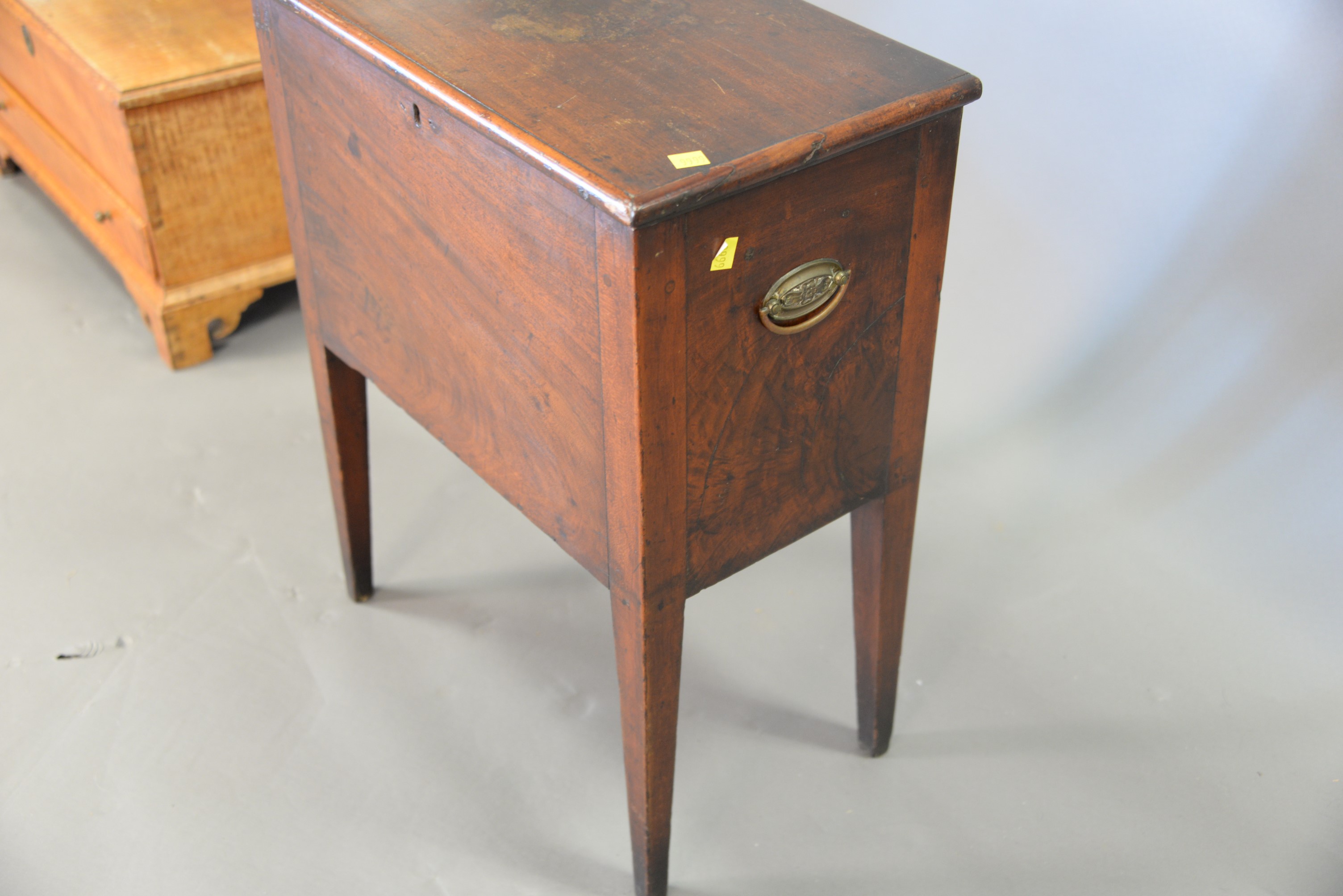 Lot 231A: Mahogany cellarette having lift top chest on square tapered legs, circa 1790-1810 no partitions inside. ht. 24 in. case wd. 18…