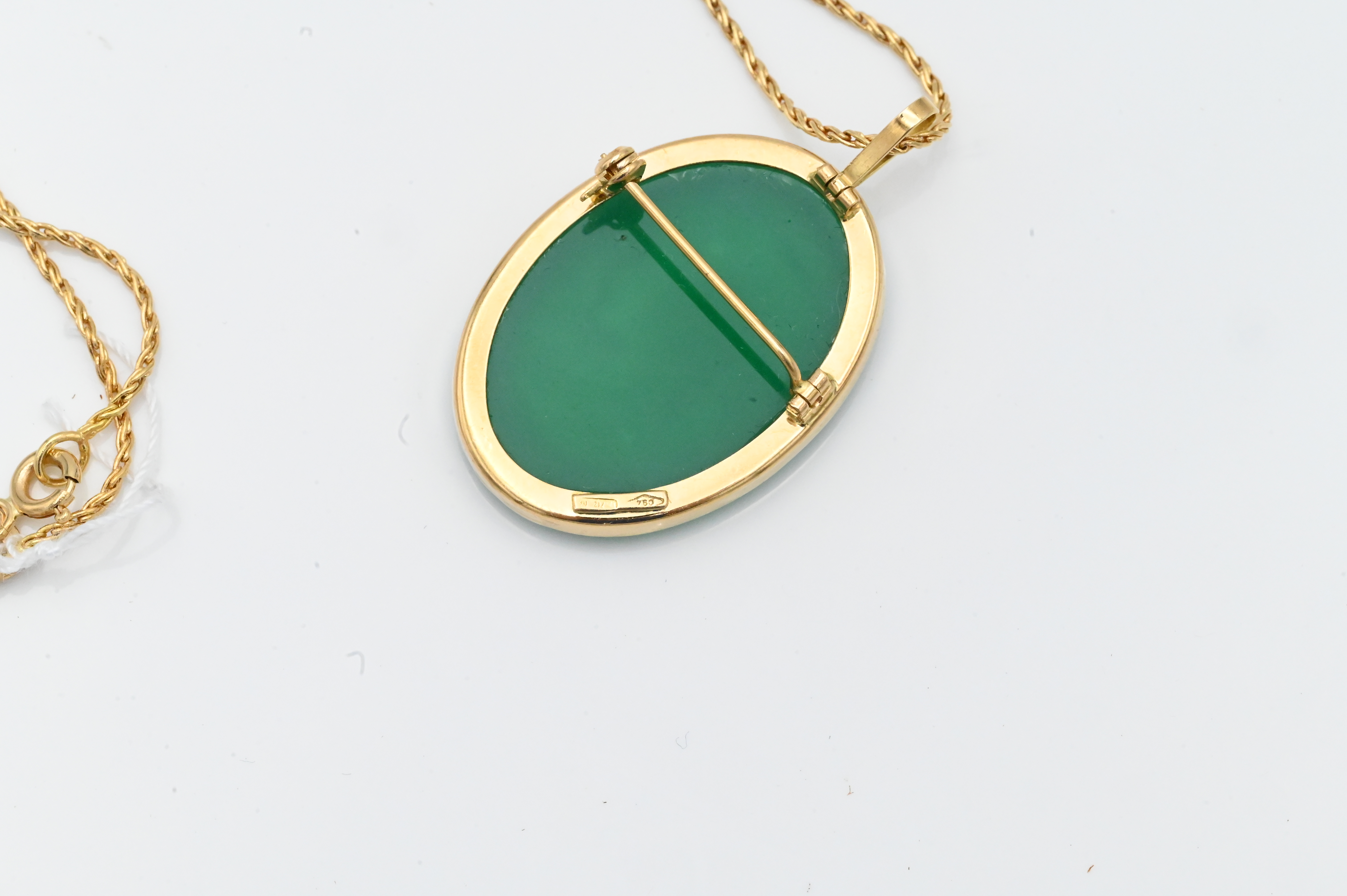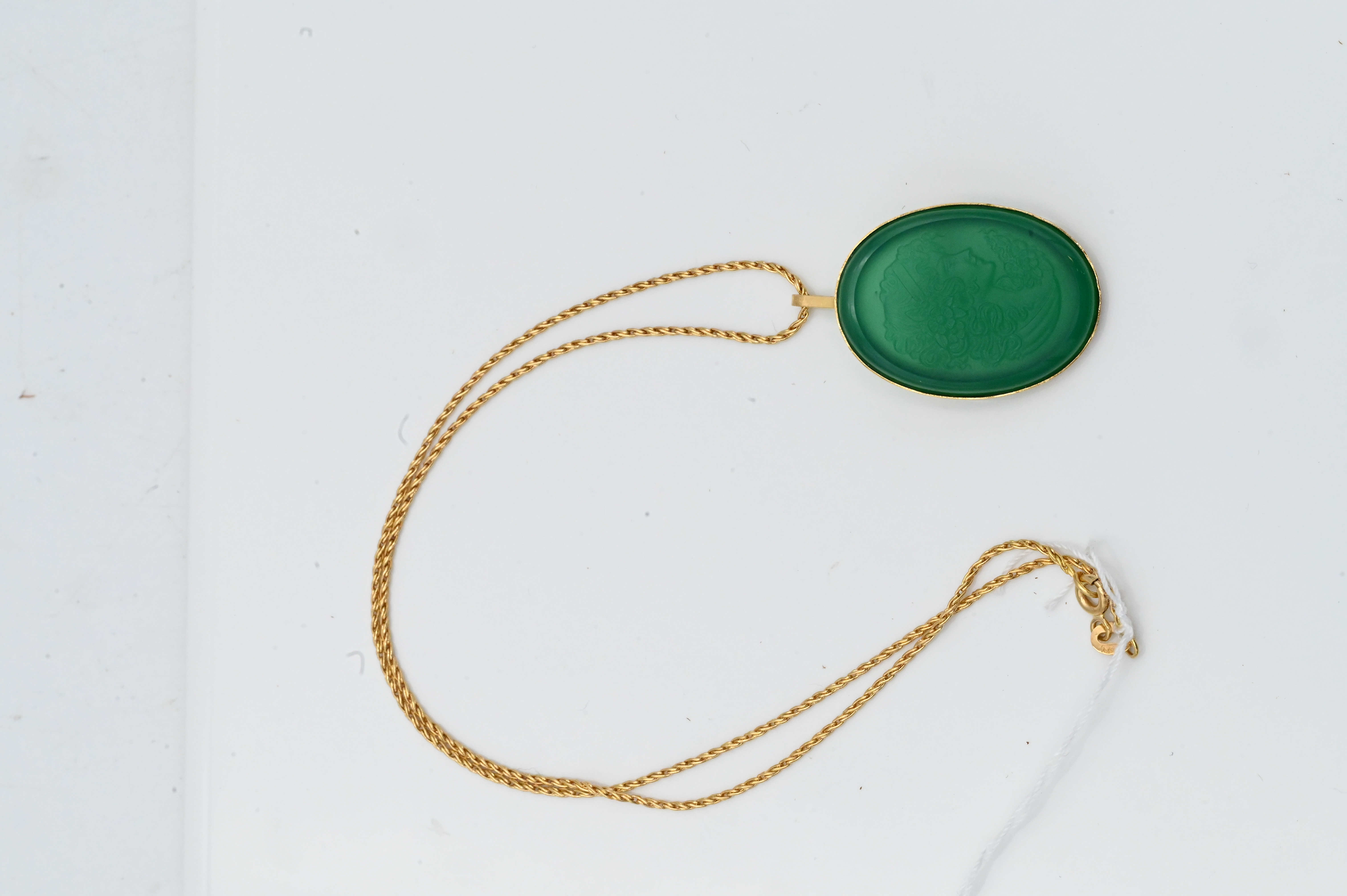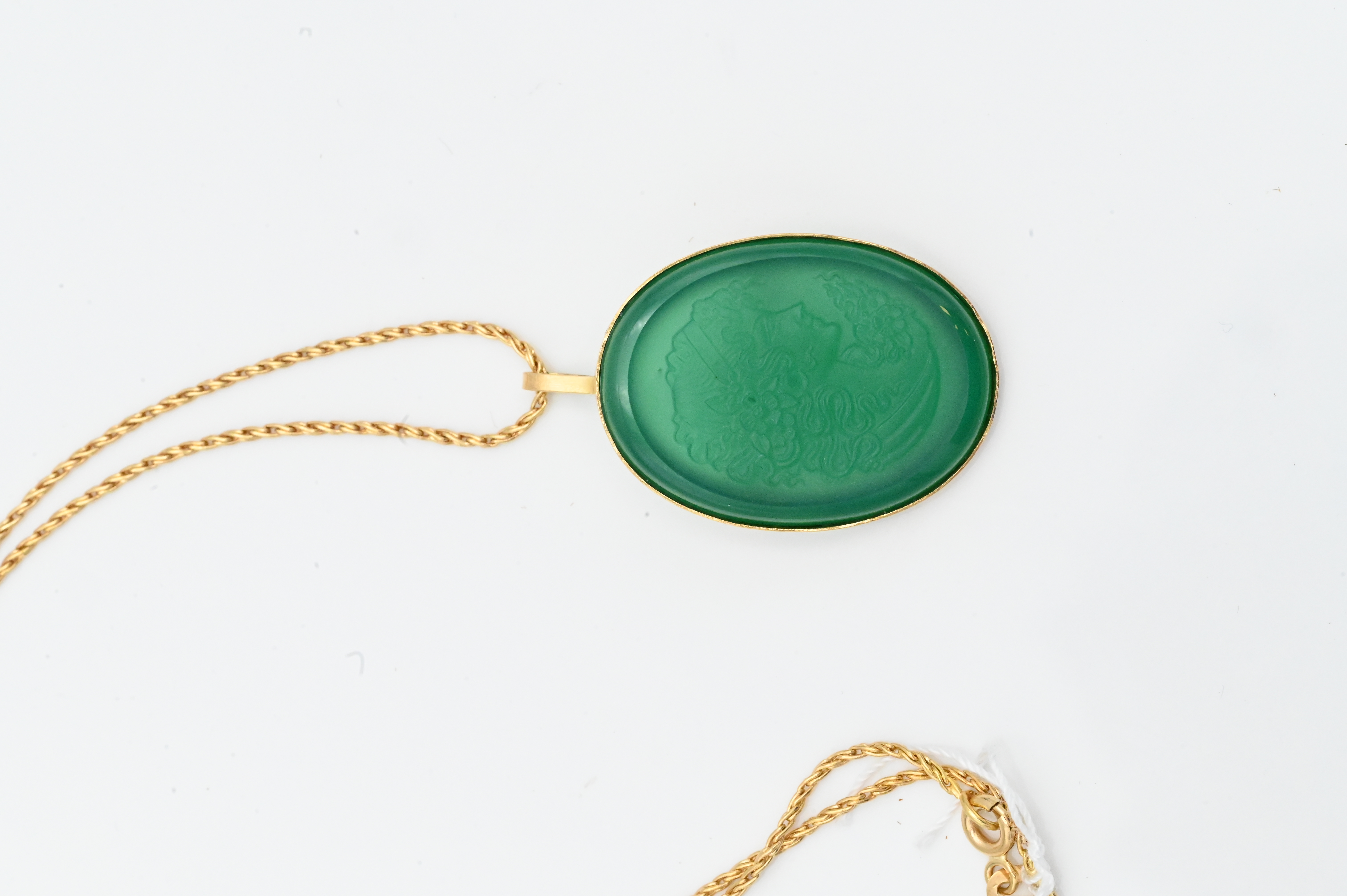 14 Karat Yellow Gold Necklace, having 18 karat yellow gold mounted green cameo, 9.7 grams total weight.