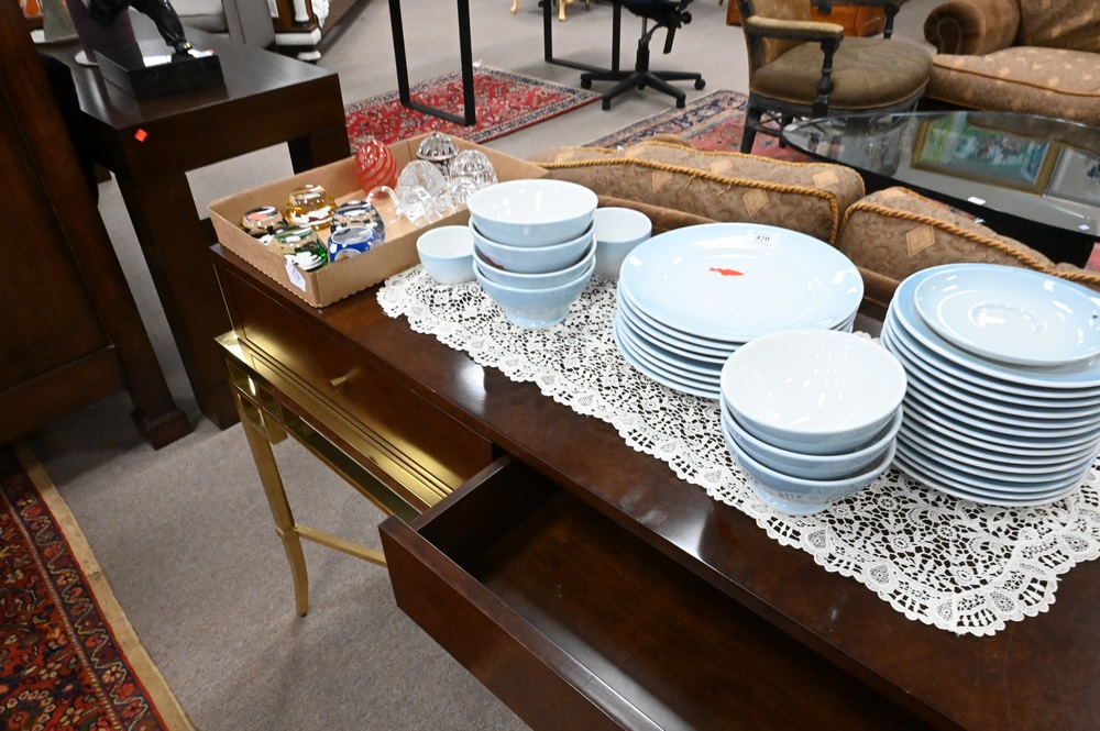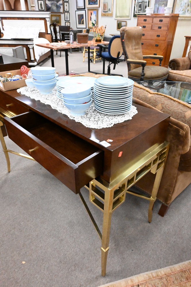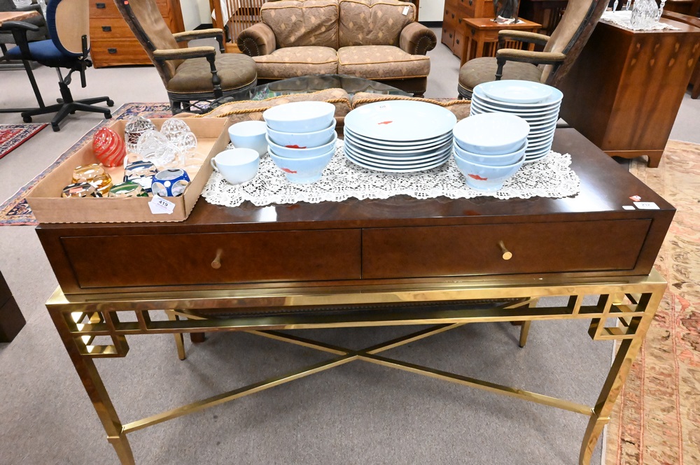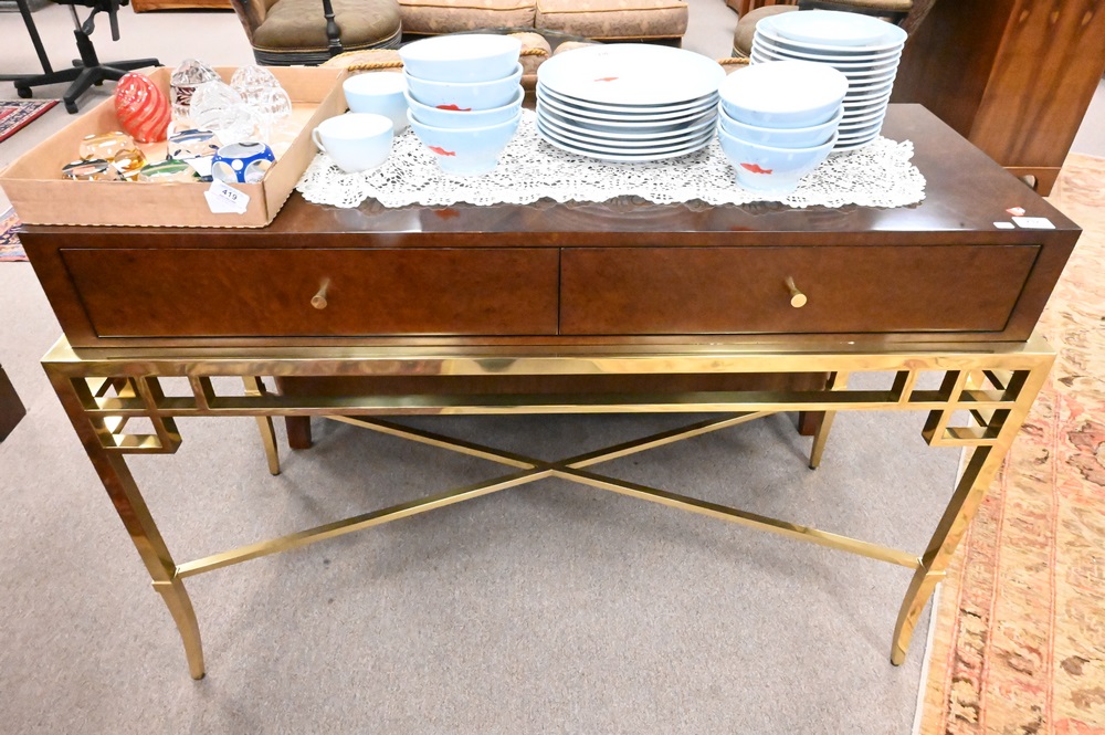 Bolier & Company Burlwood Table, on brass base, height 33 inches, top 19″ x 48″.