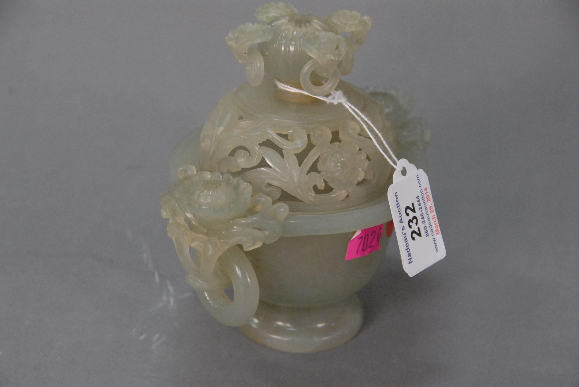 Lot 232: Celadon jade covered censer with ringed lotus handles and finial, China, 19th century fissure to rim cover. ht. 6in.