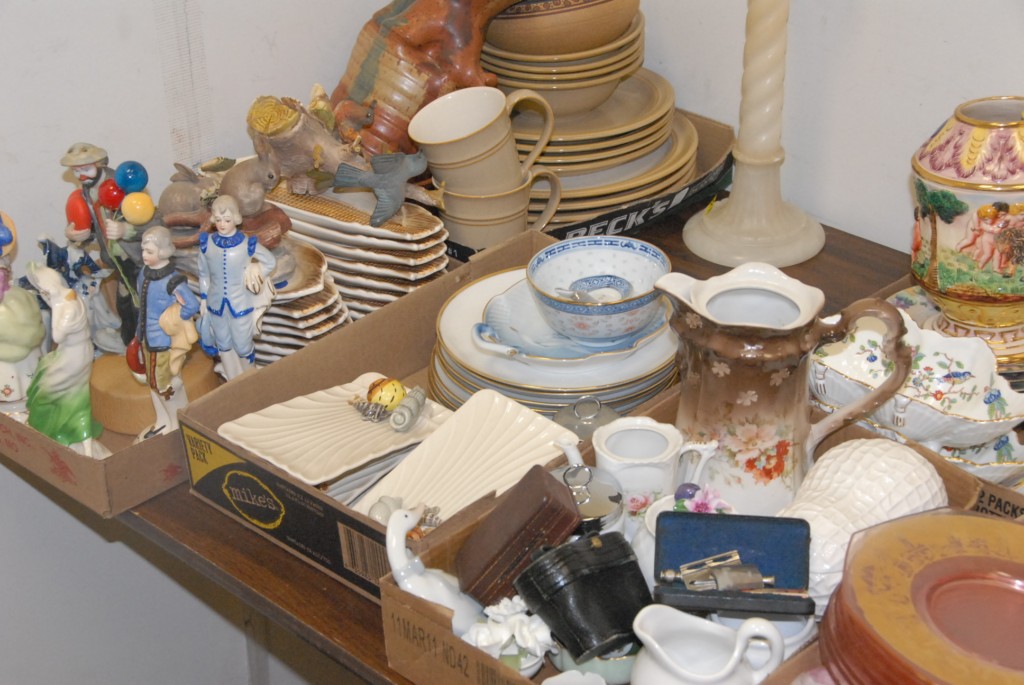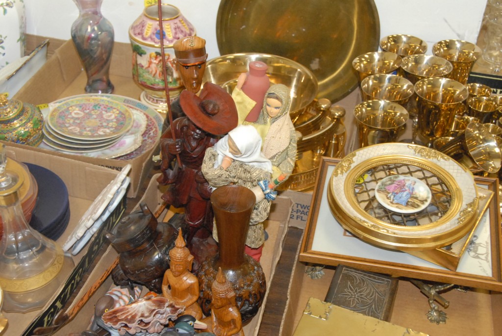 Eleven box lots brass, Chinese porcelain, Aynsley, cobalt plates, depression glass, alabaster candlesticks and misc.