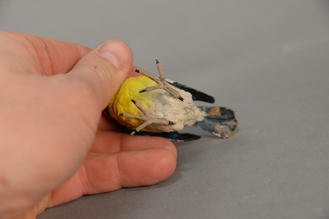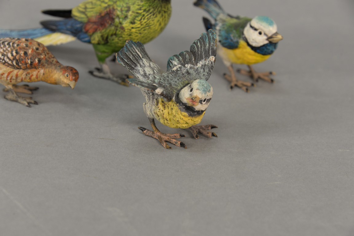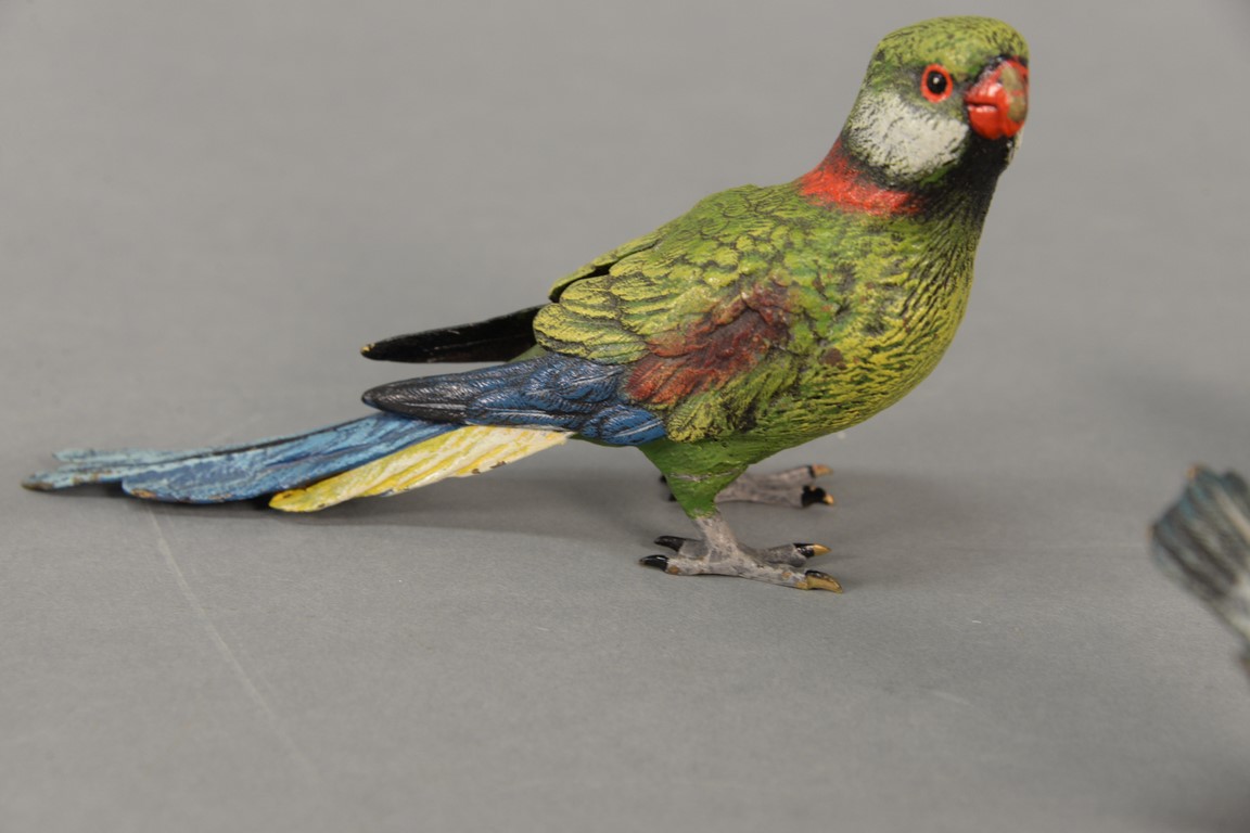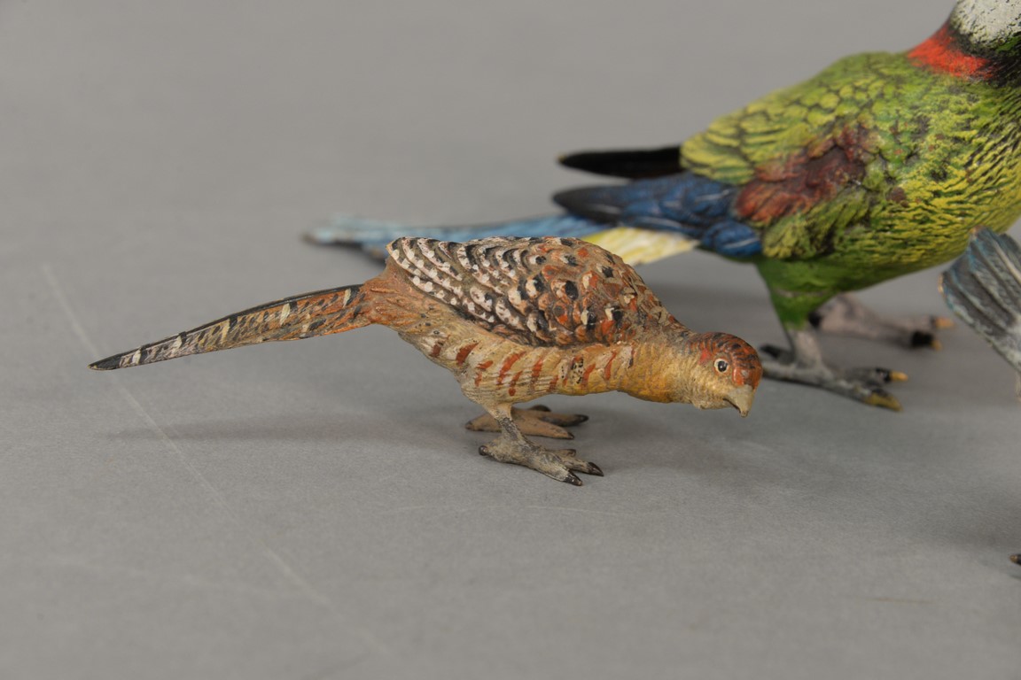 Lot 232: Four bronze painted birds including two small cold painted Bergman bluebirds, a green parrot, and a small pheasant. heights 1 inch …
