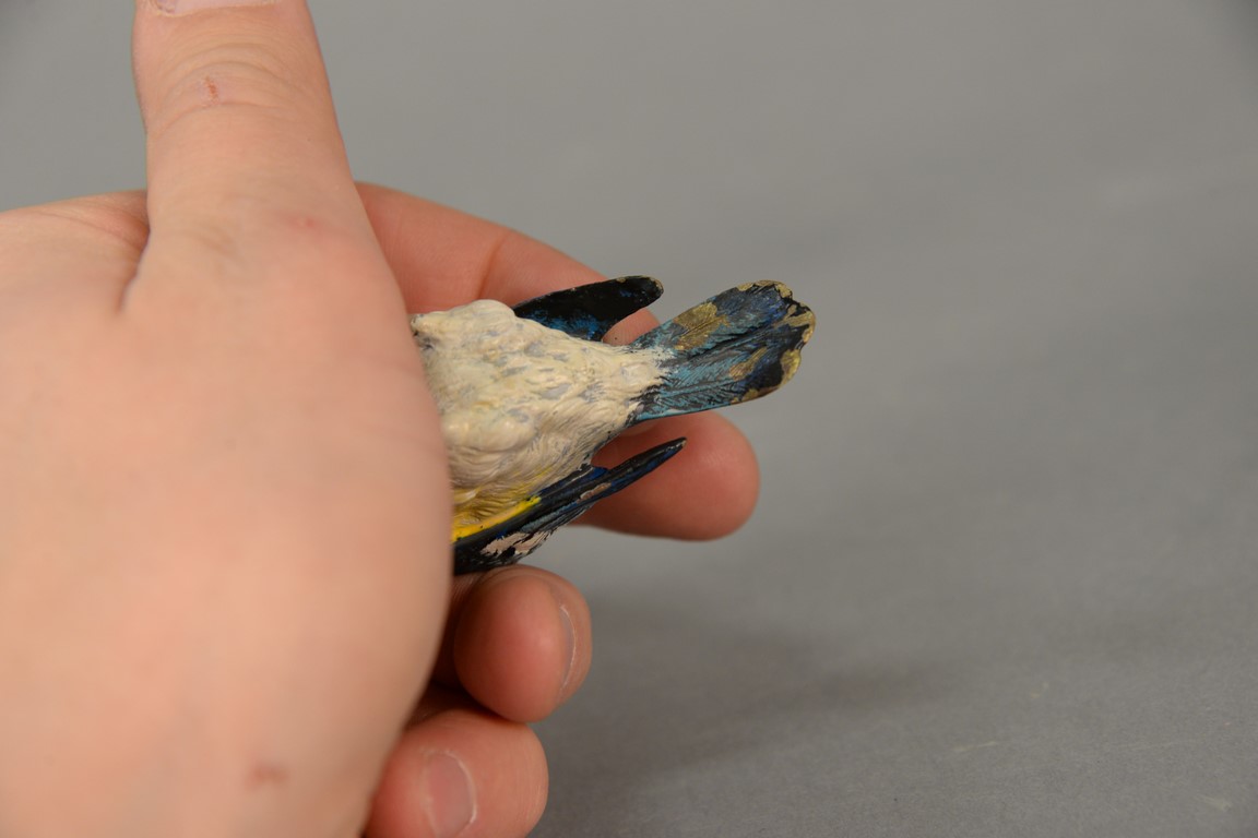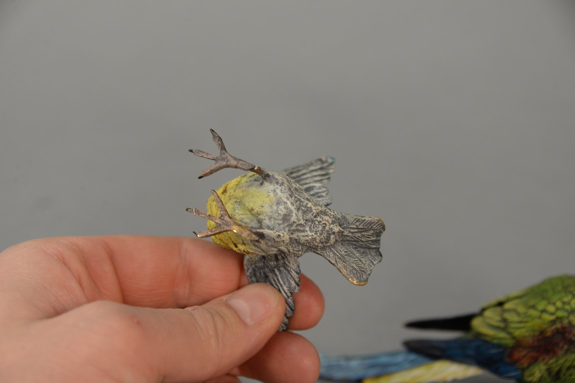 Four bronze painted birds including two small cold painted Bergman bluebirds, a green parrot, and a small pheasant.