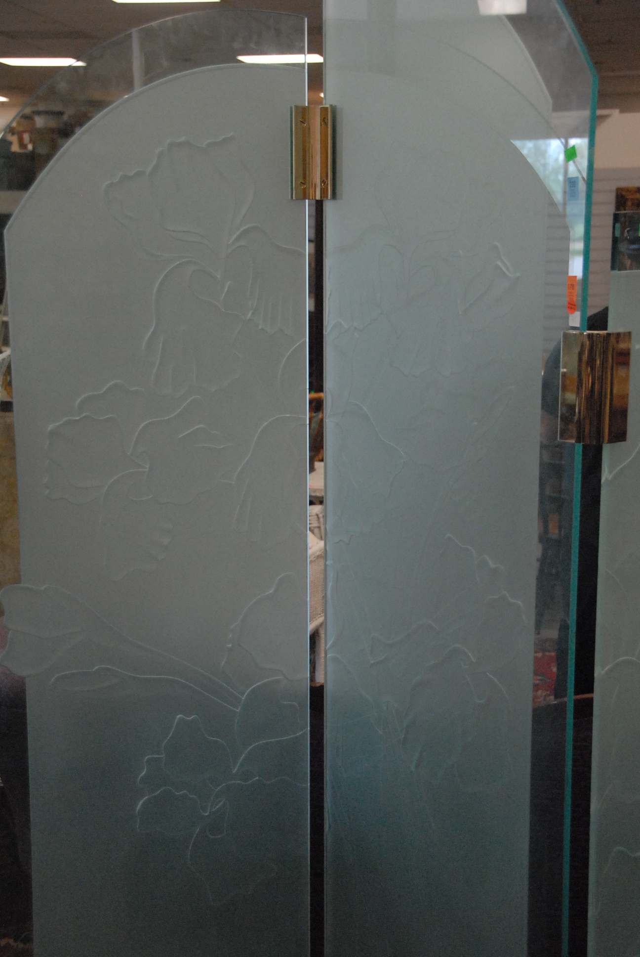 Lot 232: Four fold custom frosted glass dressing screen no hinge – stable in excellent condition, tallest point 84in.
