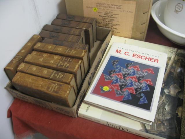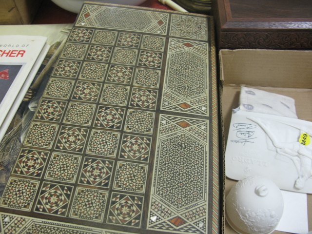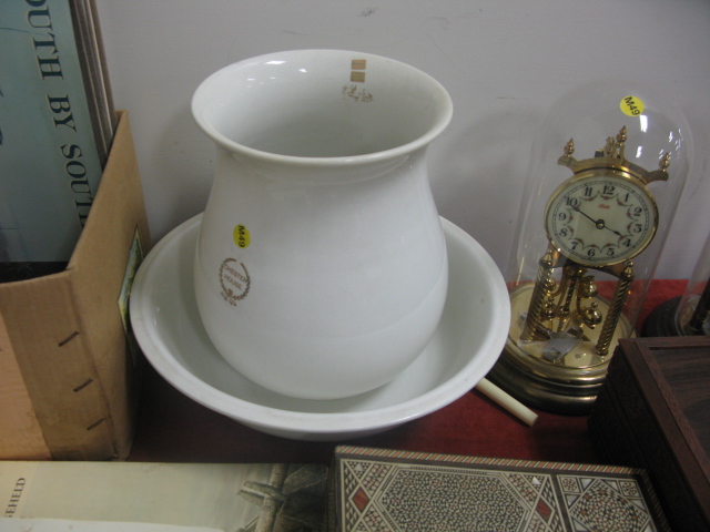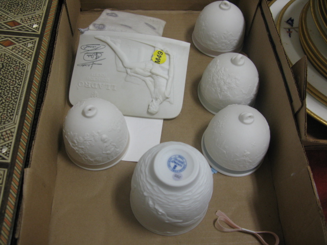 Group lot to include Lladro bells, sign, phone, games, game box, large bowl and pot and two 100 day clocks