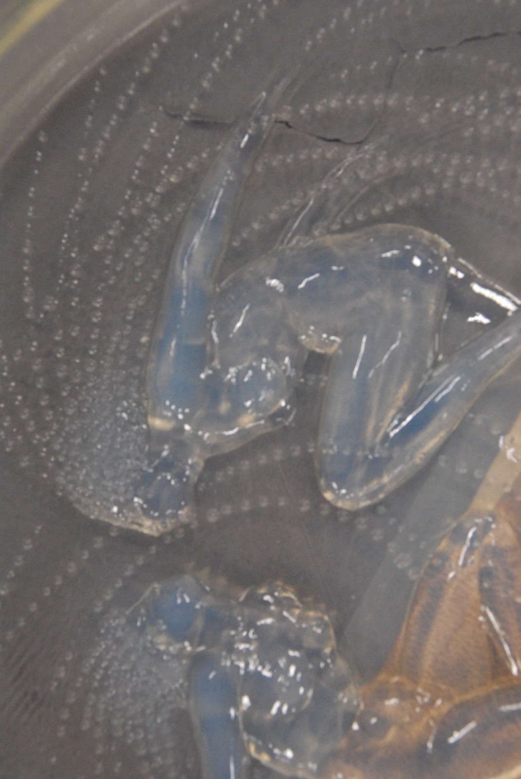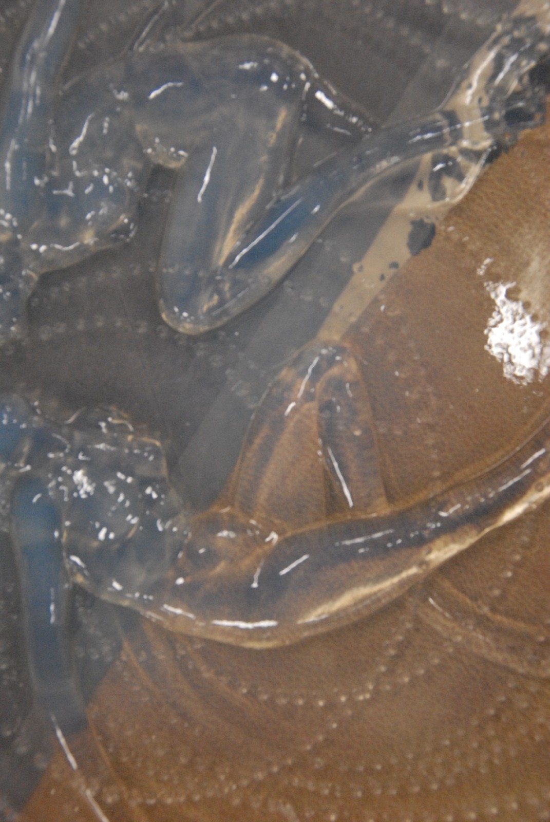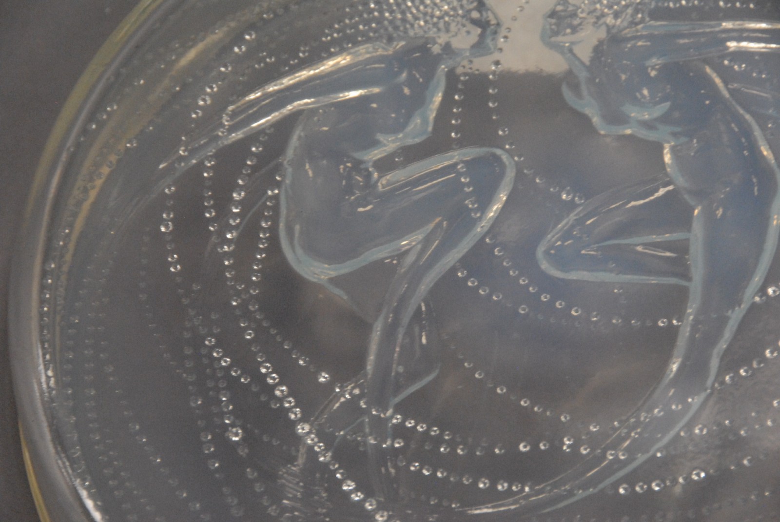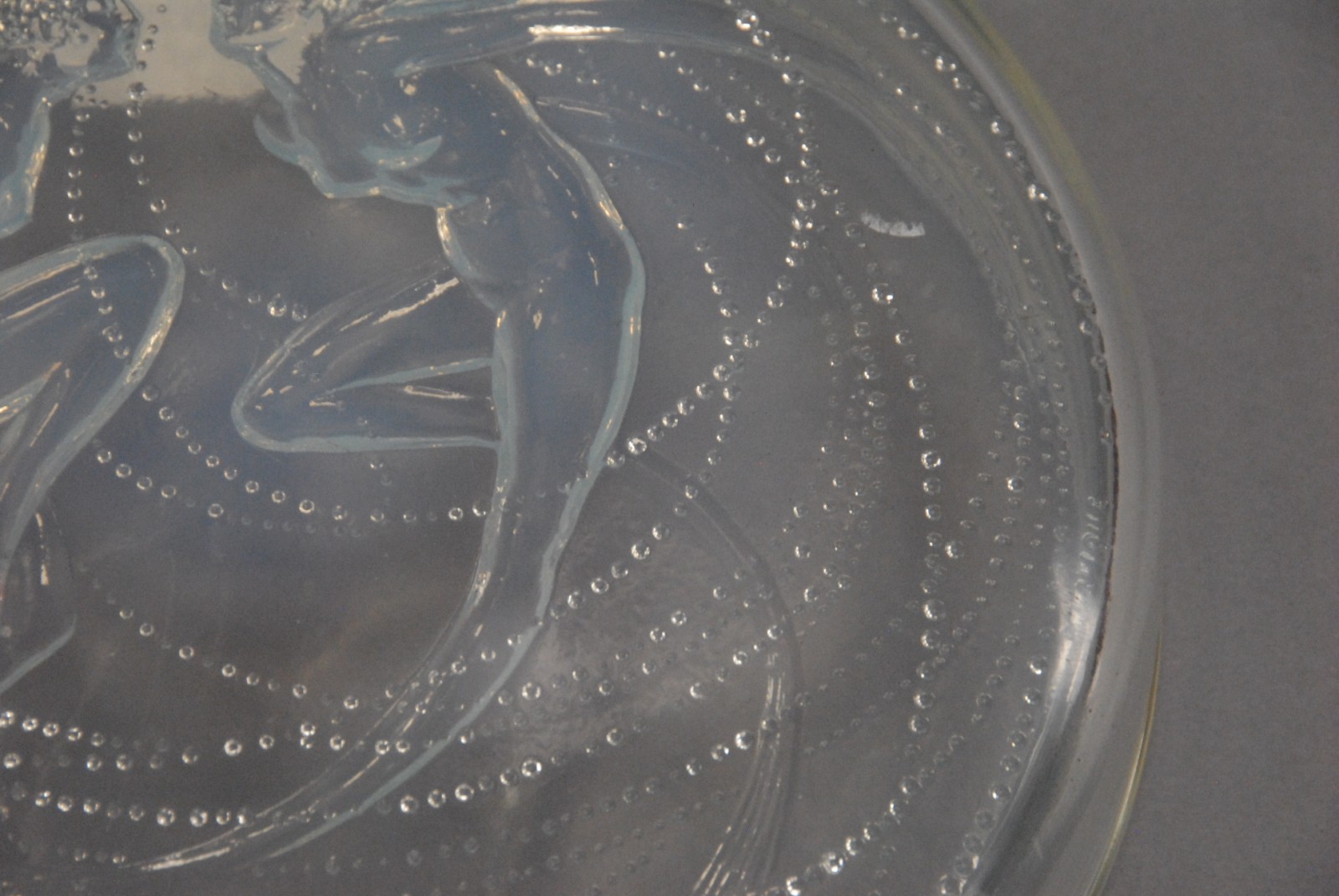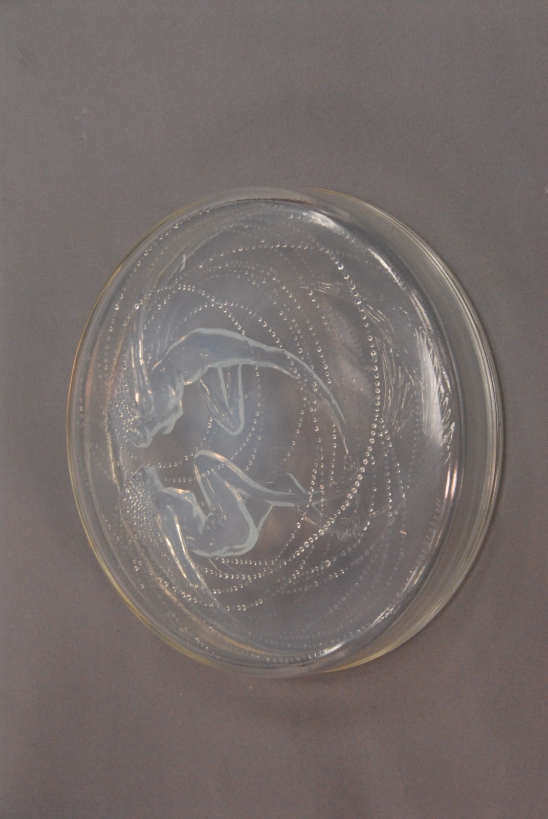 Lalique Deux Sirenes round covered box with opalescent nudes signed R. Lalique in block letters.