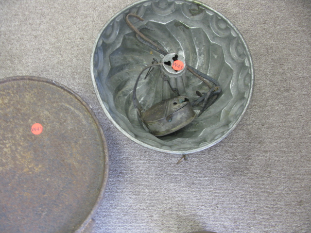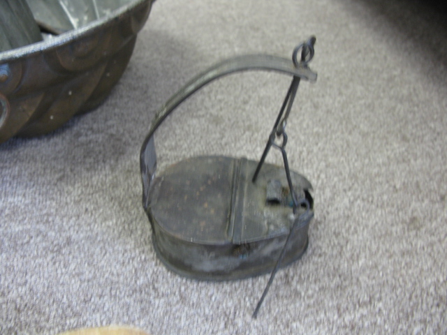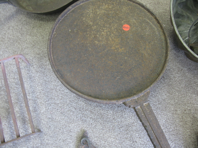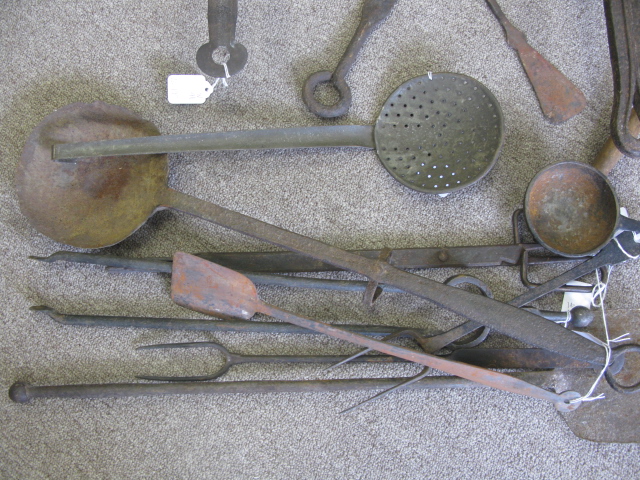 Large iron lot to include roaster, skillet, copper mold, iron tools, tin tole betty lamp, strainer, and misc.