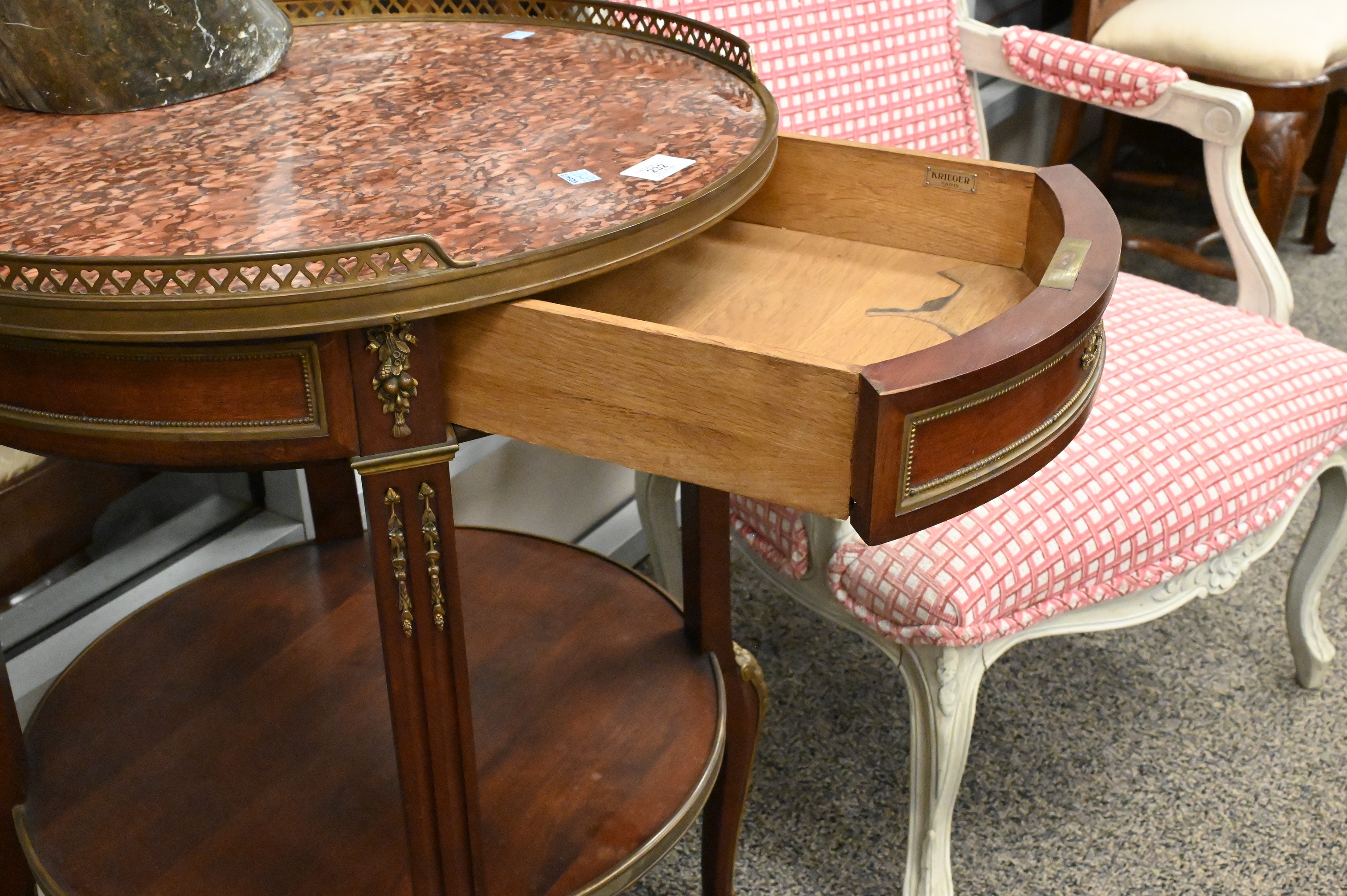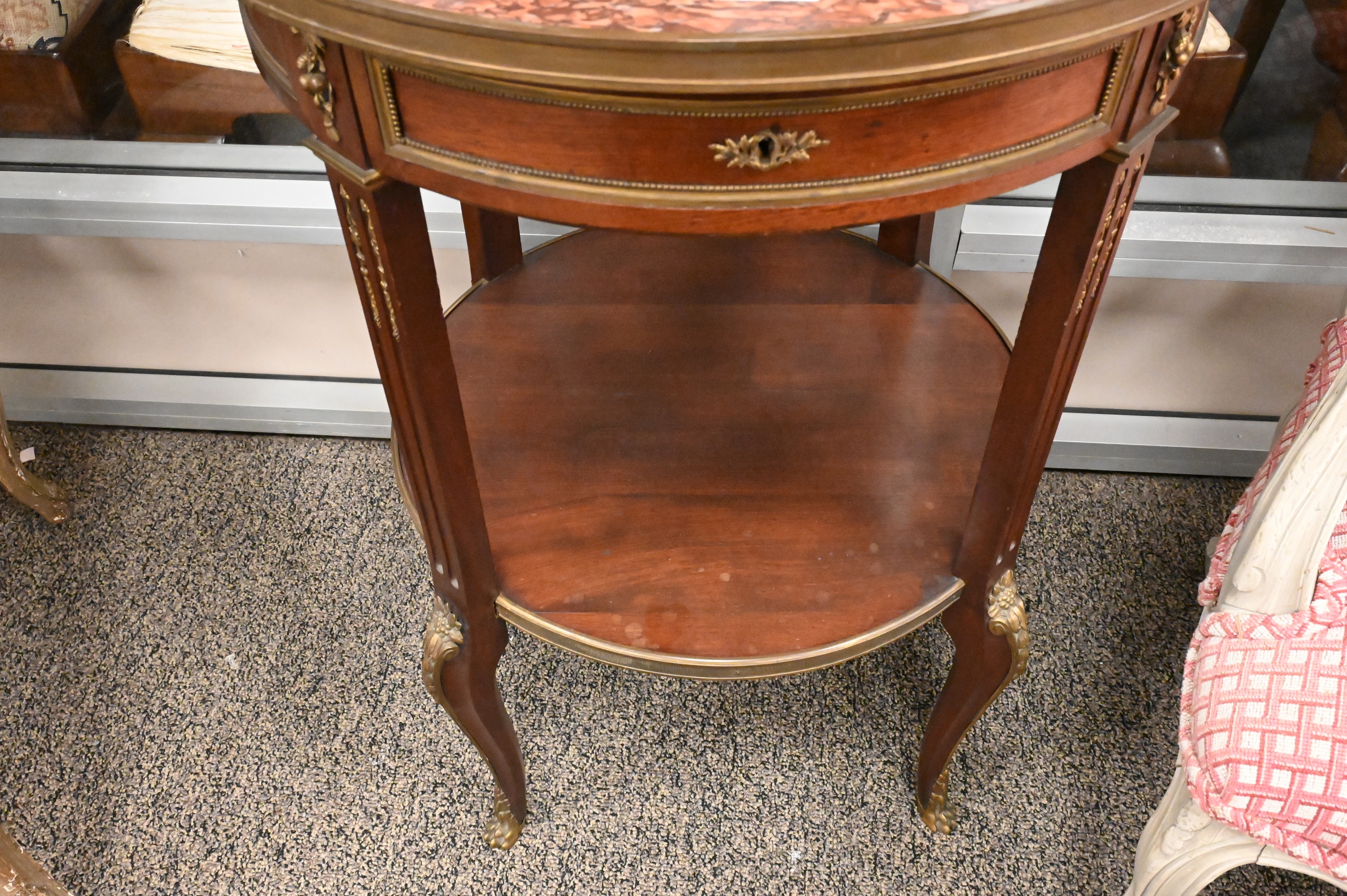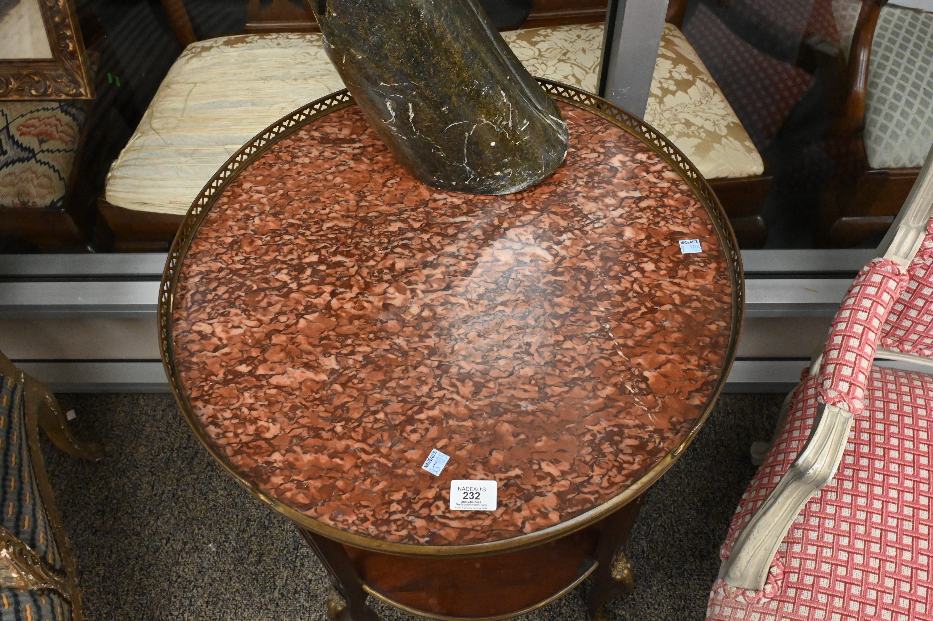 Lot 232: Louis XV Style Ormolu Mounted Round French Marble Top Table having Brass Gallery