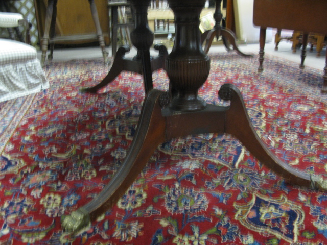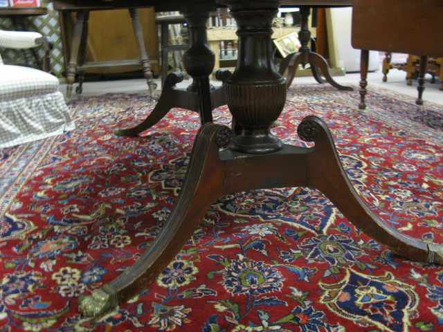 Mahogany double pedestal dining table with 2 extra leaves & custom made pads