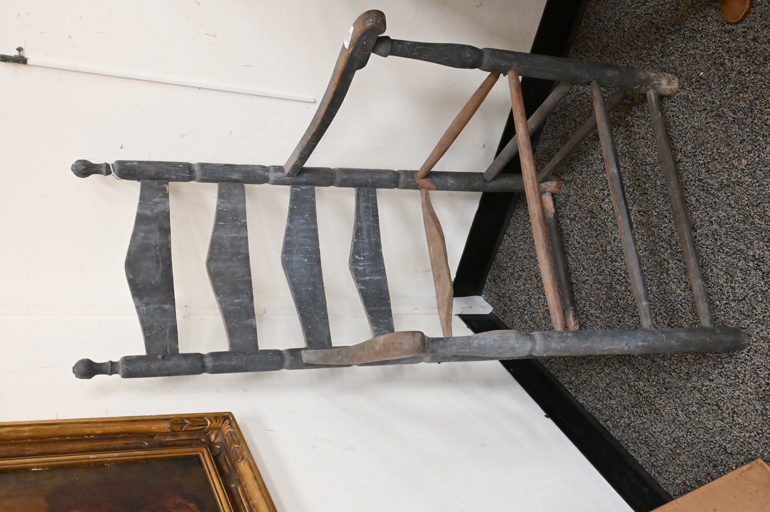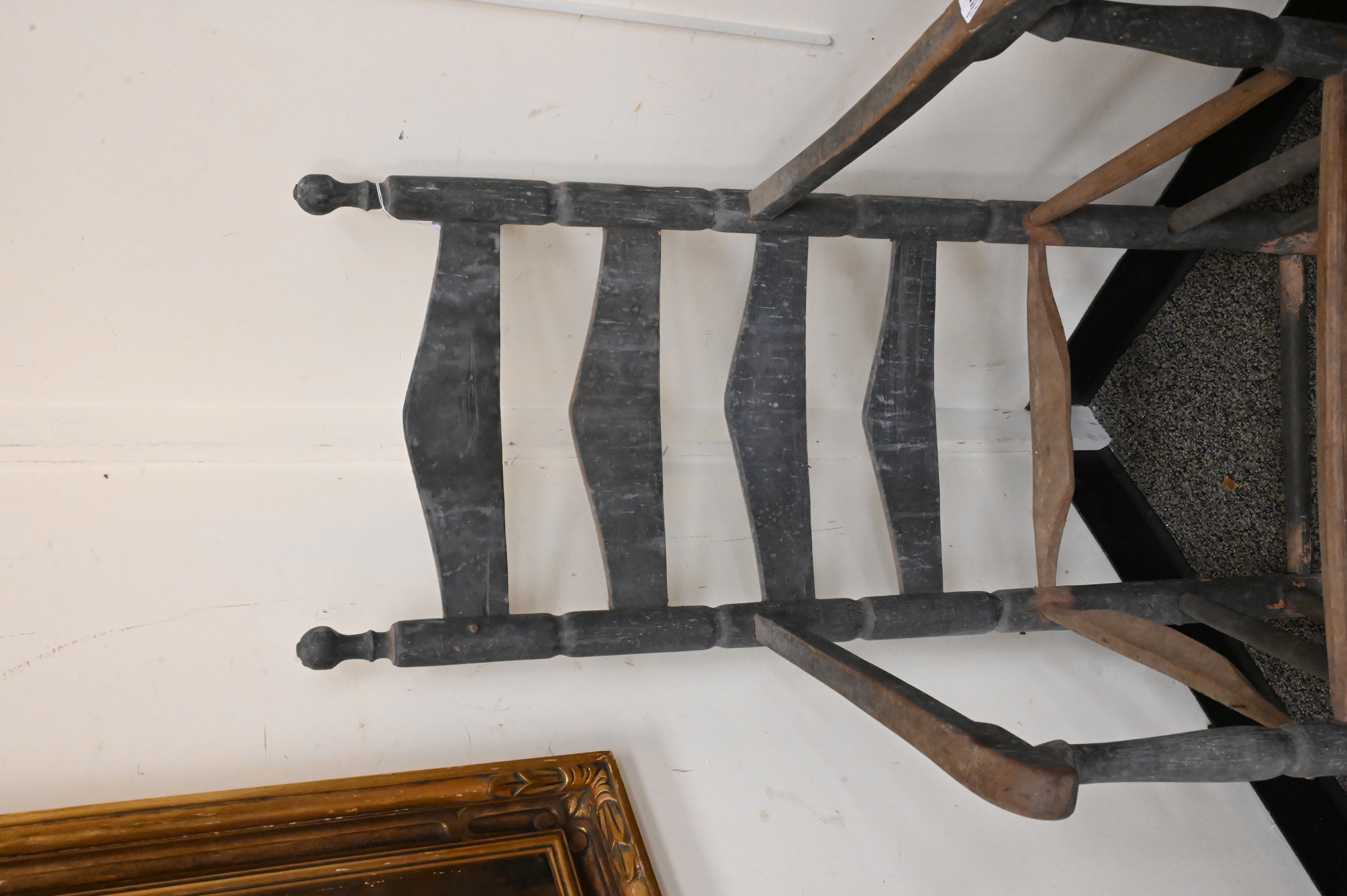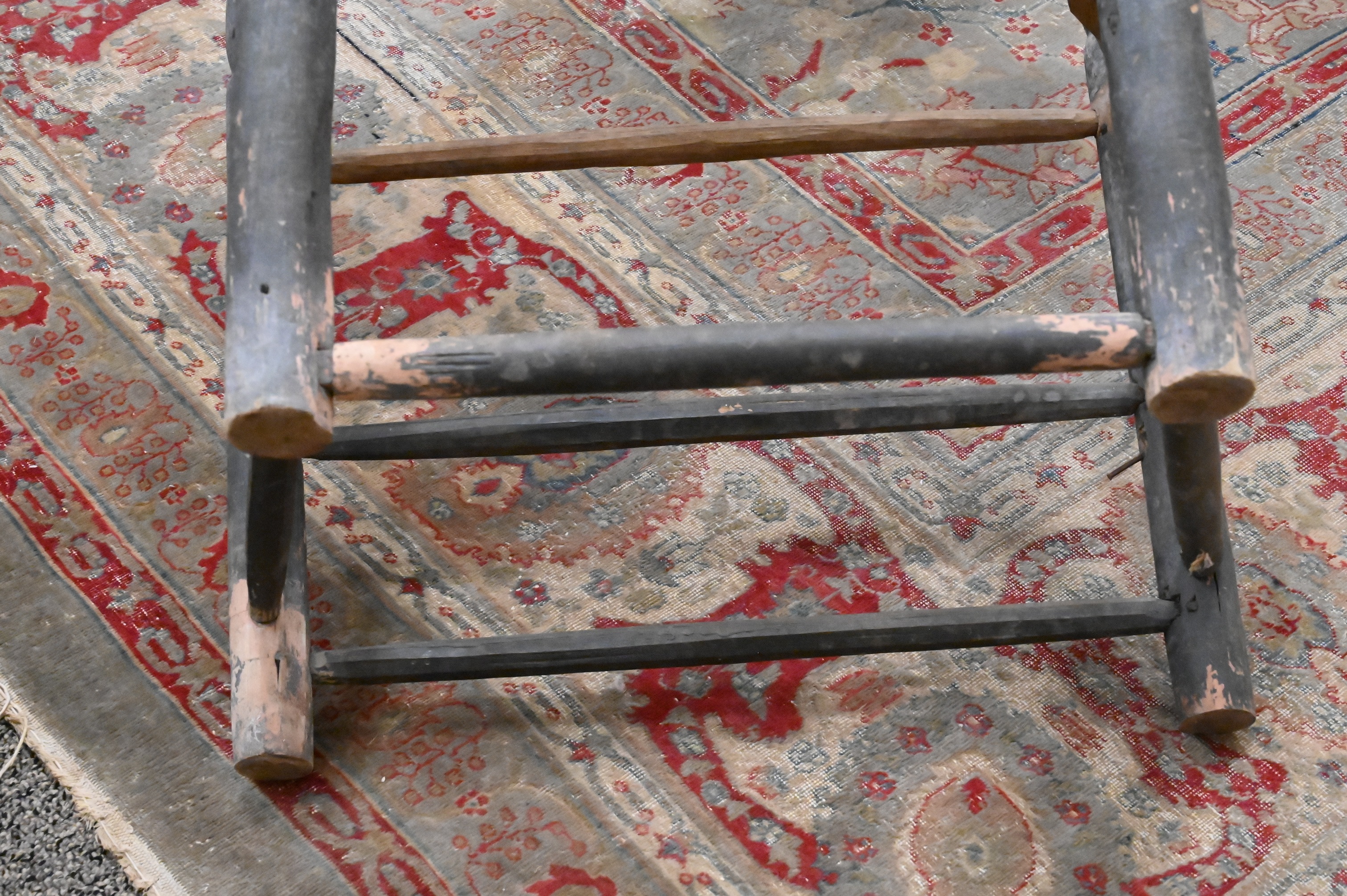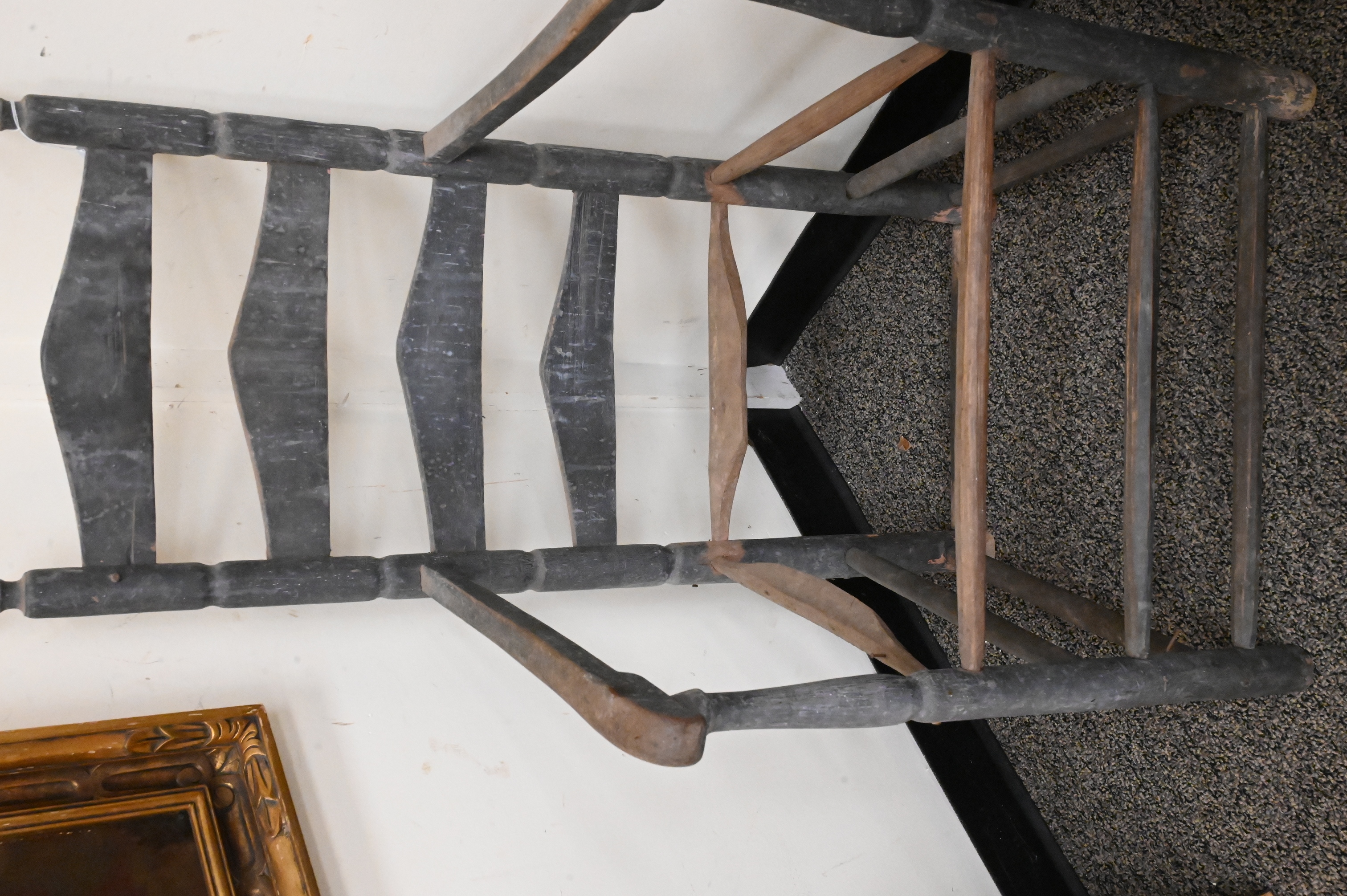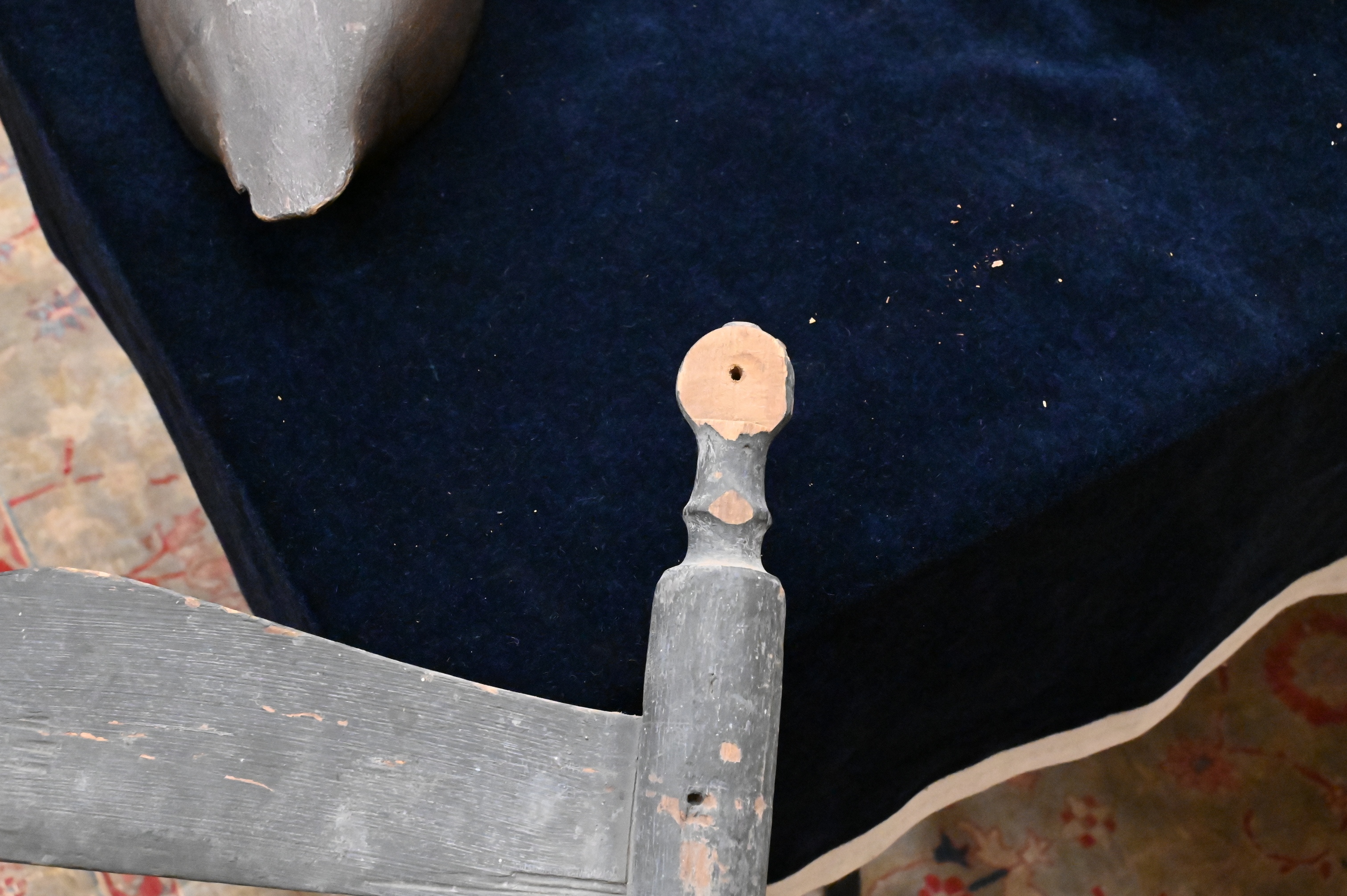 Condition: Surface wear and paint loss; seat lacking; looseness and wear to stretchers; back of top finials cut flat.
