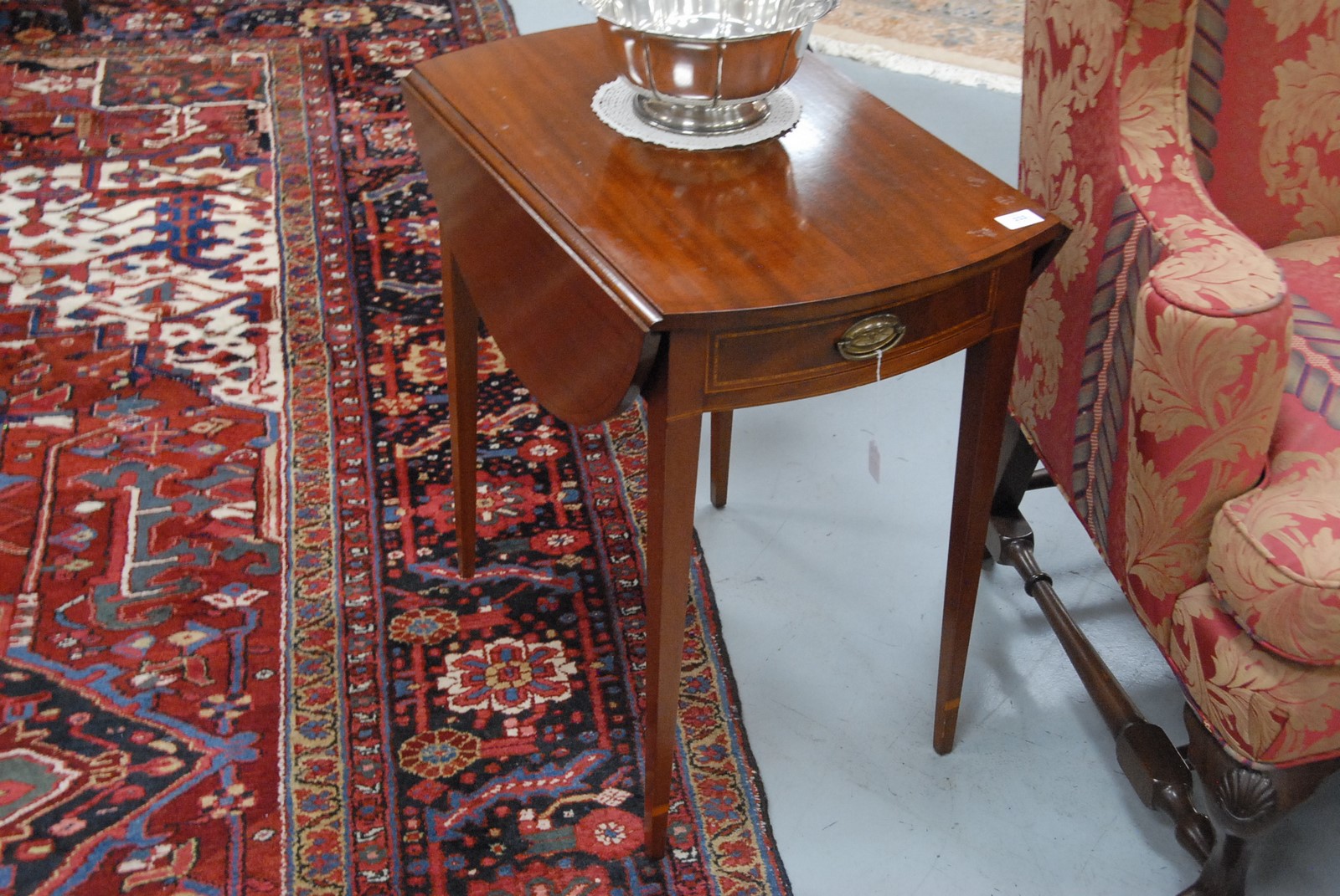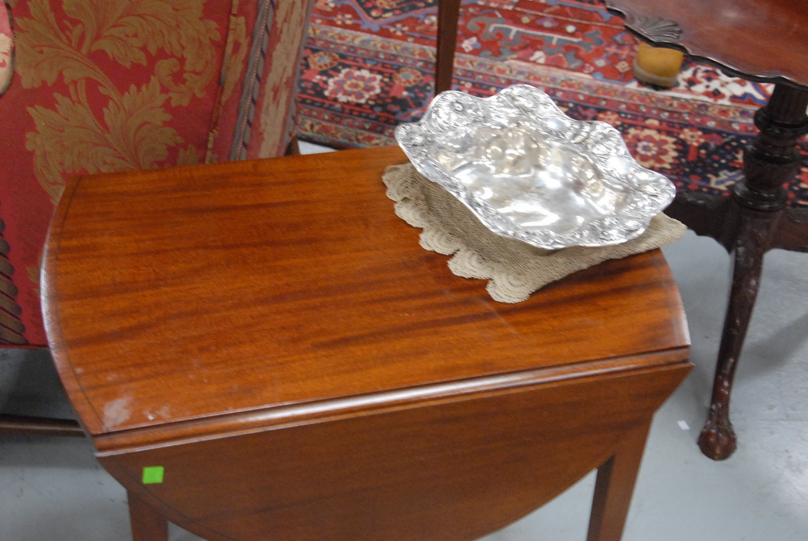 Lot 232: Pair of Margolis mahogany Pembroke tables having oval drop leaves and bowed ends with drawer all set on square tapered legs, signed Margolis. ht. 27 in. 26 1/4 x 34 1/4