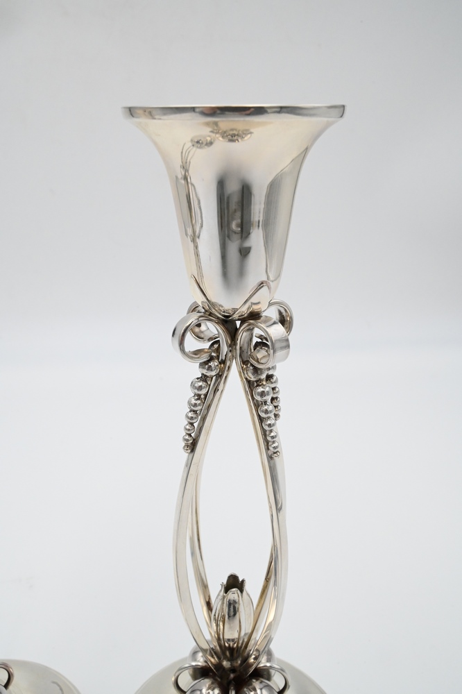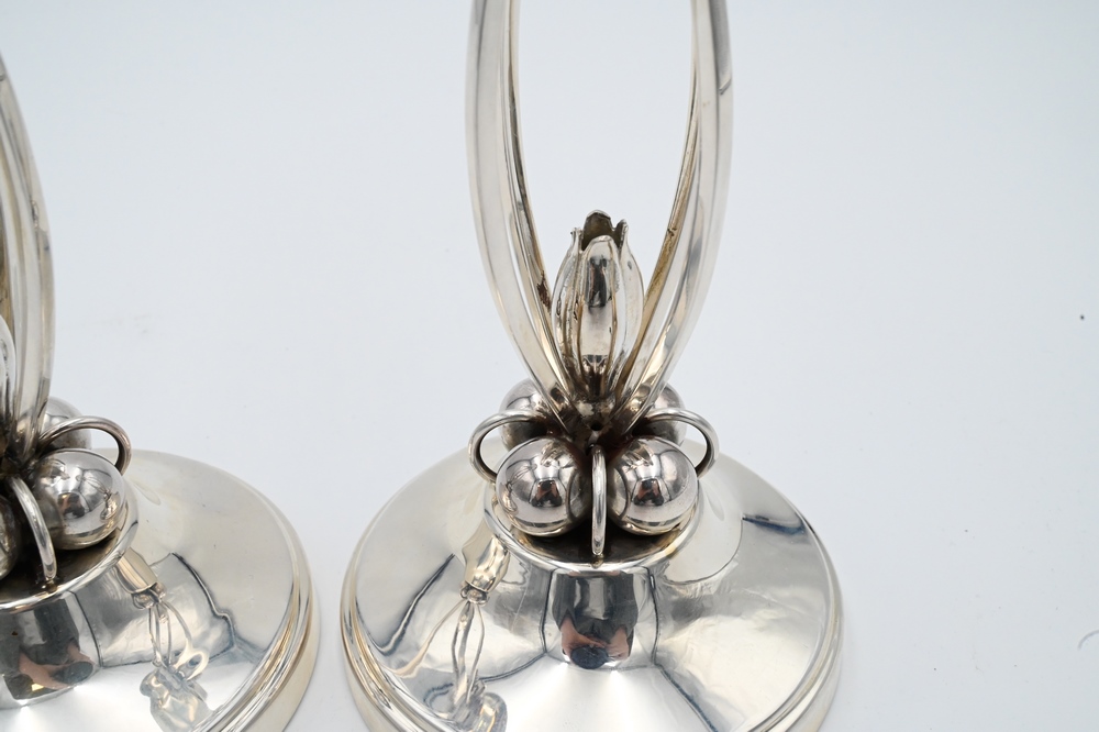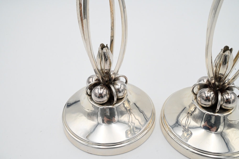 Lot 232: Pair of Sterling Silver Candlesticks, Danish Georg Jensen style, having flower form round base, height 10 1/2 inches, diameter 4 inc…