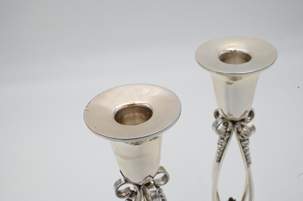 Pair of Sterling Silver Candlesticks, Danish Georg Jensen style, having flower form round base, height 10 1/2 inches, diameter 4 inches, 22.8 t.oz.