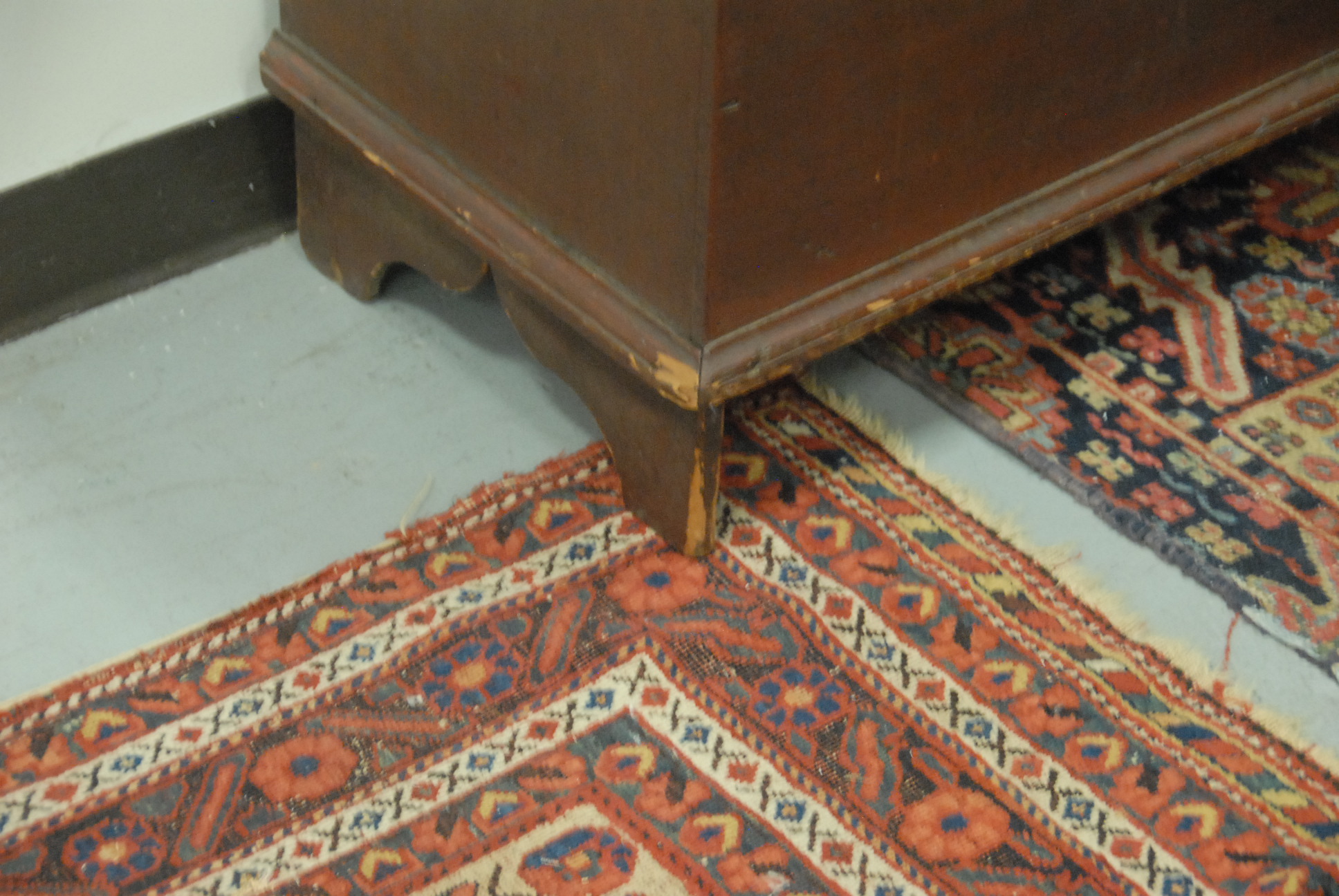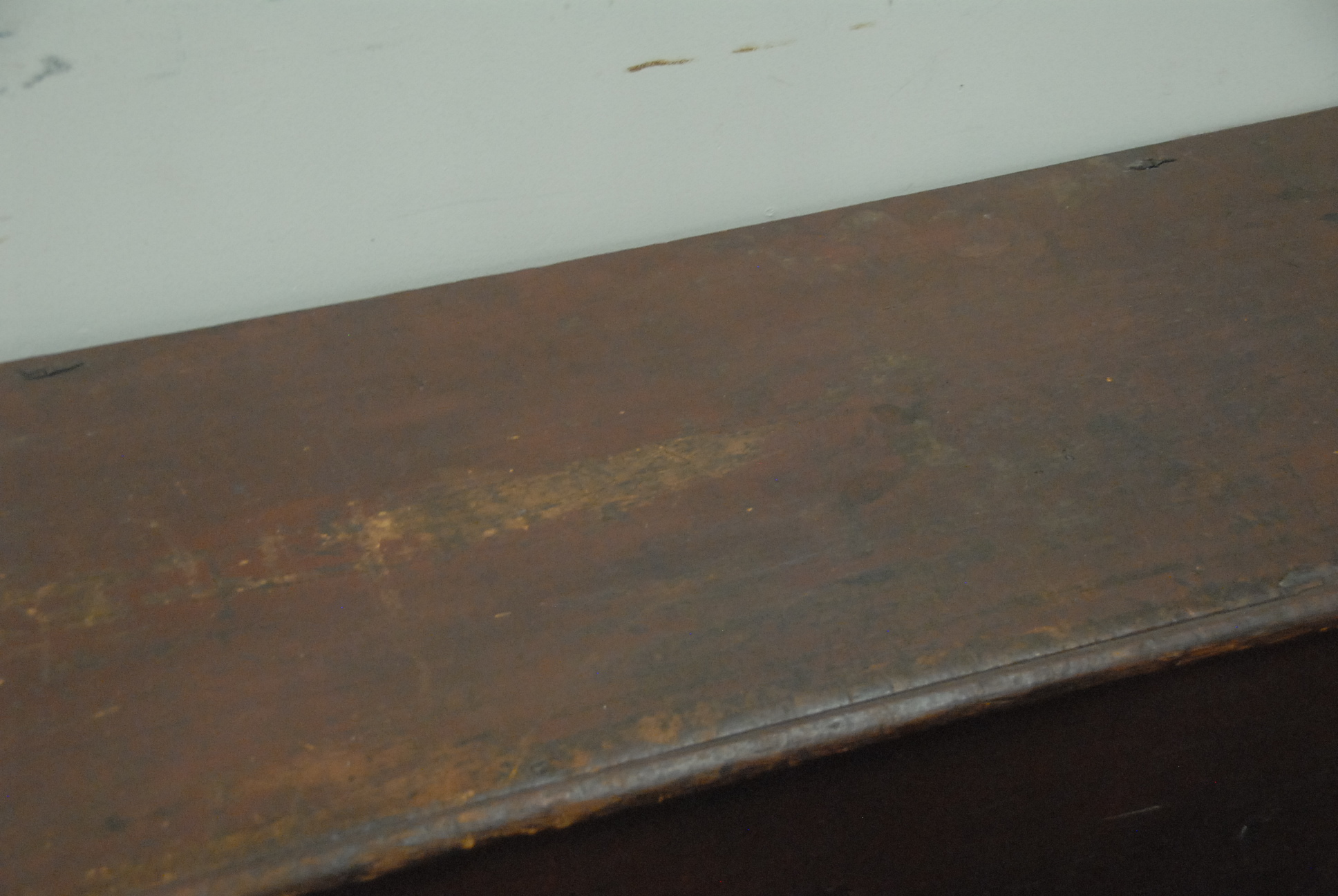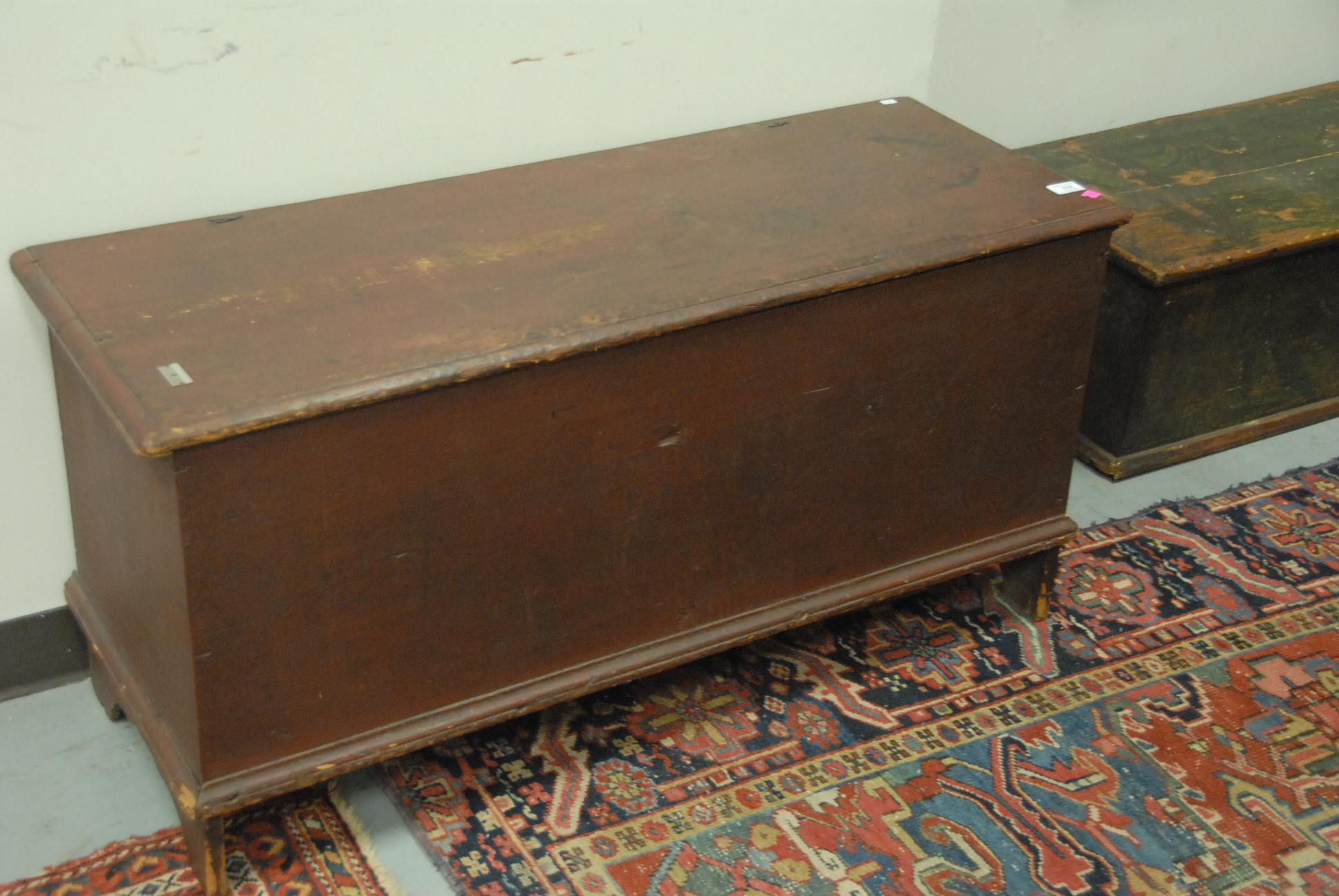 Lot 232: Primitive blanket chest in old red paint with original snipe hinges on boot jack ends. ht. 22 1/2 in. wd. 45 1/2 in.