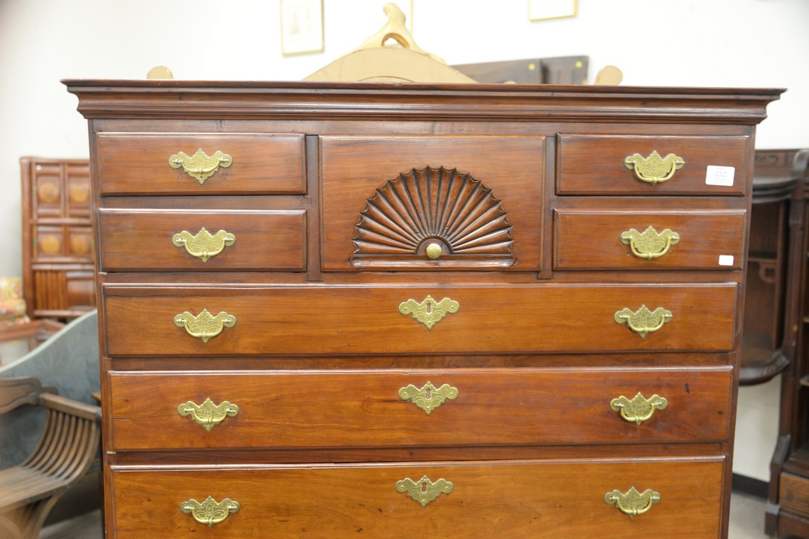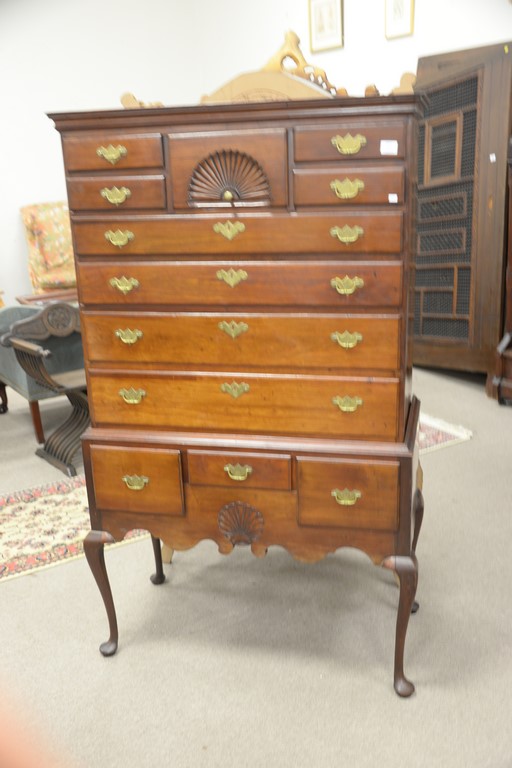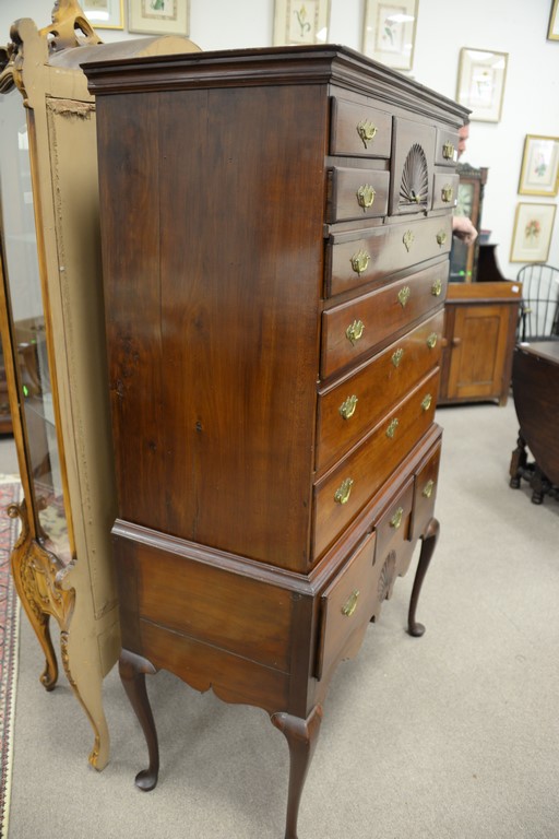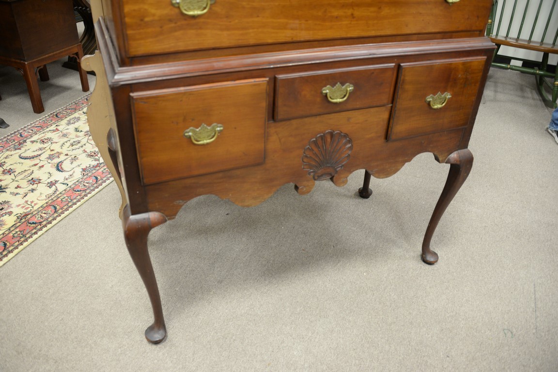 Lot 232: Queen Anne cherry highboy in two parts, 18th century top with lower section made to match. ht. 65in., wd. 38in., dp. 19in.