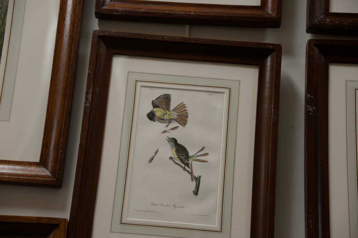 Set of six Audubon prints Drawn from nature by J.J. Audubon printed by J.T. Bowen, Philadelphia hand colored lithographs Arkansa Flycatcher American Redstart Swallow-tailed Flycatcher Blue-grey flycatcher Least Pewee Flycatcher Great Crested Flycatcher, sight size 9 1/2 x 6 Provenance: Property from Credit Suisse’s Americana Collection