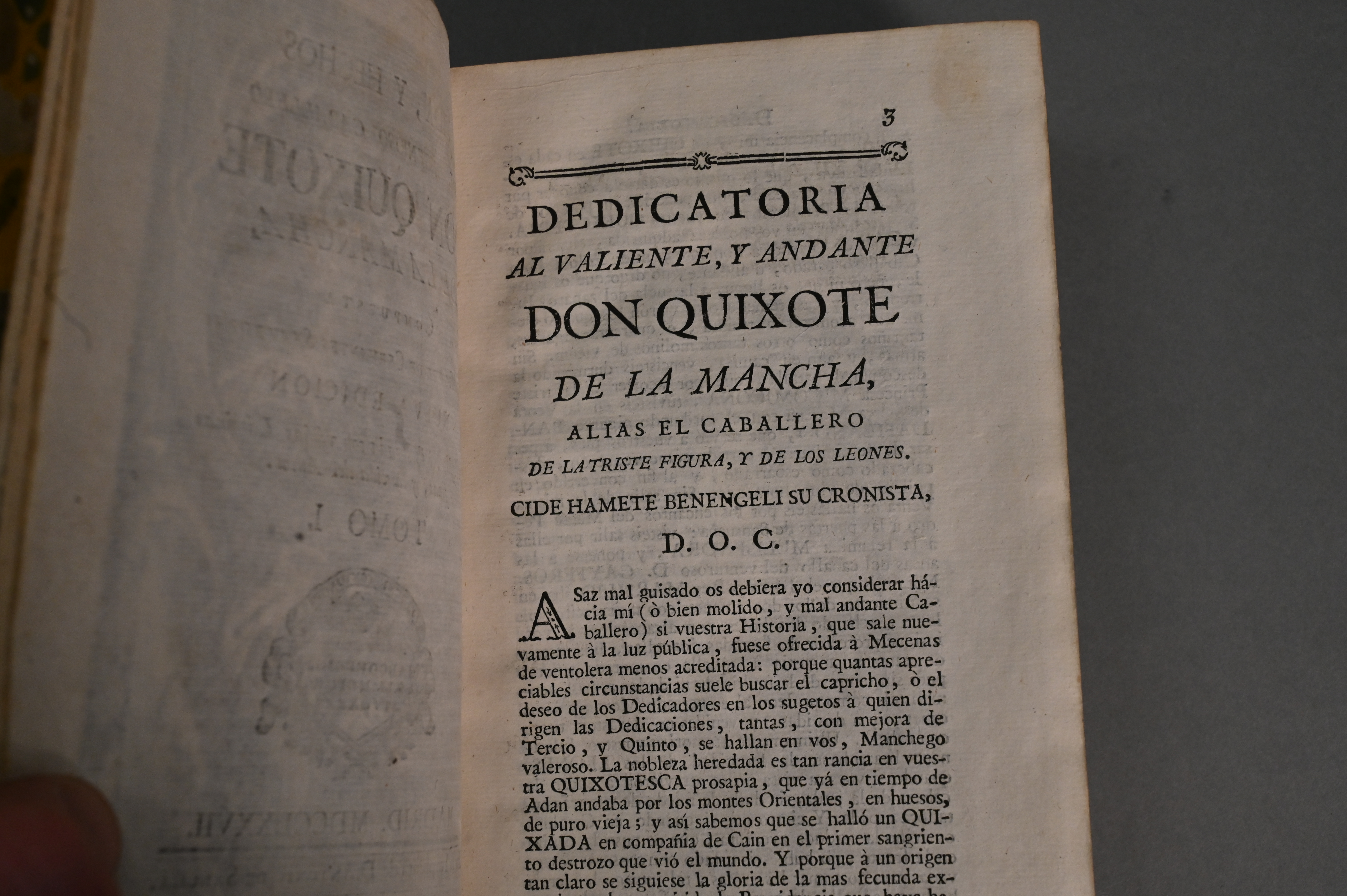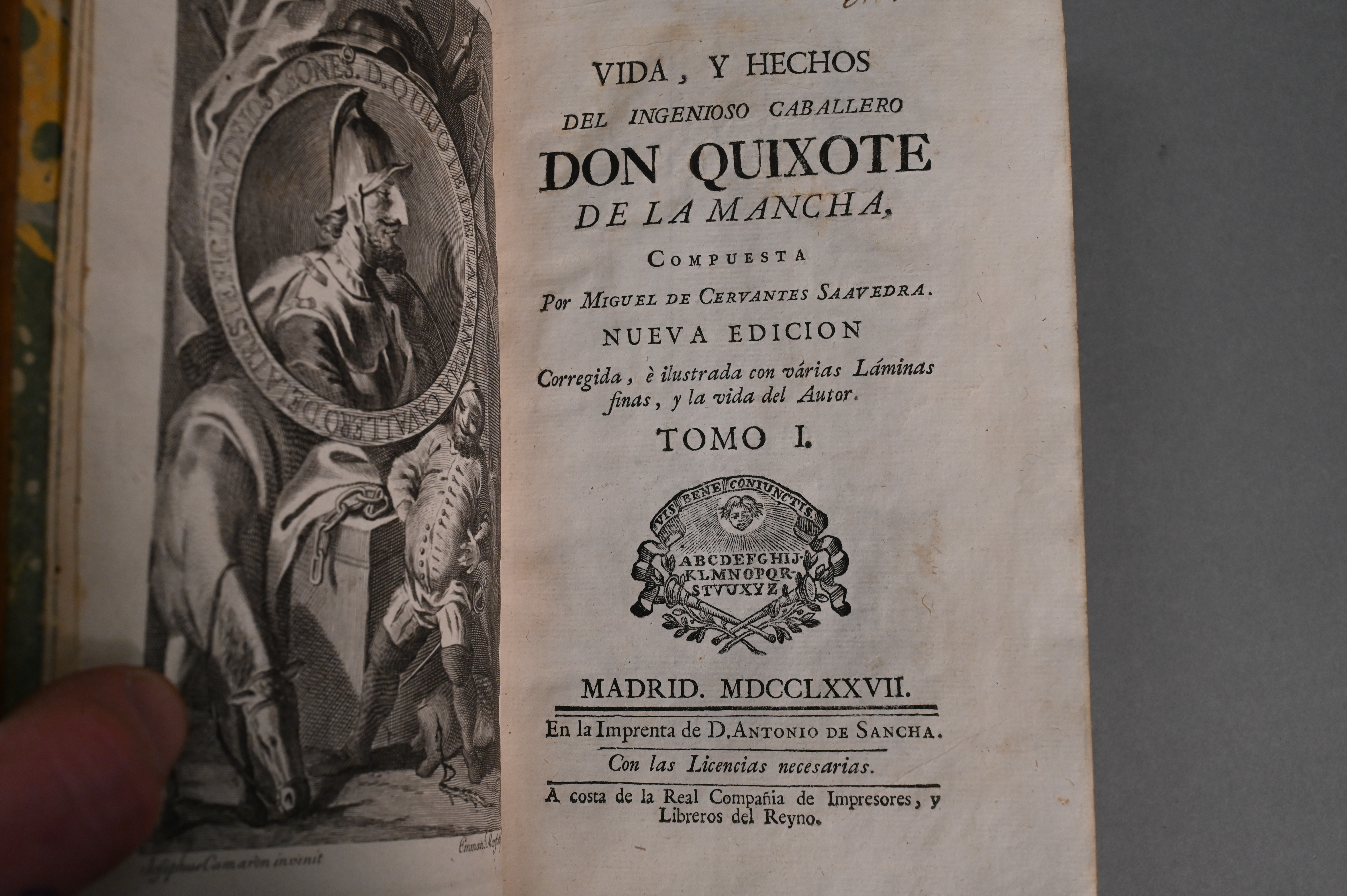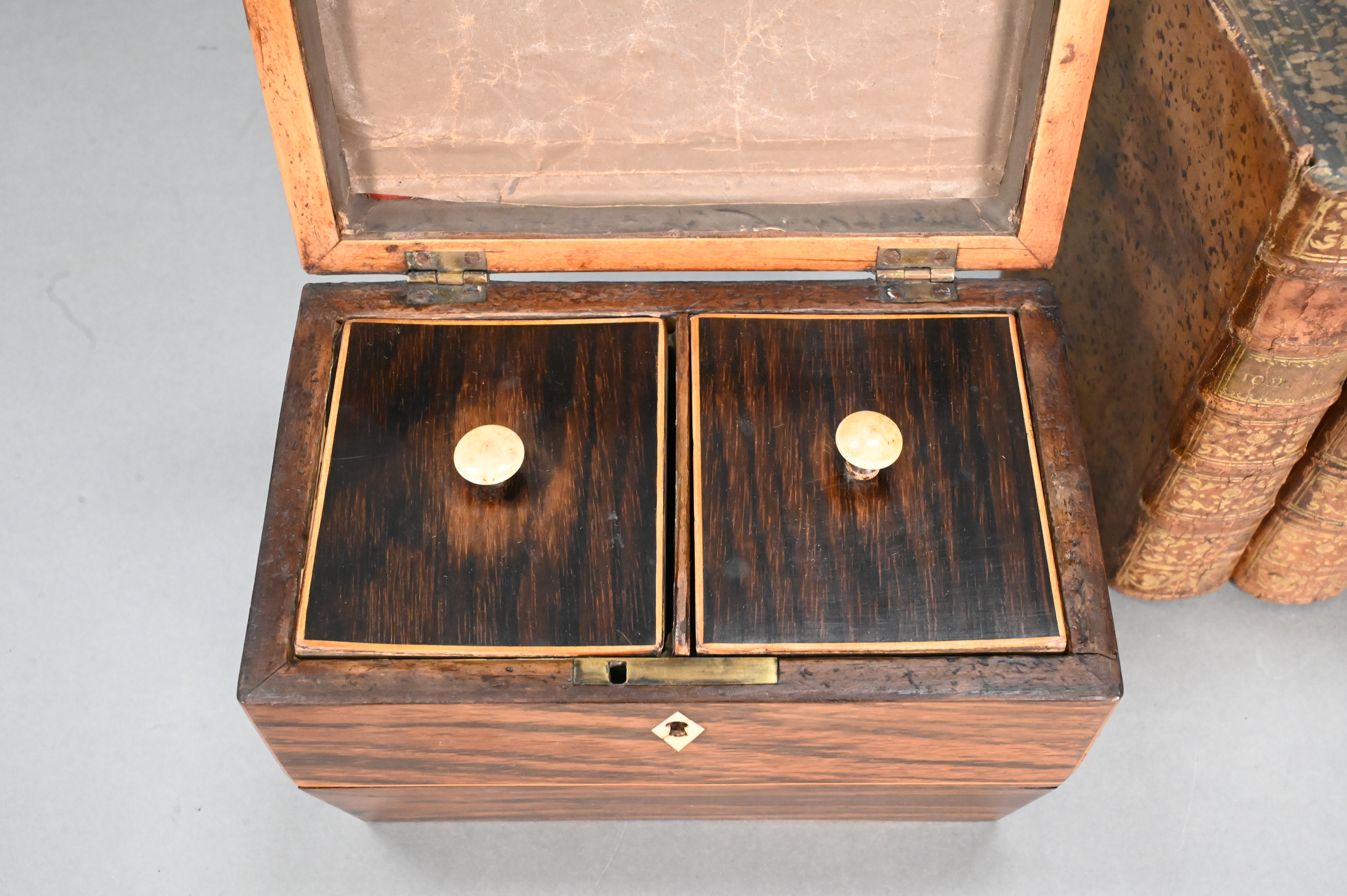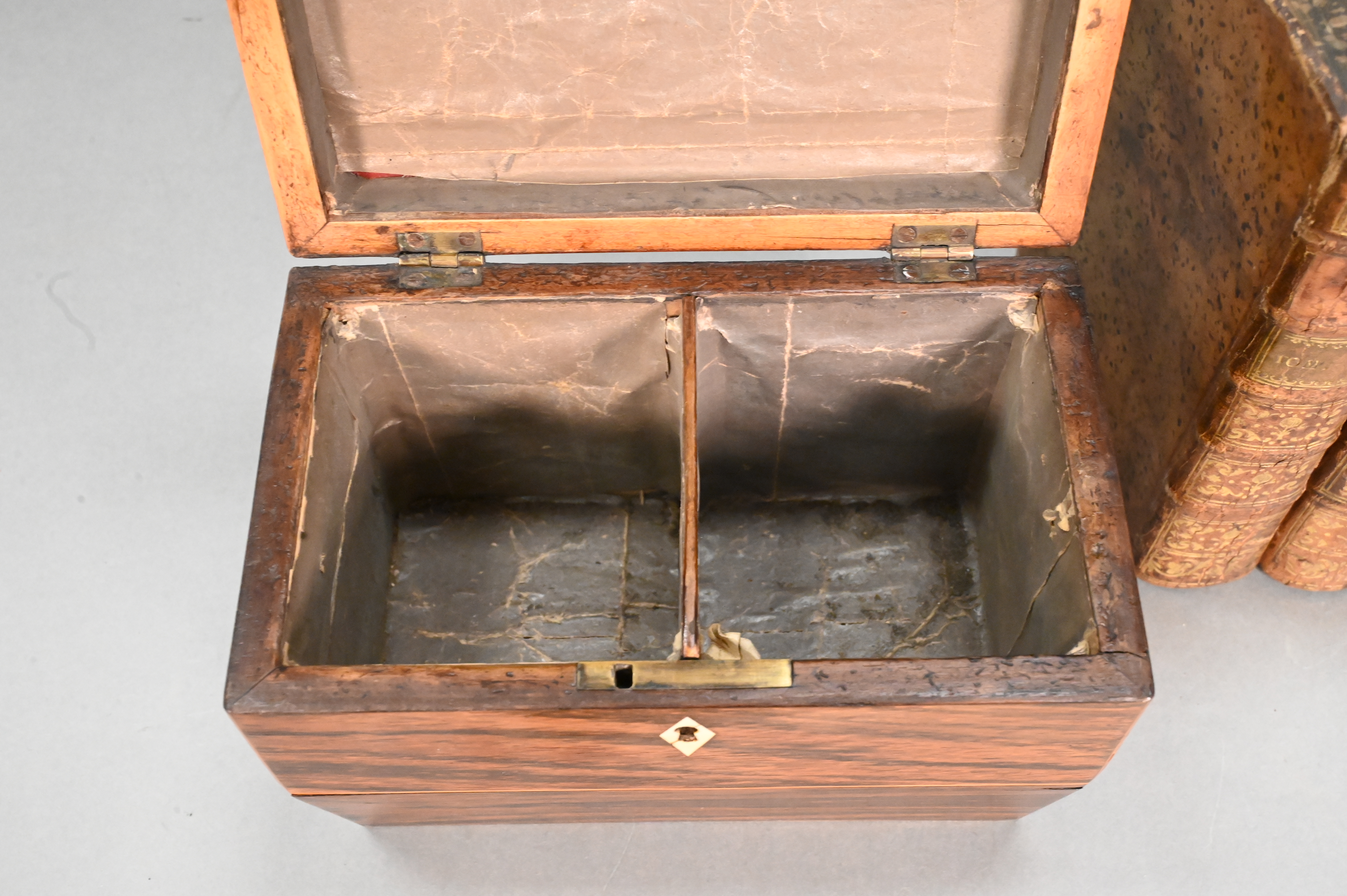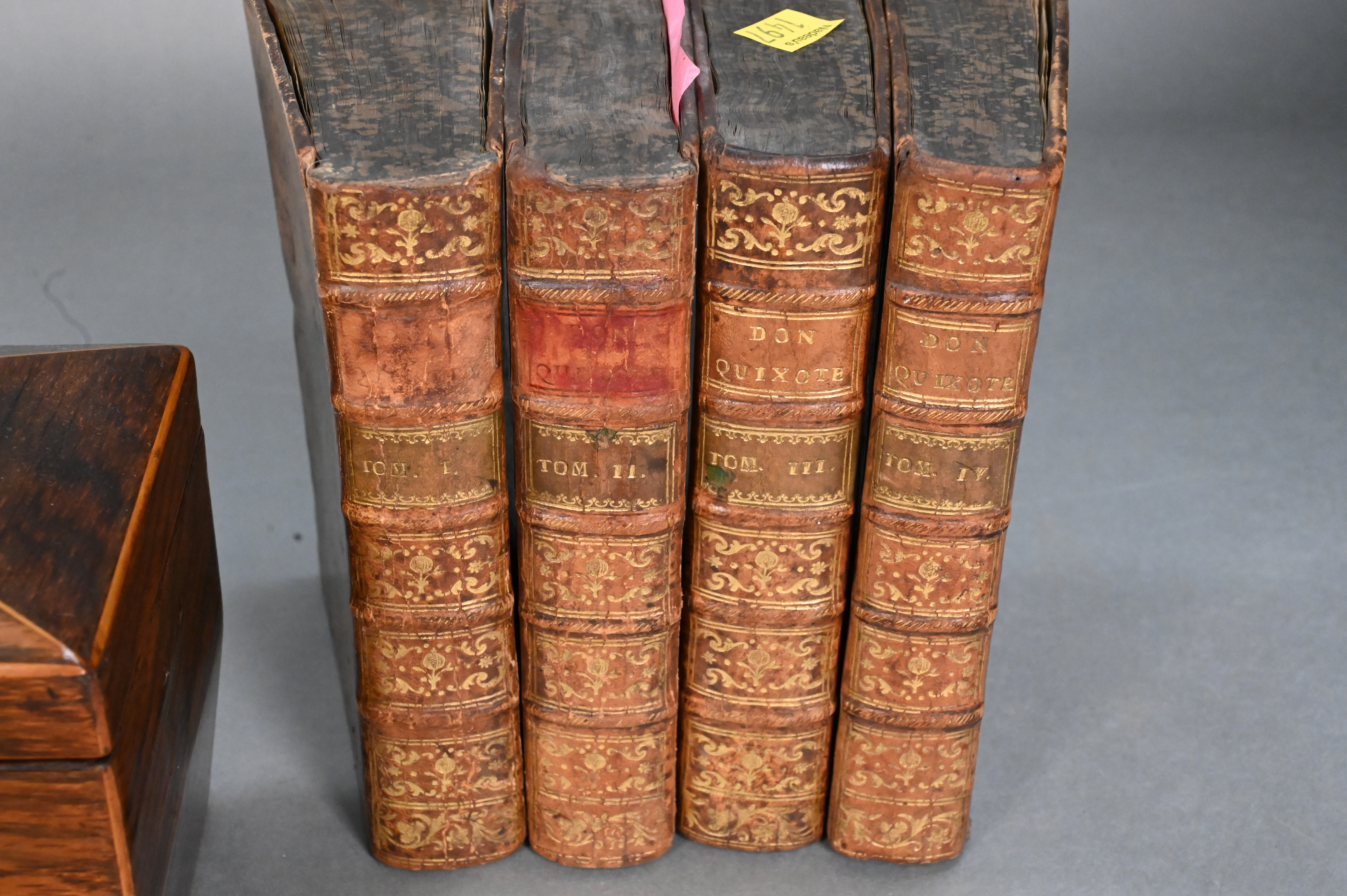 Small Group, to include a rosewood teabox, height 4 1/2 inches, width 8 inches, along with a set of four Don Quixote leather bound books, copyright 1776.