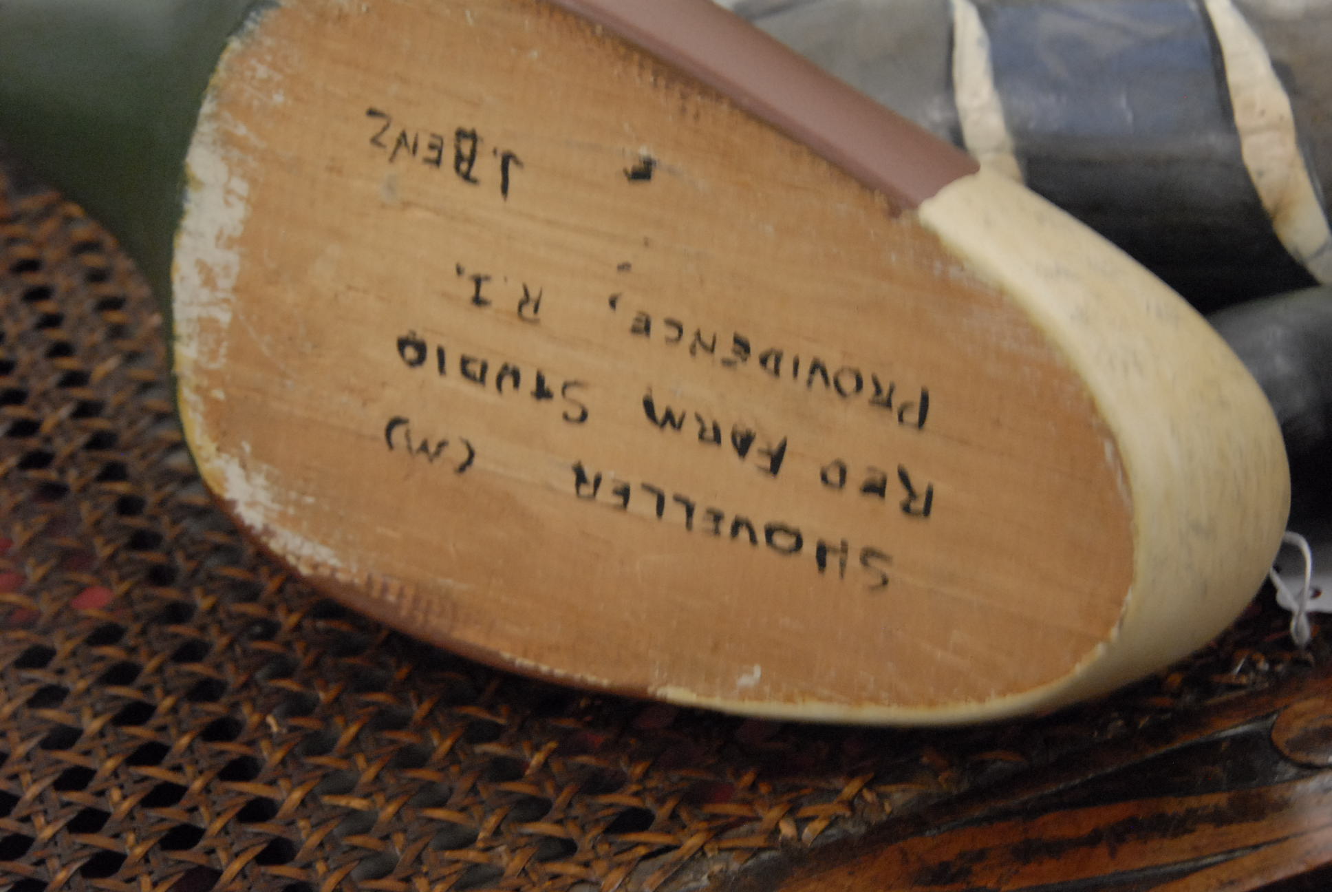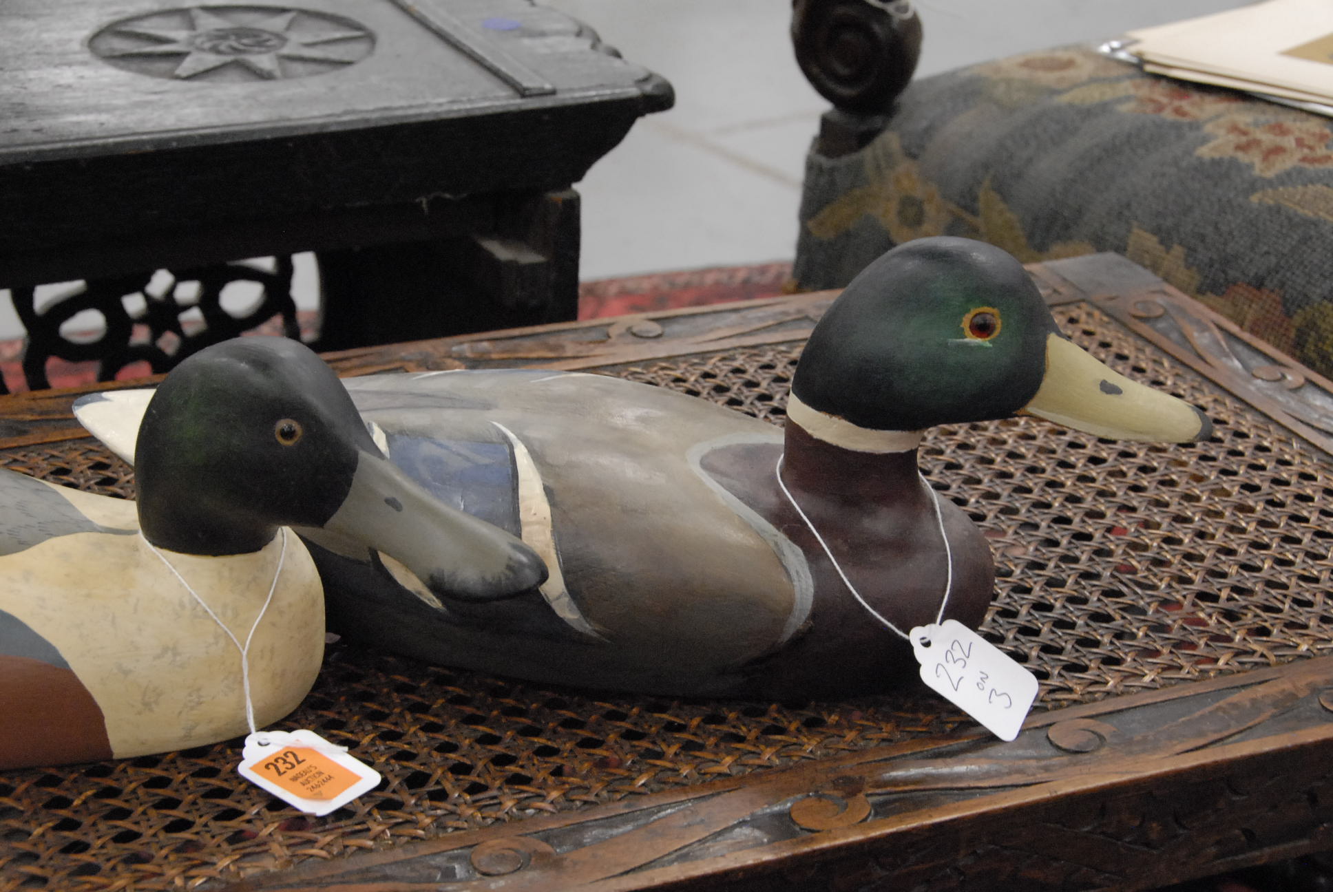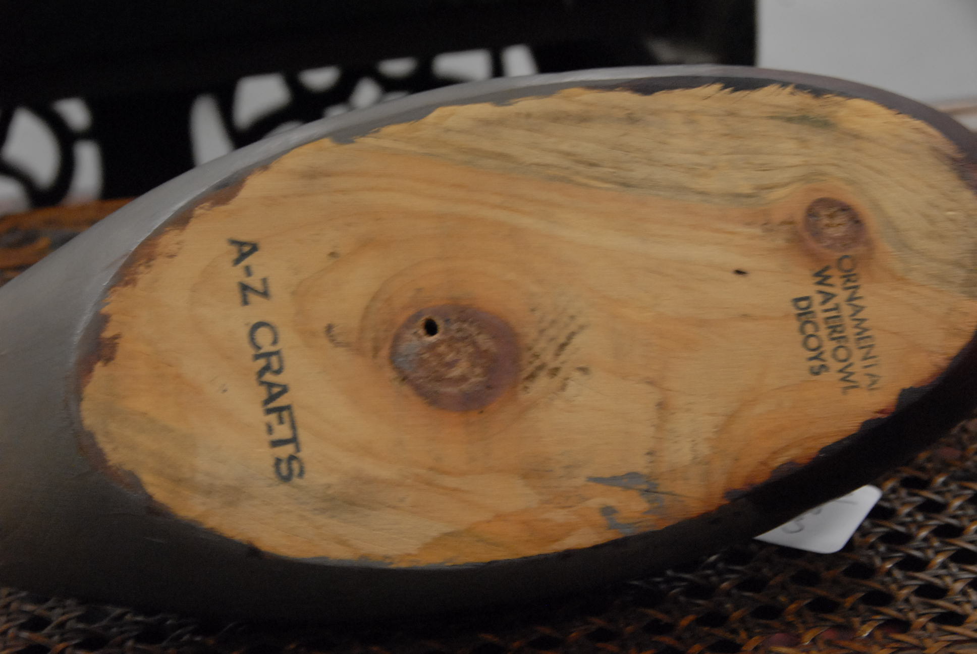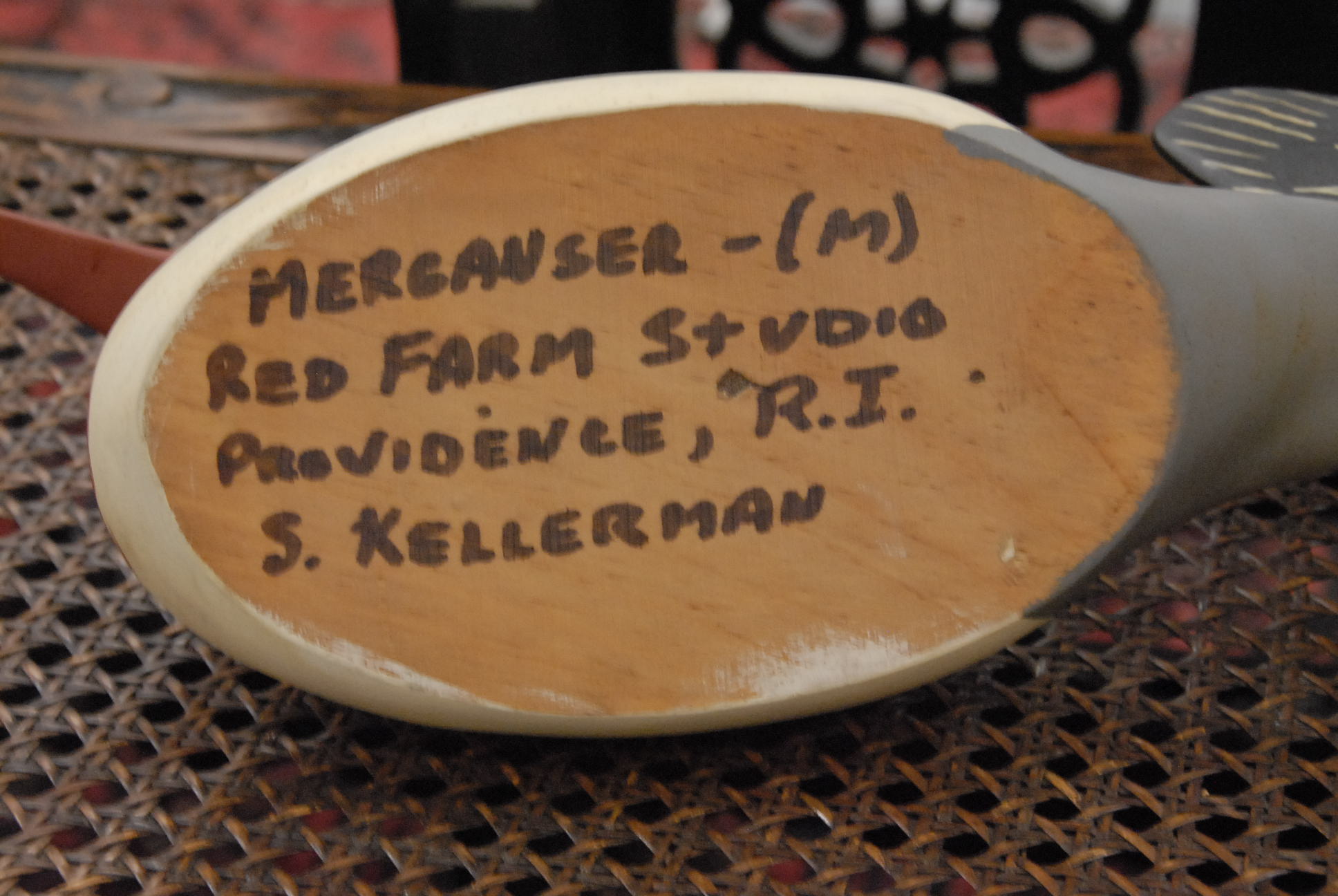 Three contemporary duck decoys a shoveler Redfarms Studios, Vermont signed Bens , A Merganser, Redfarms Studios signed Kellerman and one ornamental waterfall decoys labeled AZ Crafts