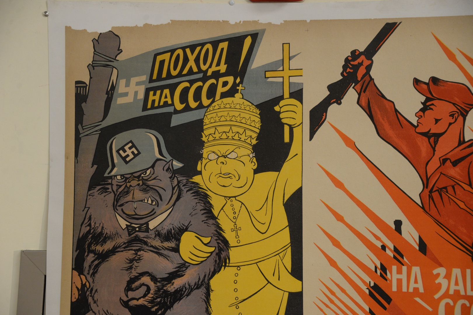Lot 232: Two Piece Group of WWII Russian Propaganda Posters, each laid down, one signed ‘Dehn’ in plate.