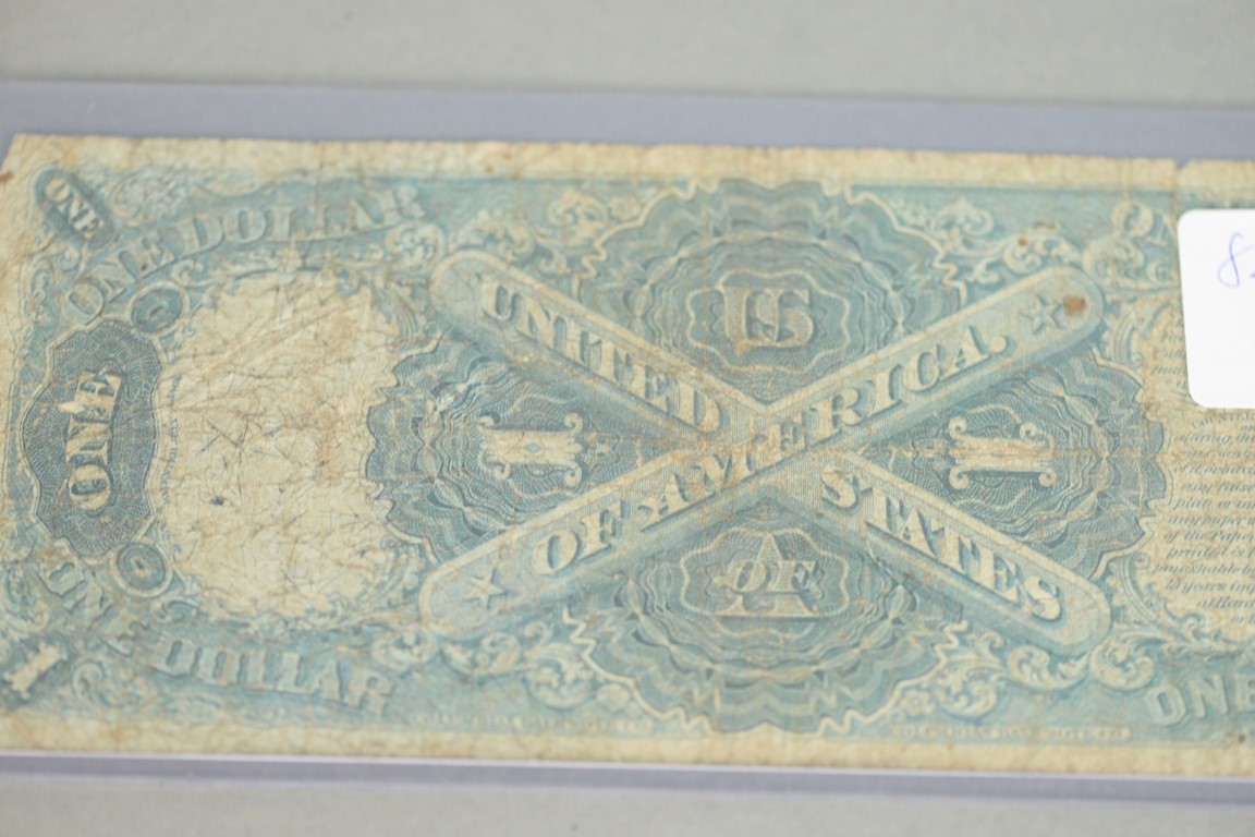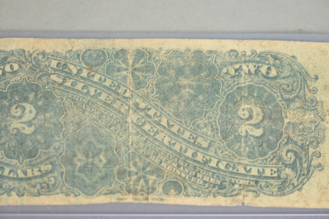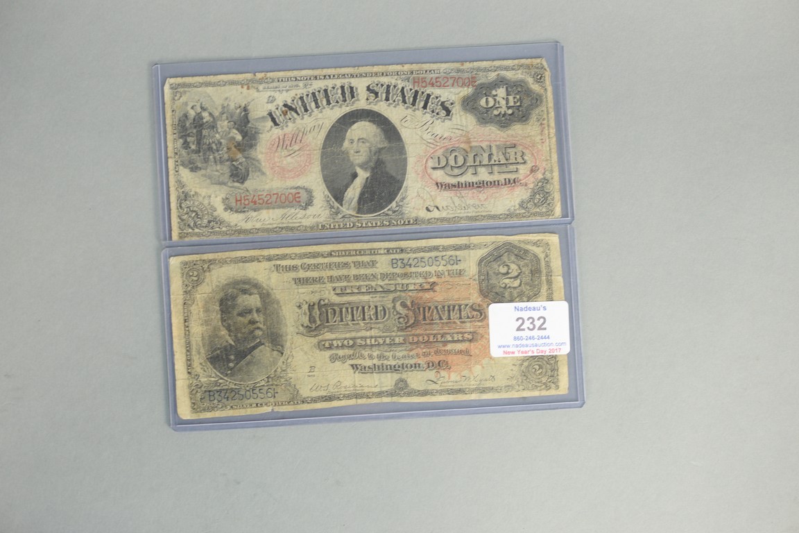 Lot 232: Two piece lot to include one dollar US note signed Allison illegible writing and two dollar silver certificate signed Rosecrans Hy…