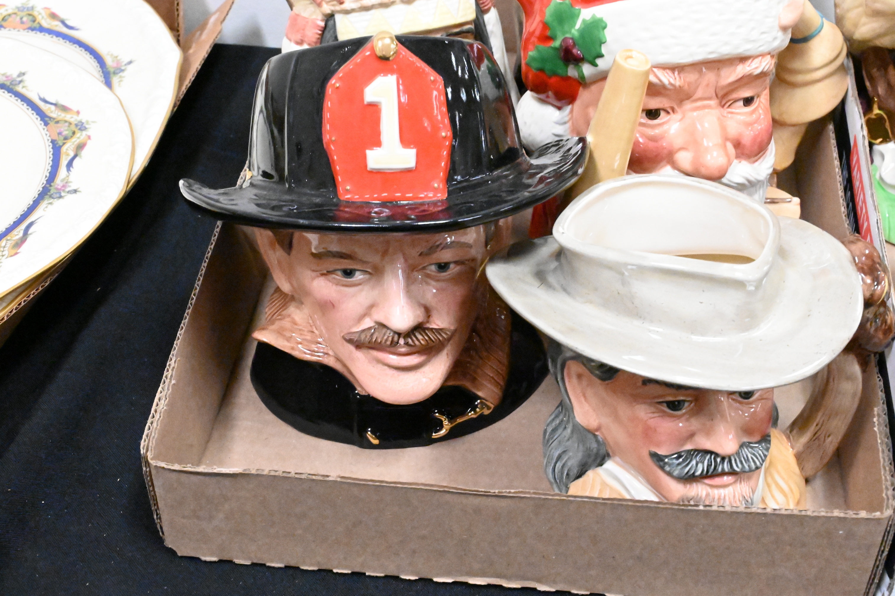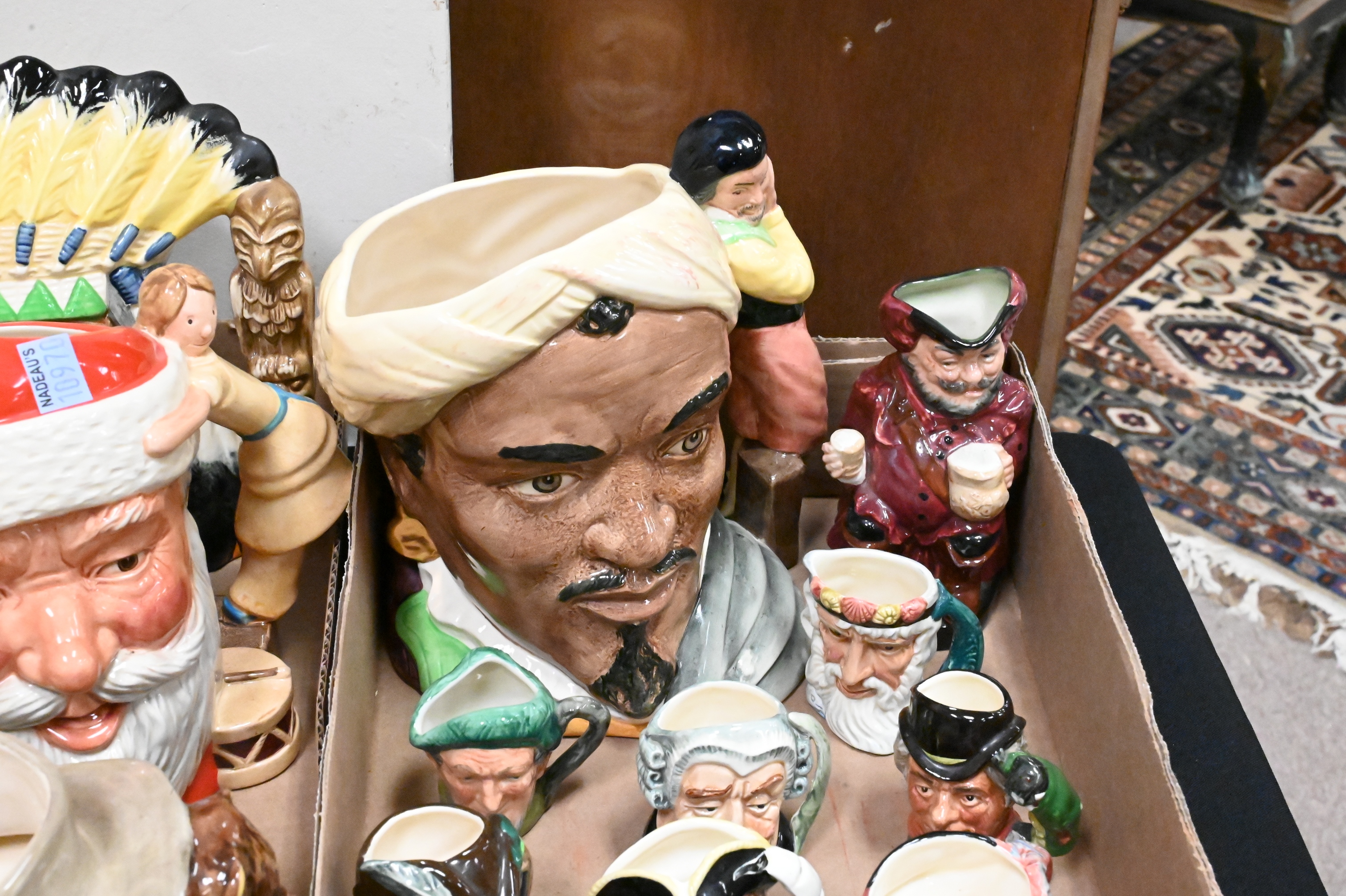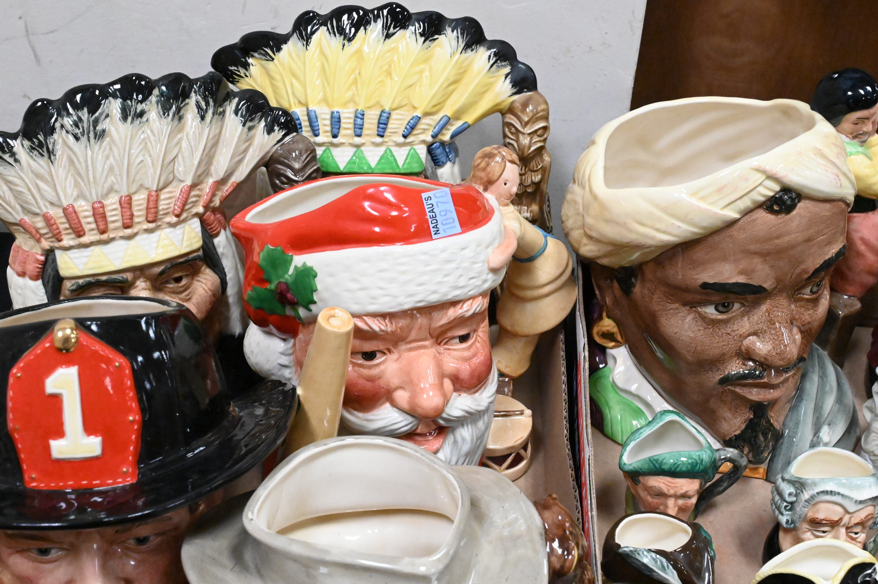 two American Indian Toby Jug D 6786, Othello D 6673, The Fireman D 6697, along with ten miniature character pitchers including, The Lawyer, Neptune, Falstaff, The Walrus and Carpenter, Old Charley Character, Captain Morgan, Robin Hood