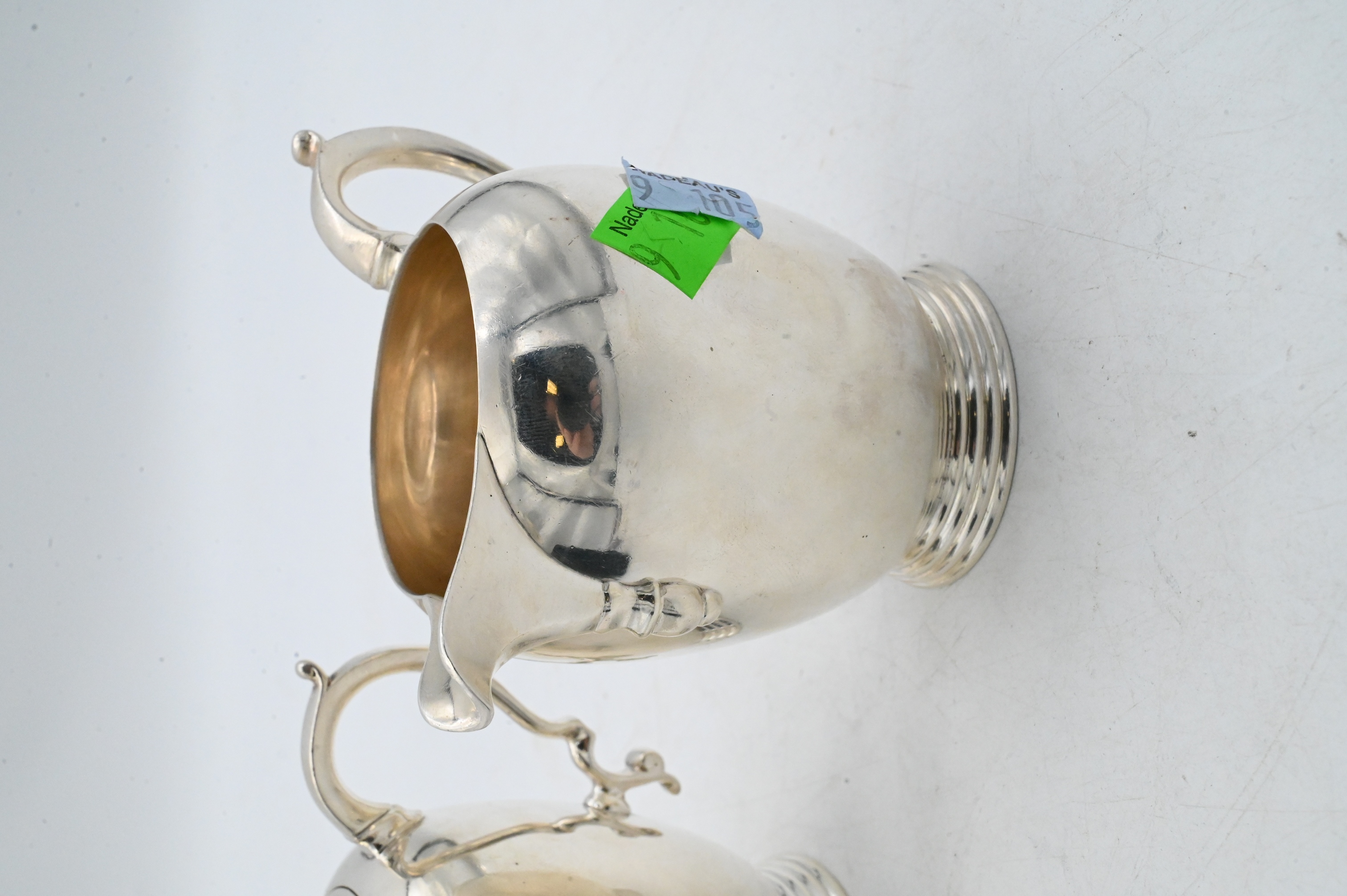 Matching baluster-form creamer and covered sugar bowl with scrolled handles and reeded circular foot rims. Both stamped Sterling.