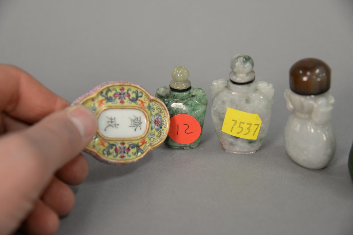 Lot 233: Chinese group to include four hardstone snuff bottles, hardstone green carved Buddha pendant, and a porcelain plaque. snuff bottles …