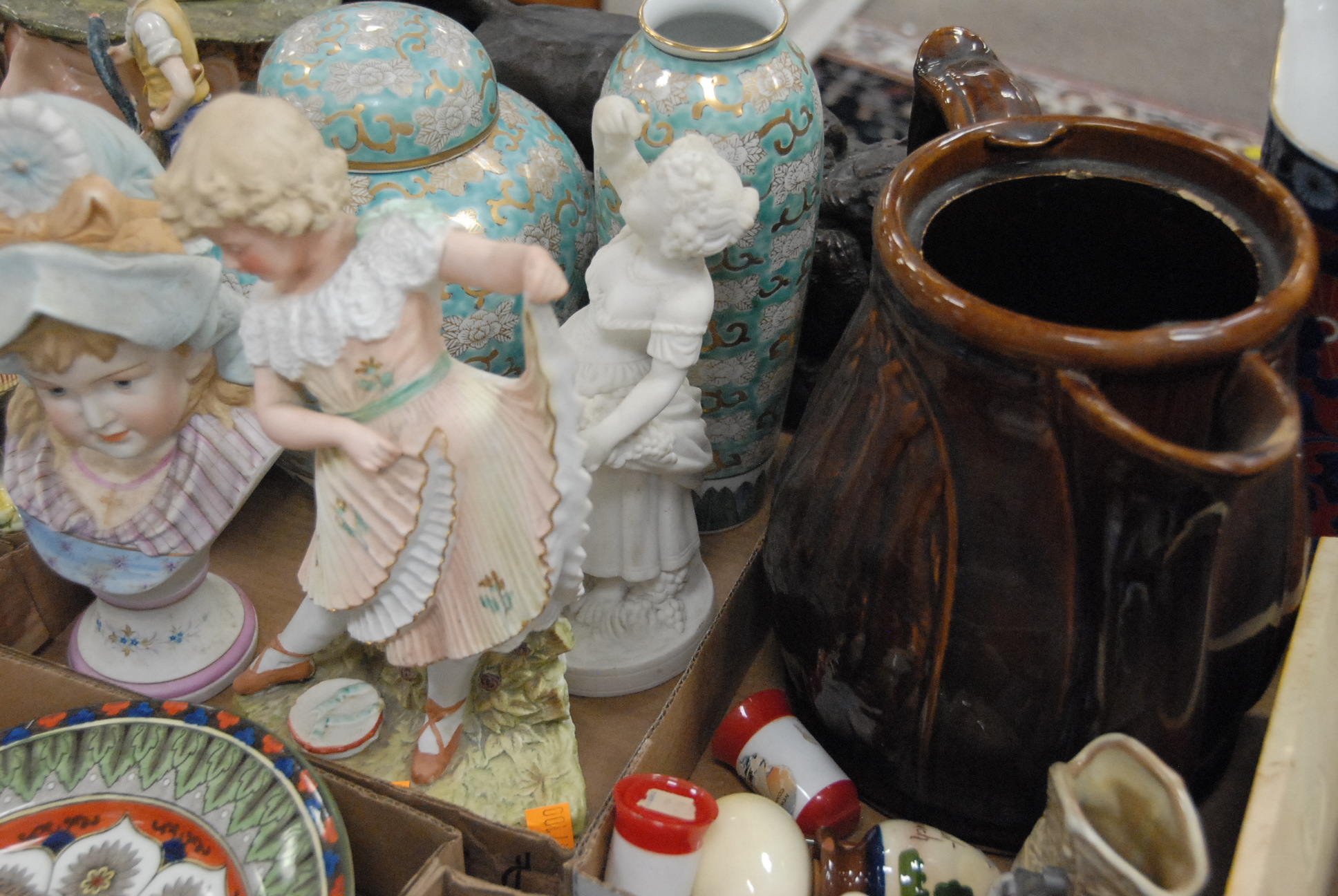 Four box lots with three Bisque figures one Heubach, two Shibui pieces, plates, pitcher, etc.