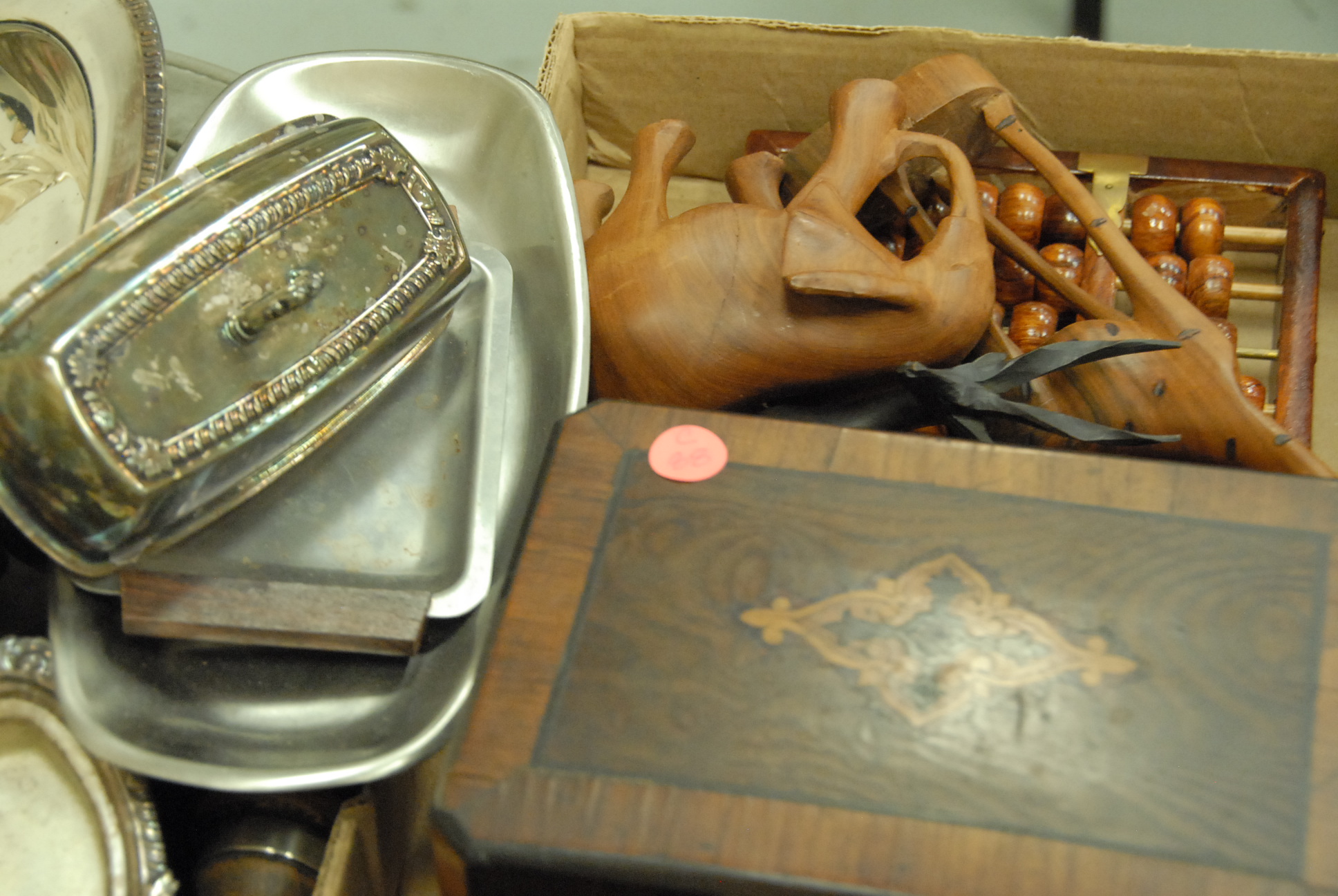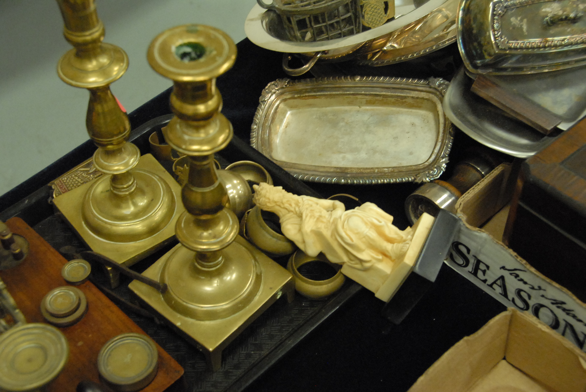 Group lot to include a small brass scale, pair of brass candlesticks, an inlaid wooden box, two pewter chargers one marked Compton, carved wooden animals, miscellaneous silver plate, napkin rings.