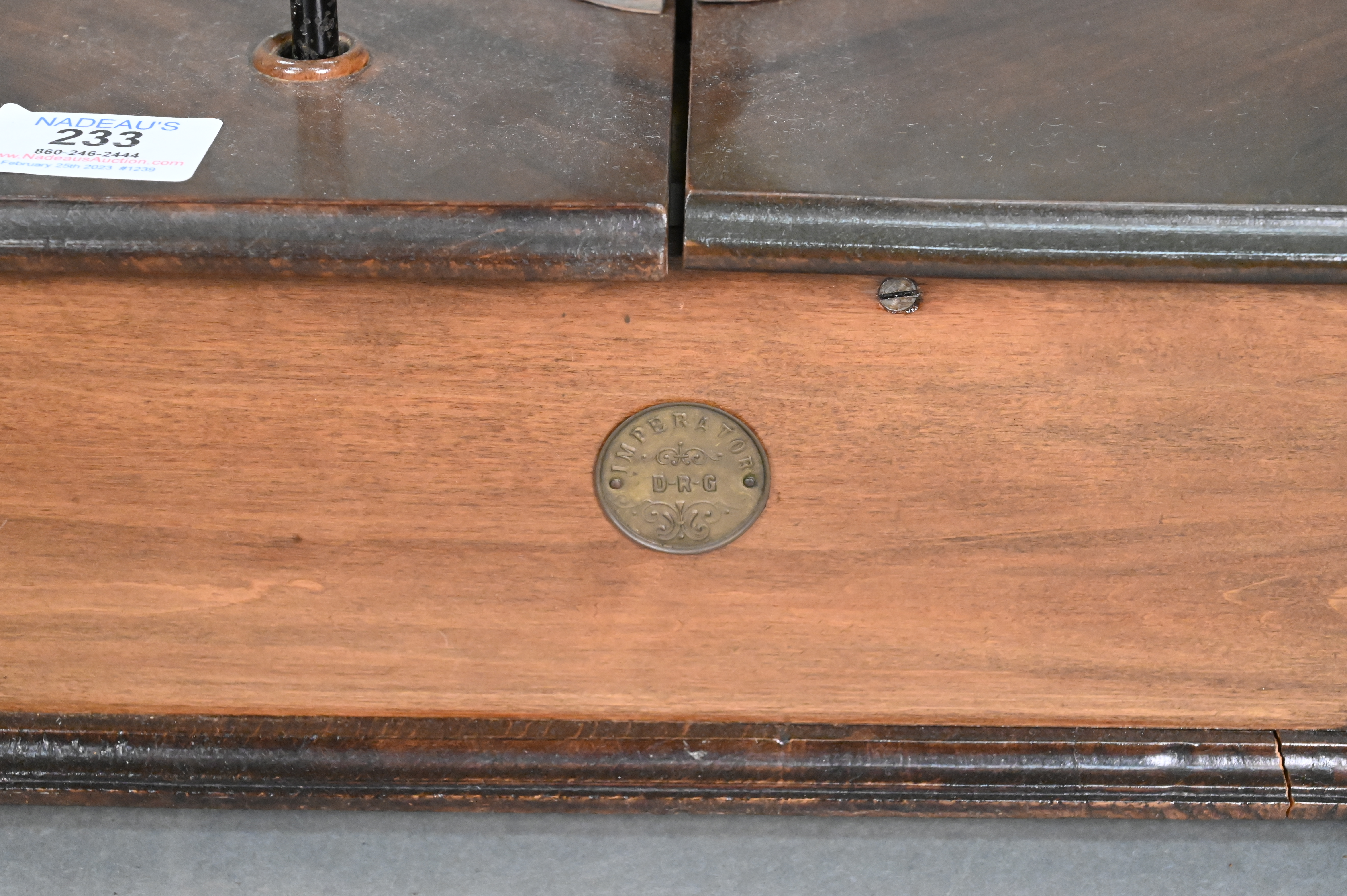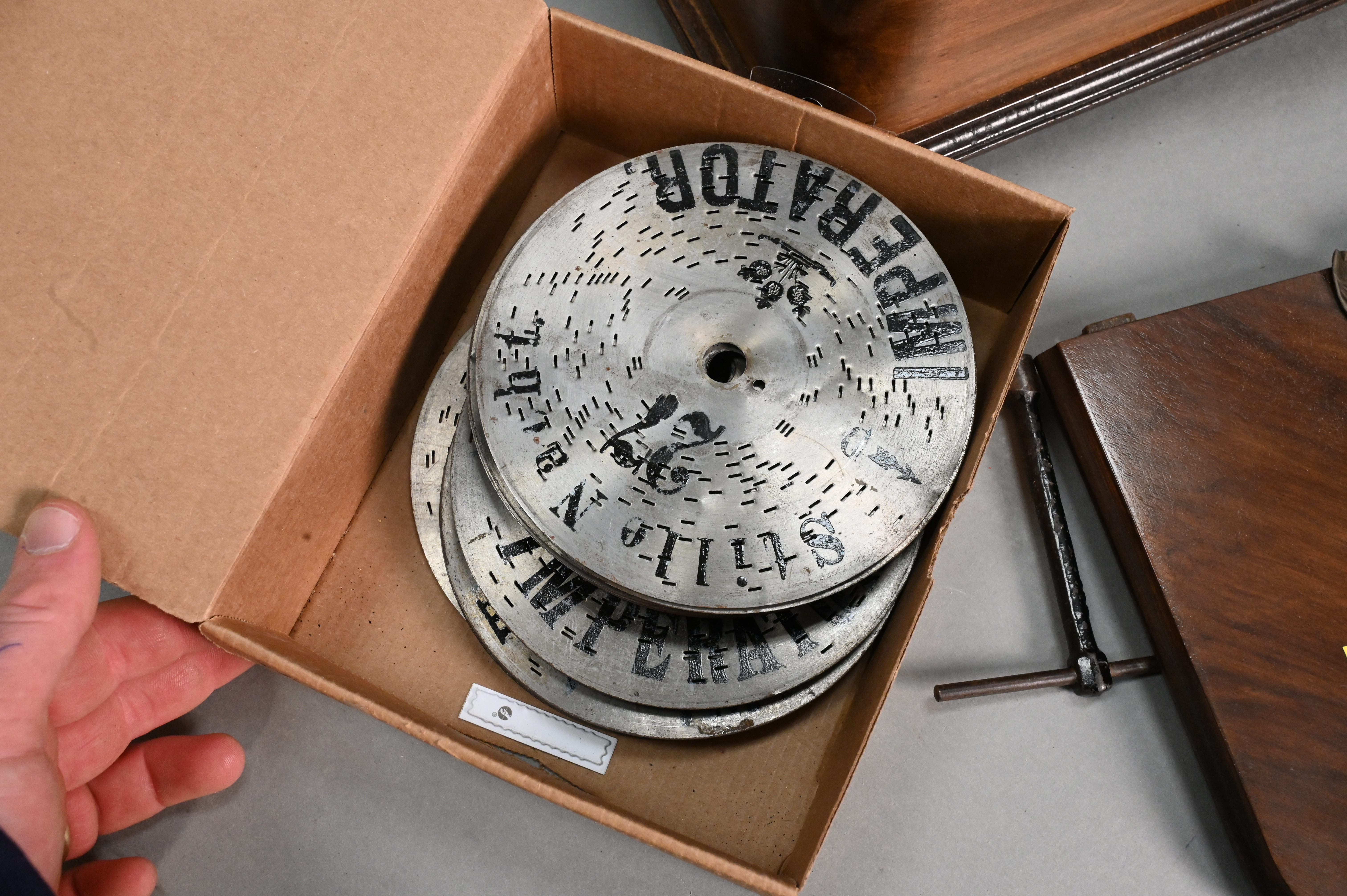 Kalliope Disc Music Player Box, along with iron Christmas tree stand, length 14 3/4 inches.