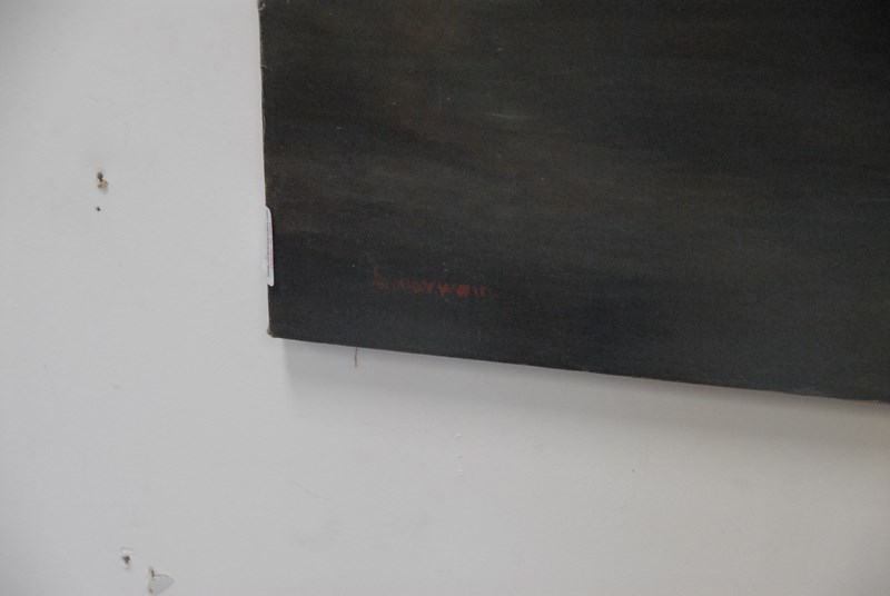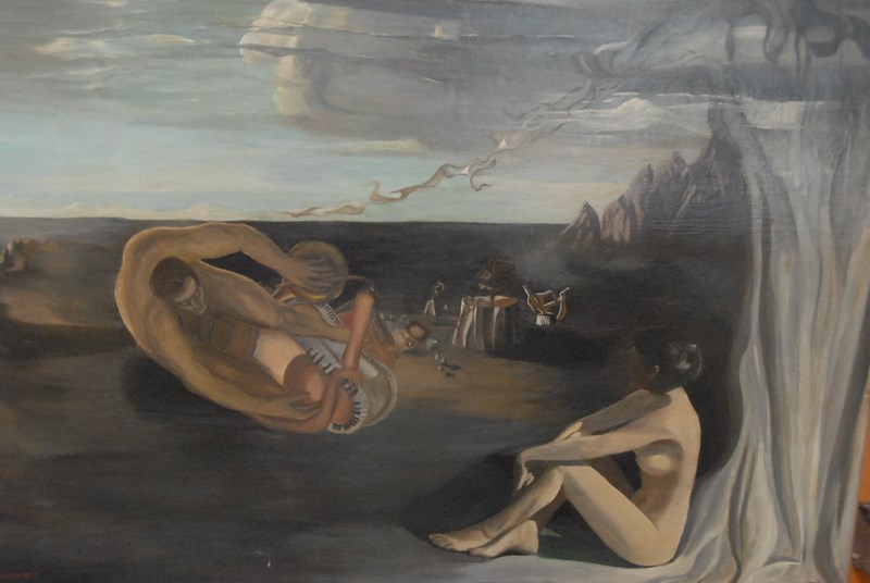 Oil on canvas whimsical landscape with nudes signed lower right Sauerwein, 31 x 40.