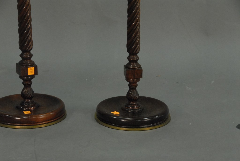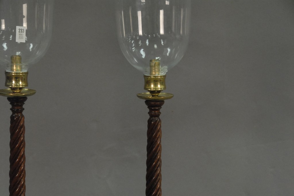 Pair of brass trimmed wood candlesticks with clear glass hurricane style shades, ht. 35in.