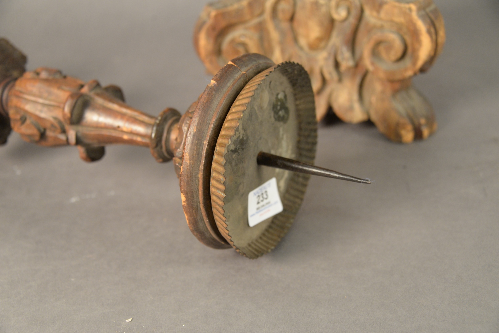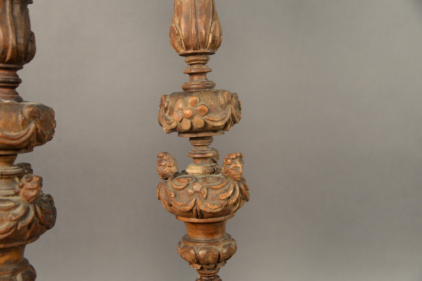 Lot 233: Pair of Italian Carved Wood Pickets, having three carved heads on each, height 32 1/2 inches, width 8 inches.