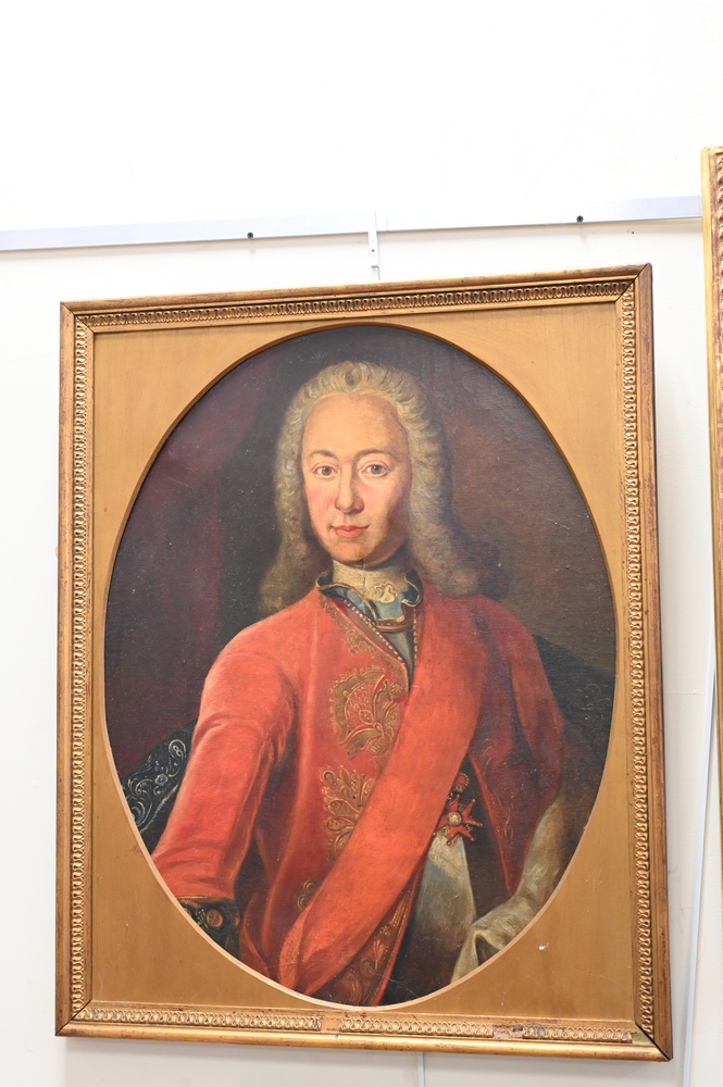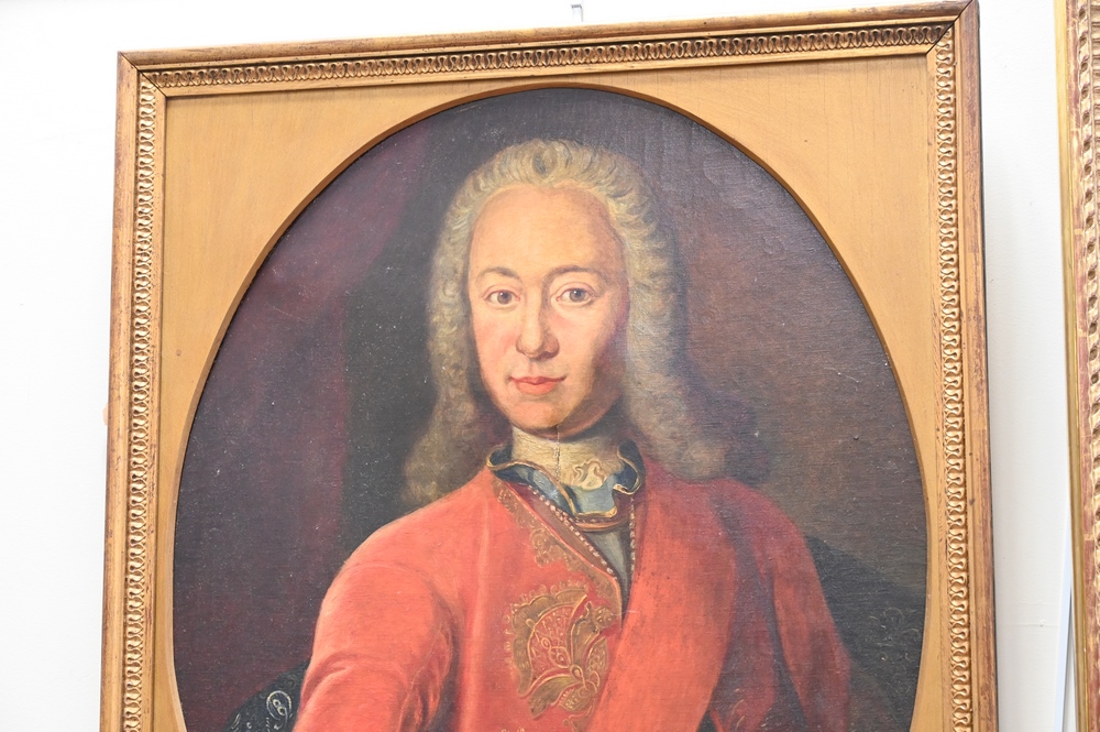 Lot 233: Pair of Portrait Paintings, oils on canvas, to include gentleman with red coat; along with a woman wearing white dress; 30″ x 24″.