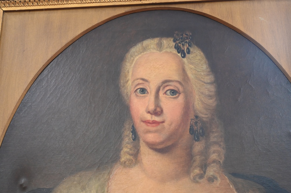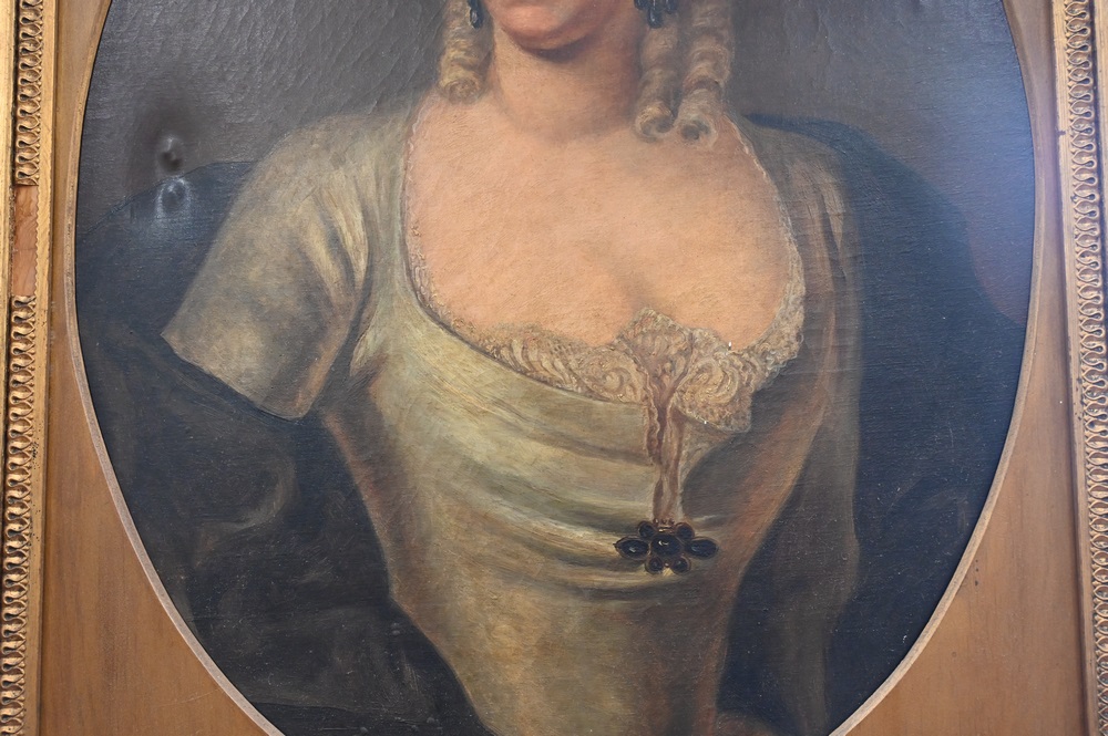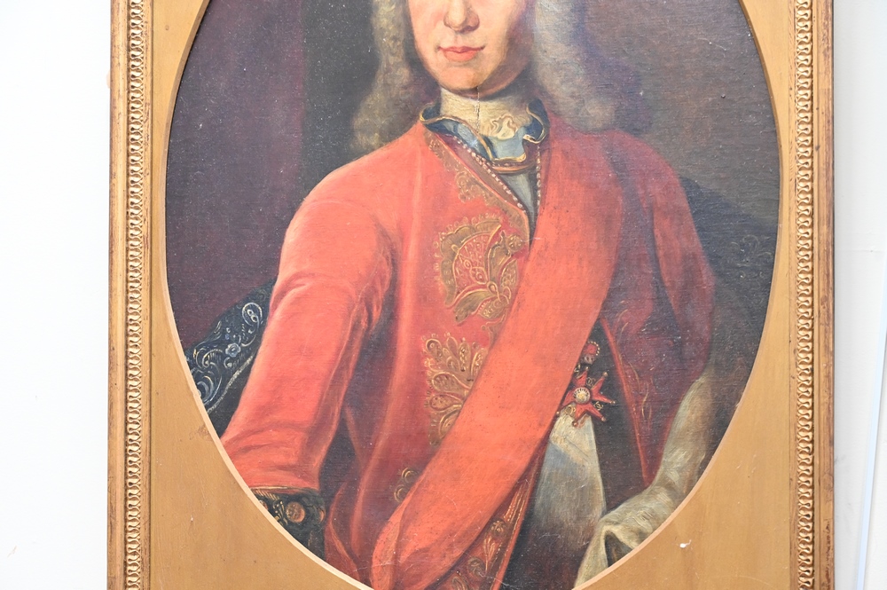 Pair of Portrait Paintings, oils on canvas, to include gentleman with red coat; along with a woman wearing white dress; 30″ x 24″.