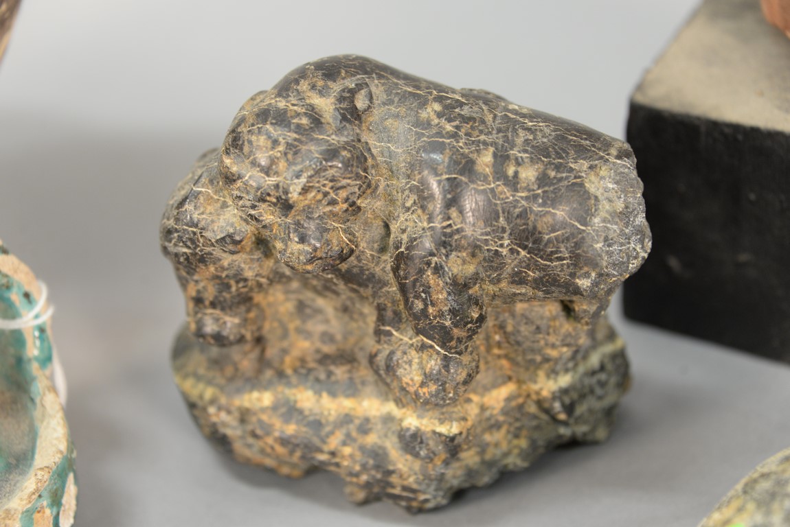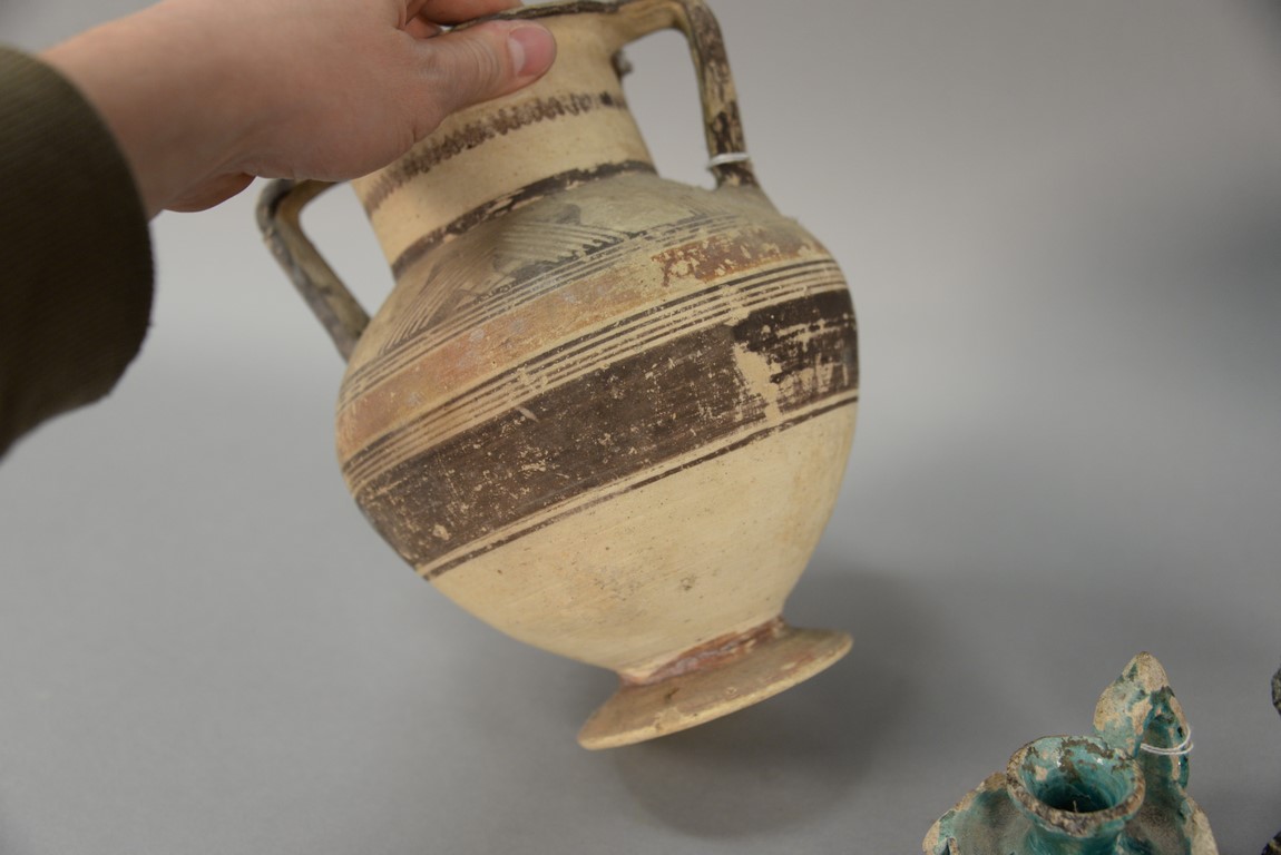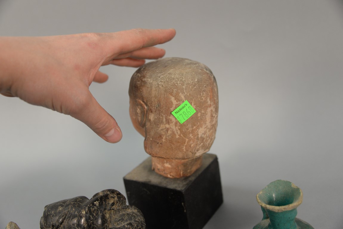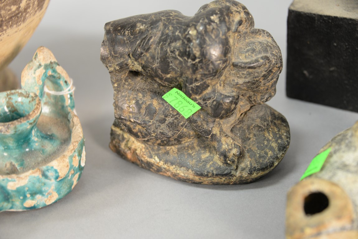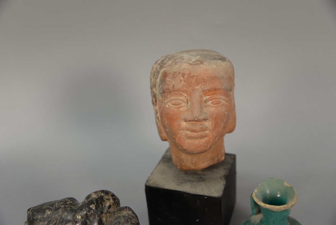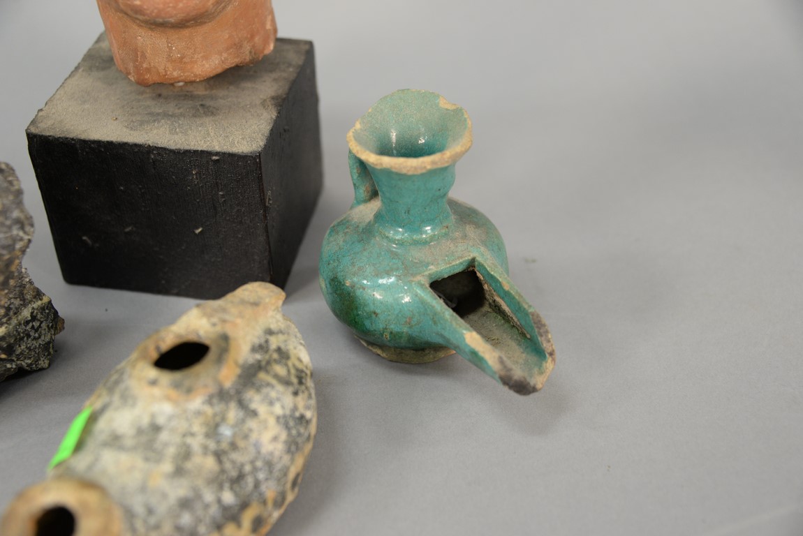 Six piece antiquity lot to include earthenware head, two handled pot, painted with geometric designs, three oil lamps two are blue glazed, and stone carving of a lion attacking an ox. ht. of head 5in. ht. of pot 9 1/2in.