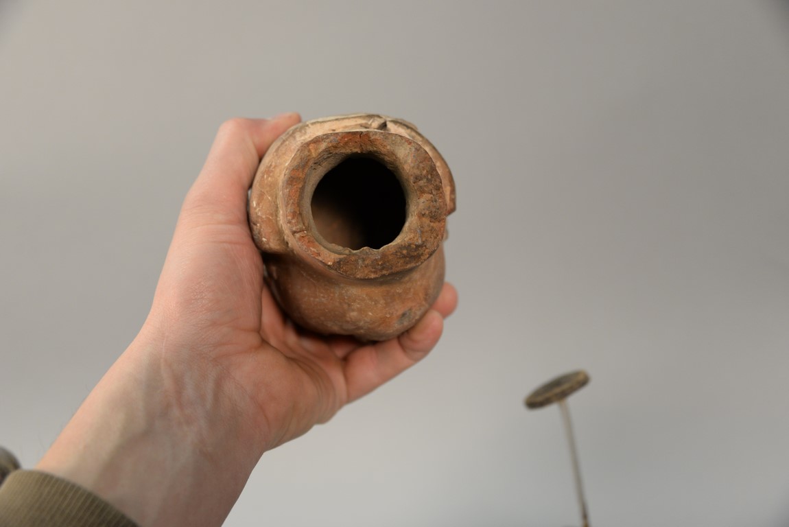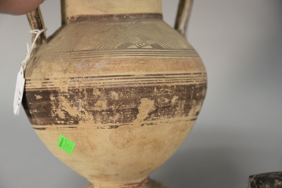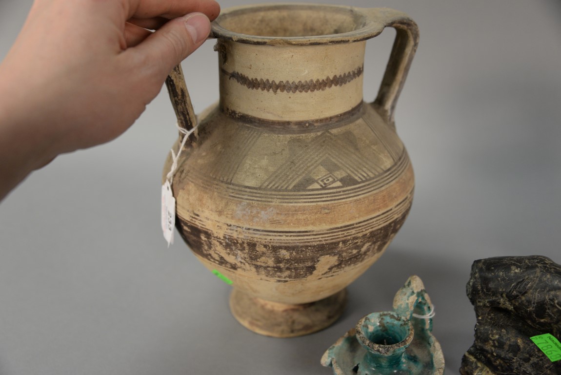 Lot 233: Six piece antiquity lot to include earthenware head, two handled pot, painted with geometric designs, three oil lamps two are blue …