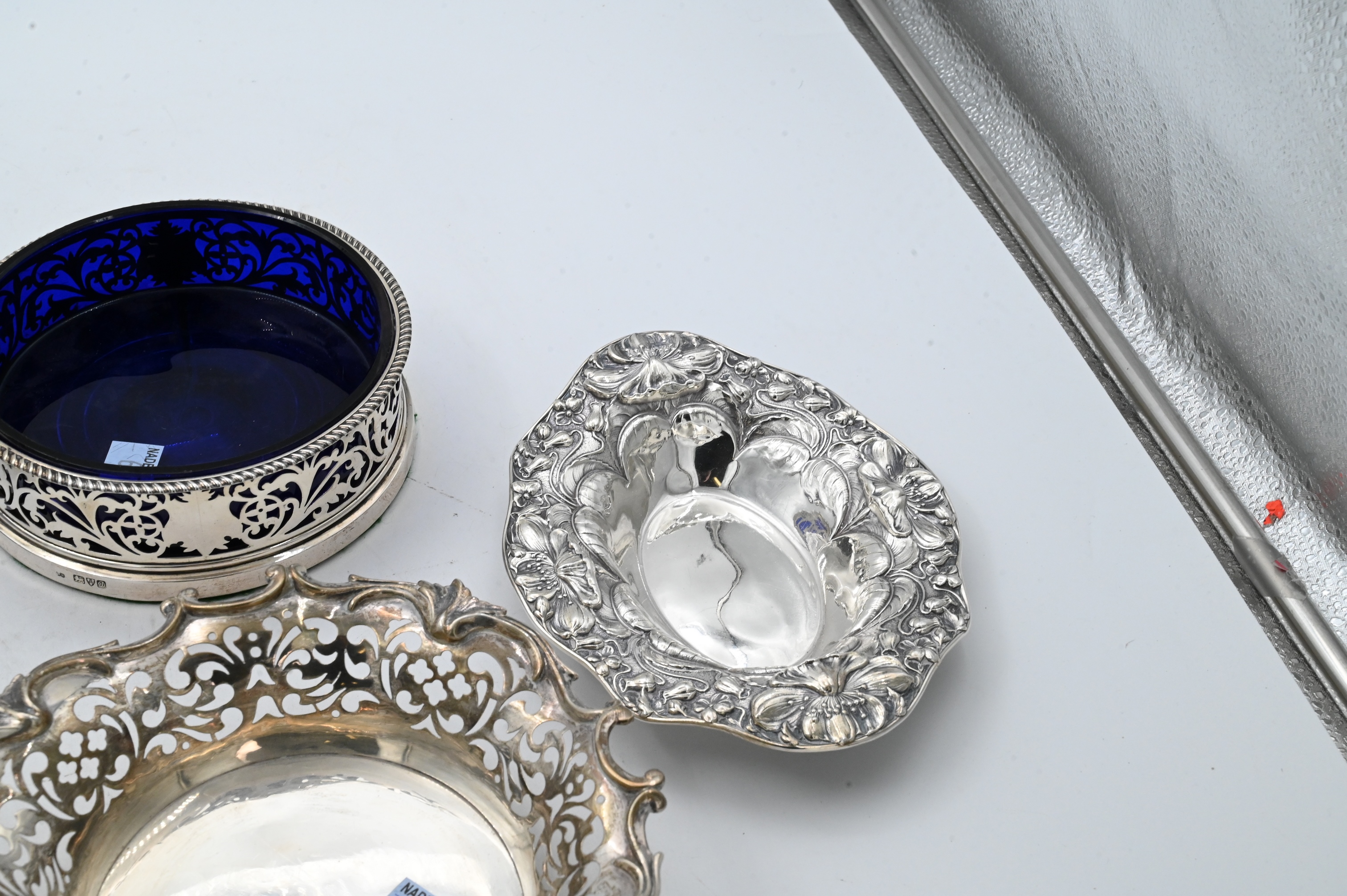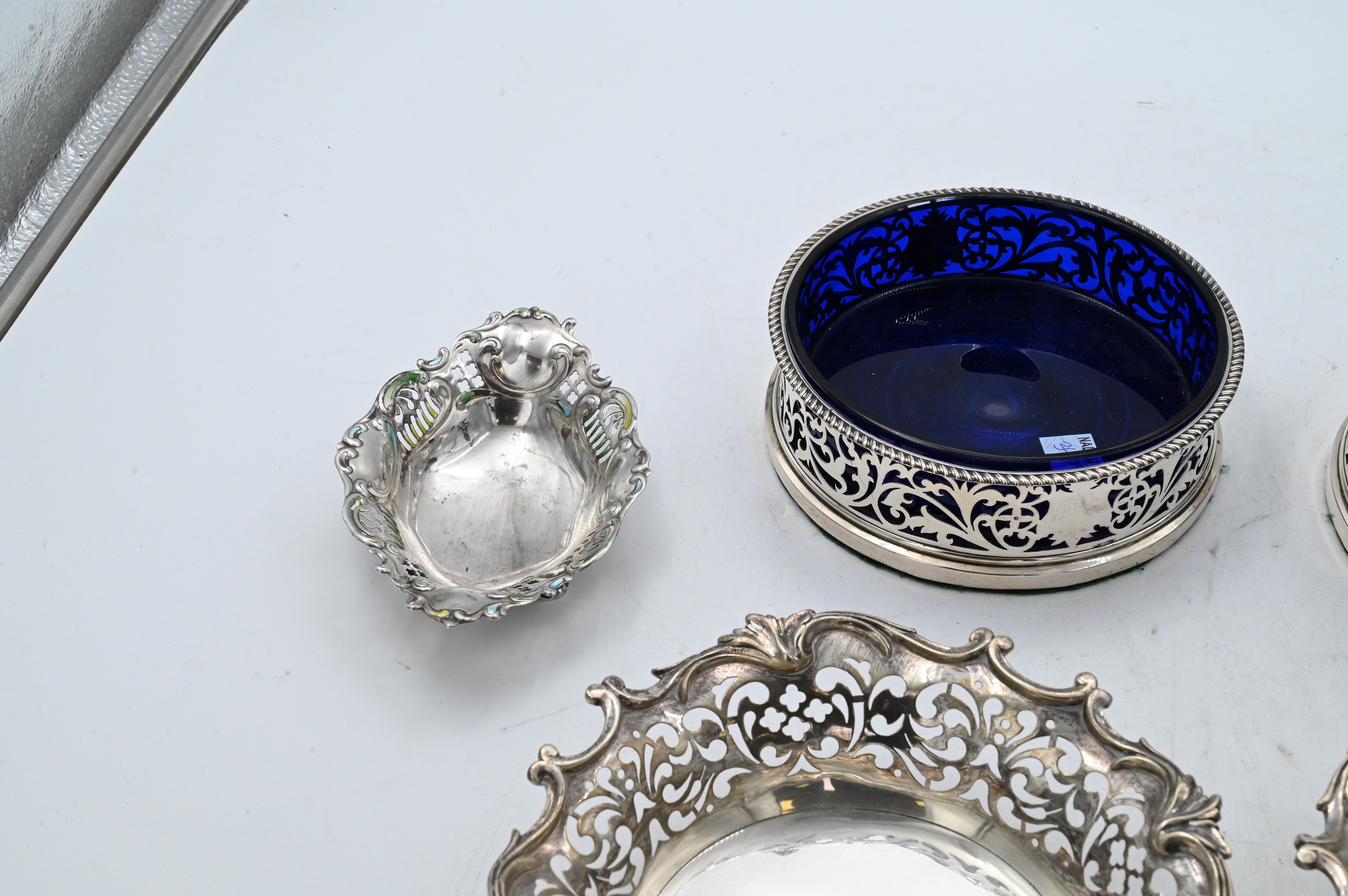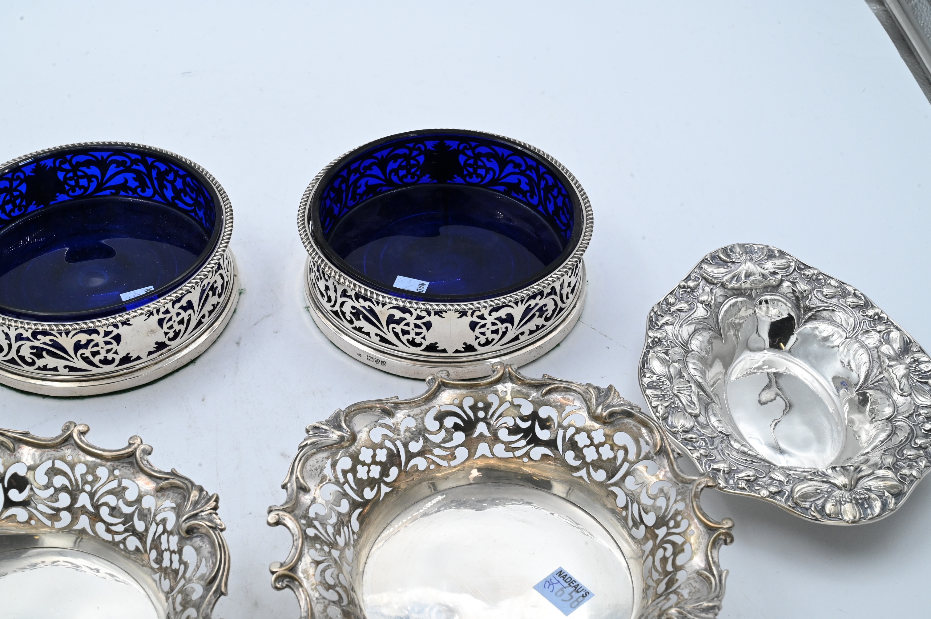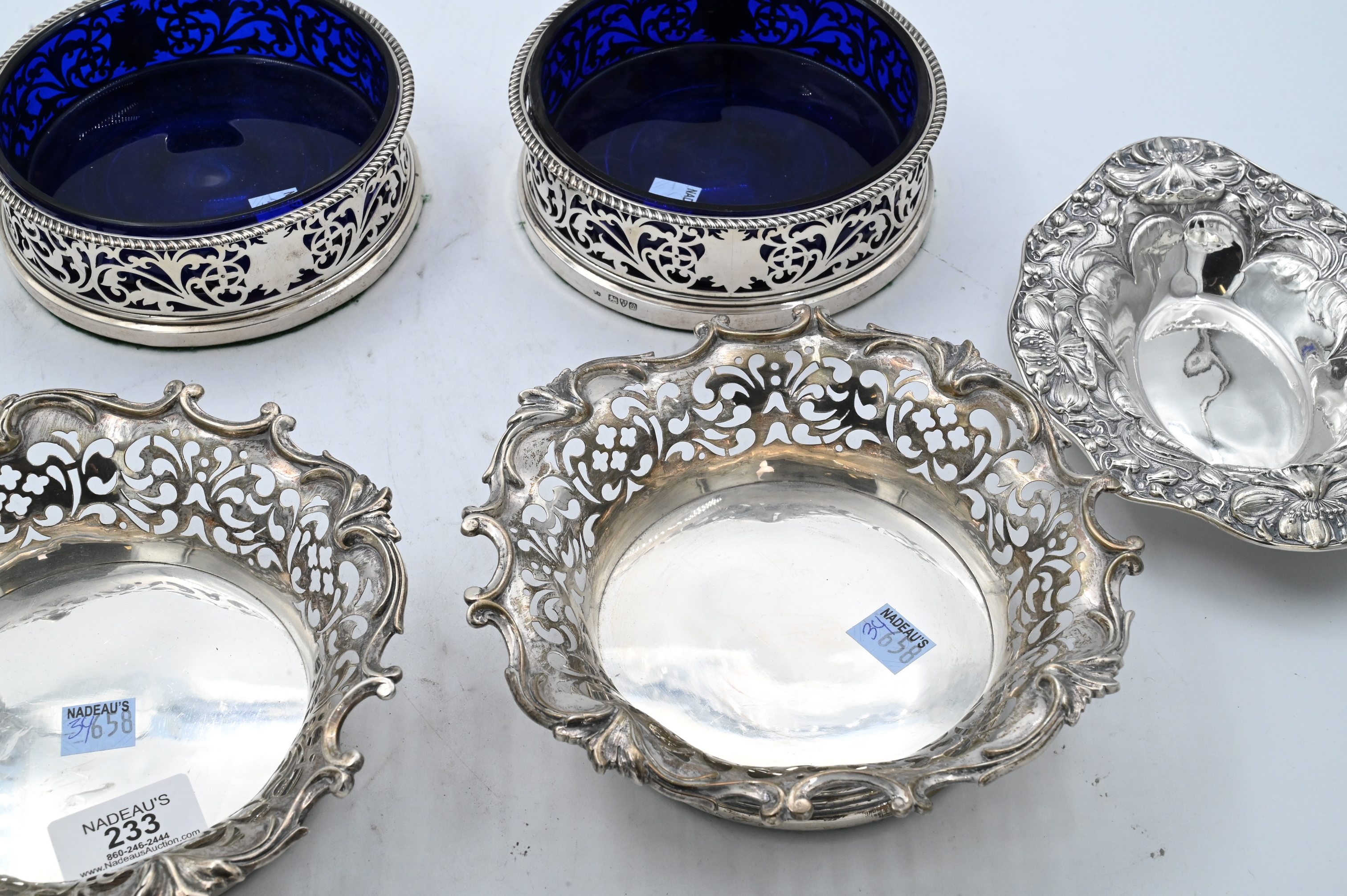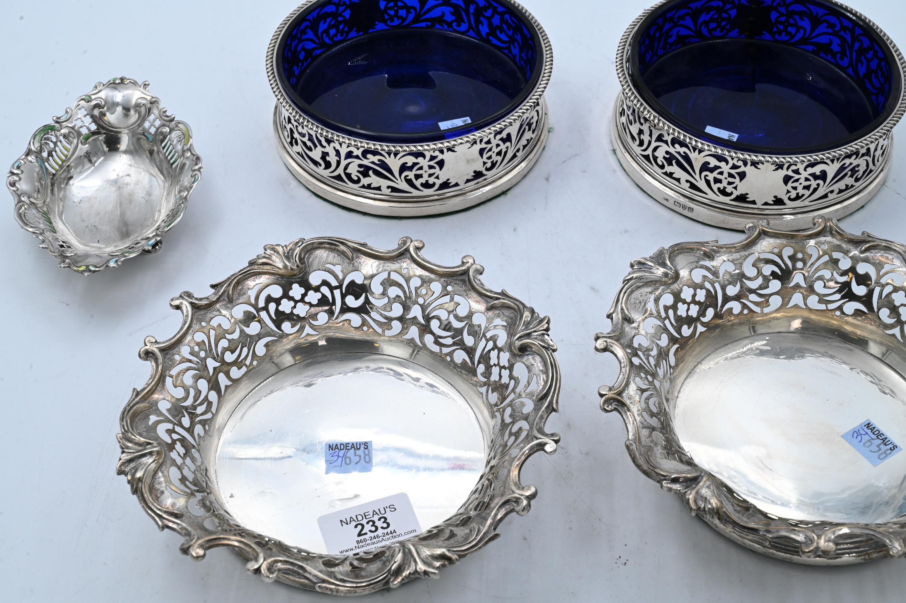 to include two pairs of silver wine coasters, one English pair with cobalt liners marked Howard, along with two small sterling silver dishes