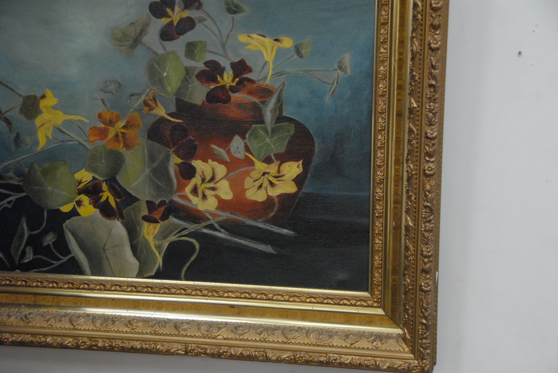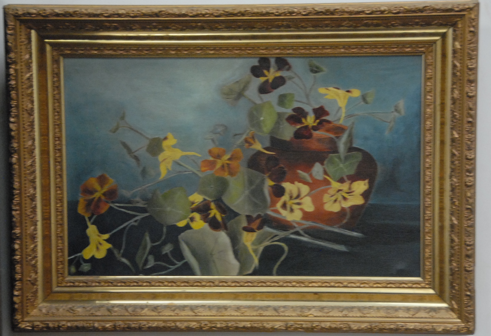 Still life of pansies, oil on canvas in Victorian frame, unsigned.14 x 22