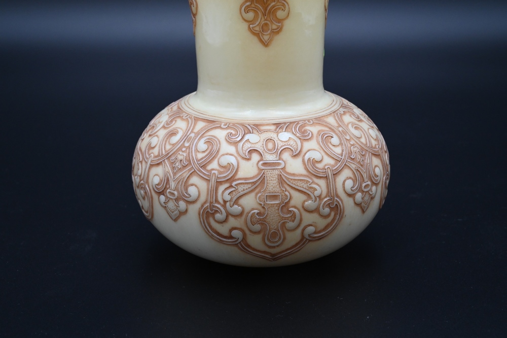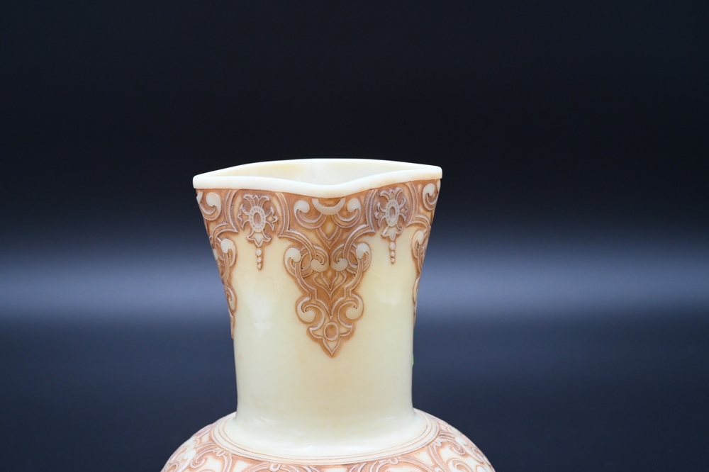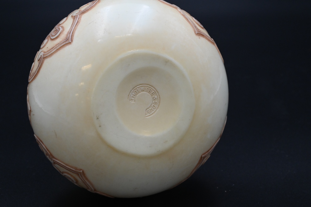 Thomas Webb & Sons Art Glass Vase, having square top and high relief etched design, marked Thomas Webb & Sons on bottom, height 7 1/2 inches, Provenance: Estate of James Dana English of New Haven to benefit the New Haven Museum.