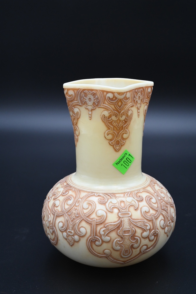 Lot 233: Thomas Webb & Sons Art Glass Vase, having square top and high relief etched design, marked Thomas Webb & Sons on bottom, height 7 1/2 inches, Provenance: Estate of James Dana English of New Haven to benefit the New Haven Museum.