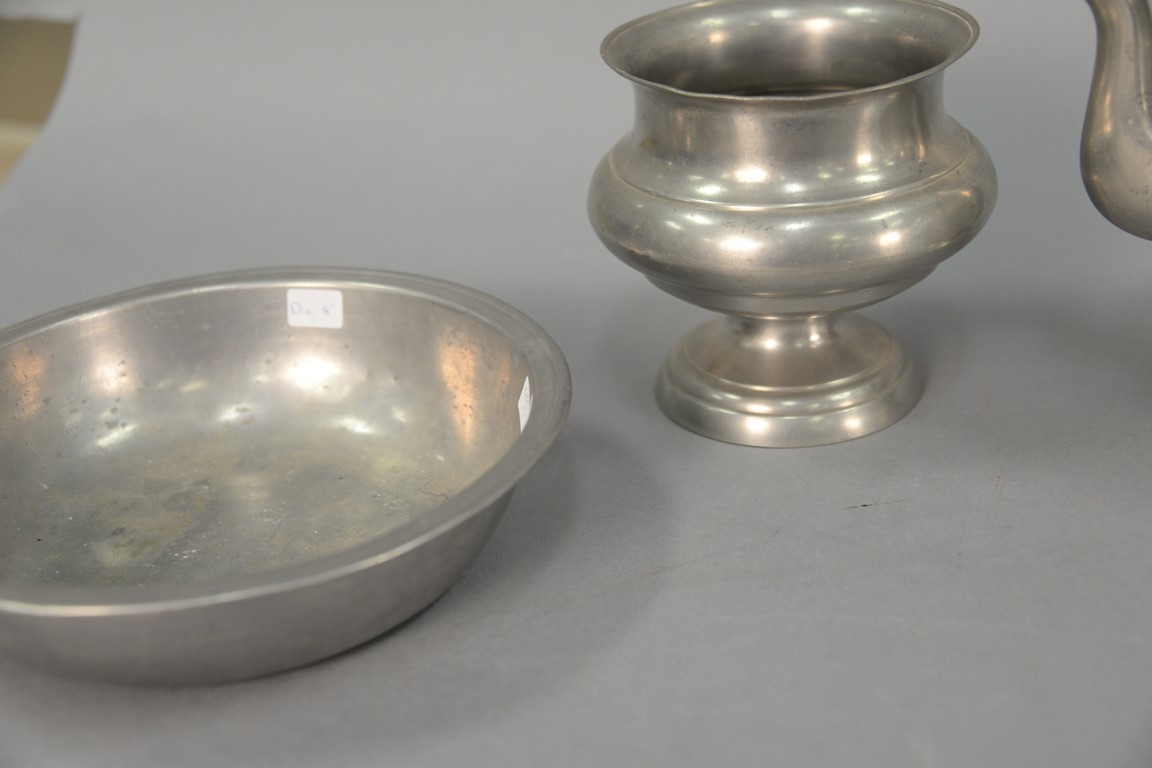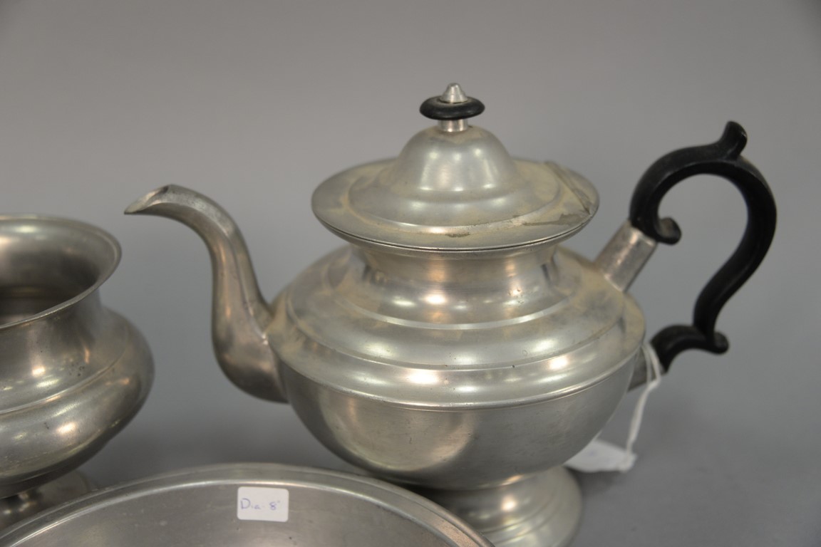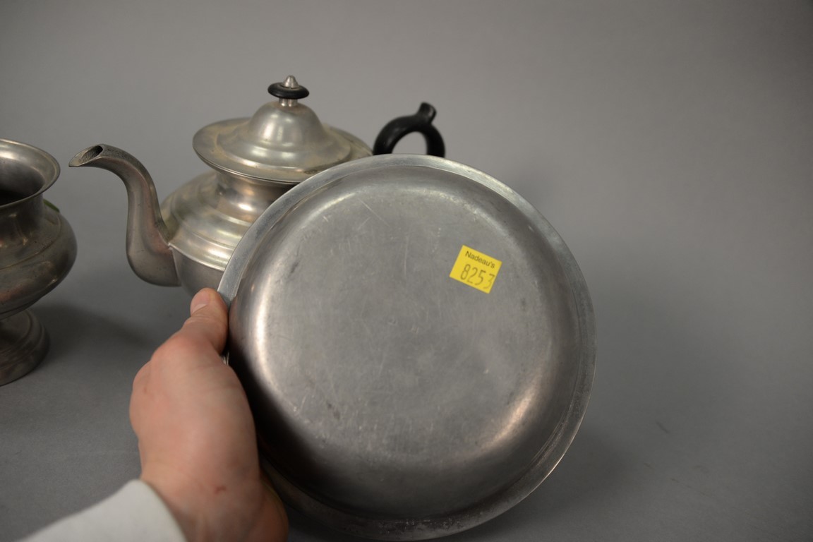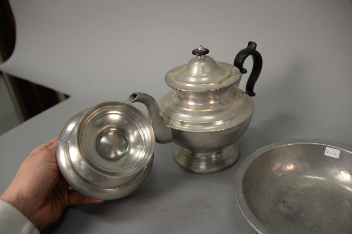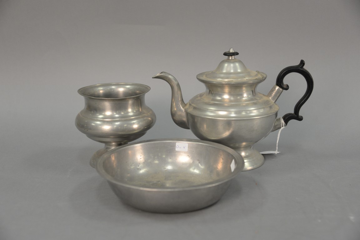 Three piece lot of pewter to include Boardman Hart teapot marked Boardman & Hart N. York, a basin, and a waste bowl.