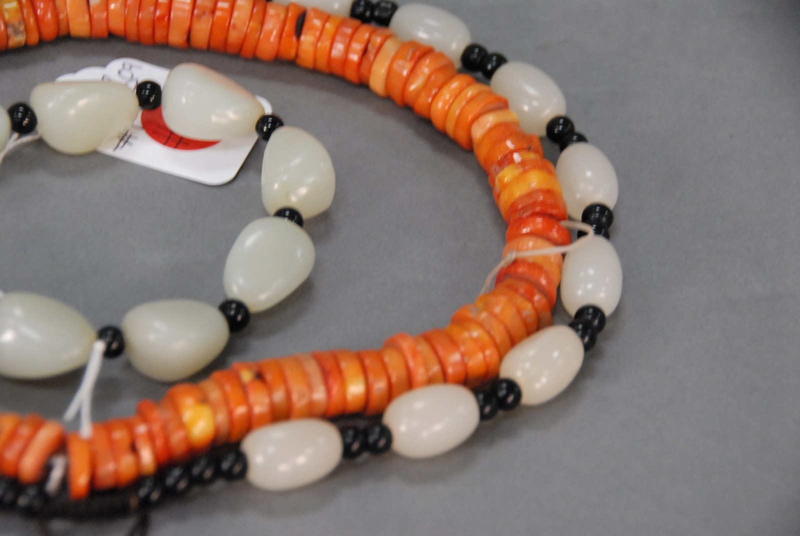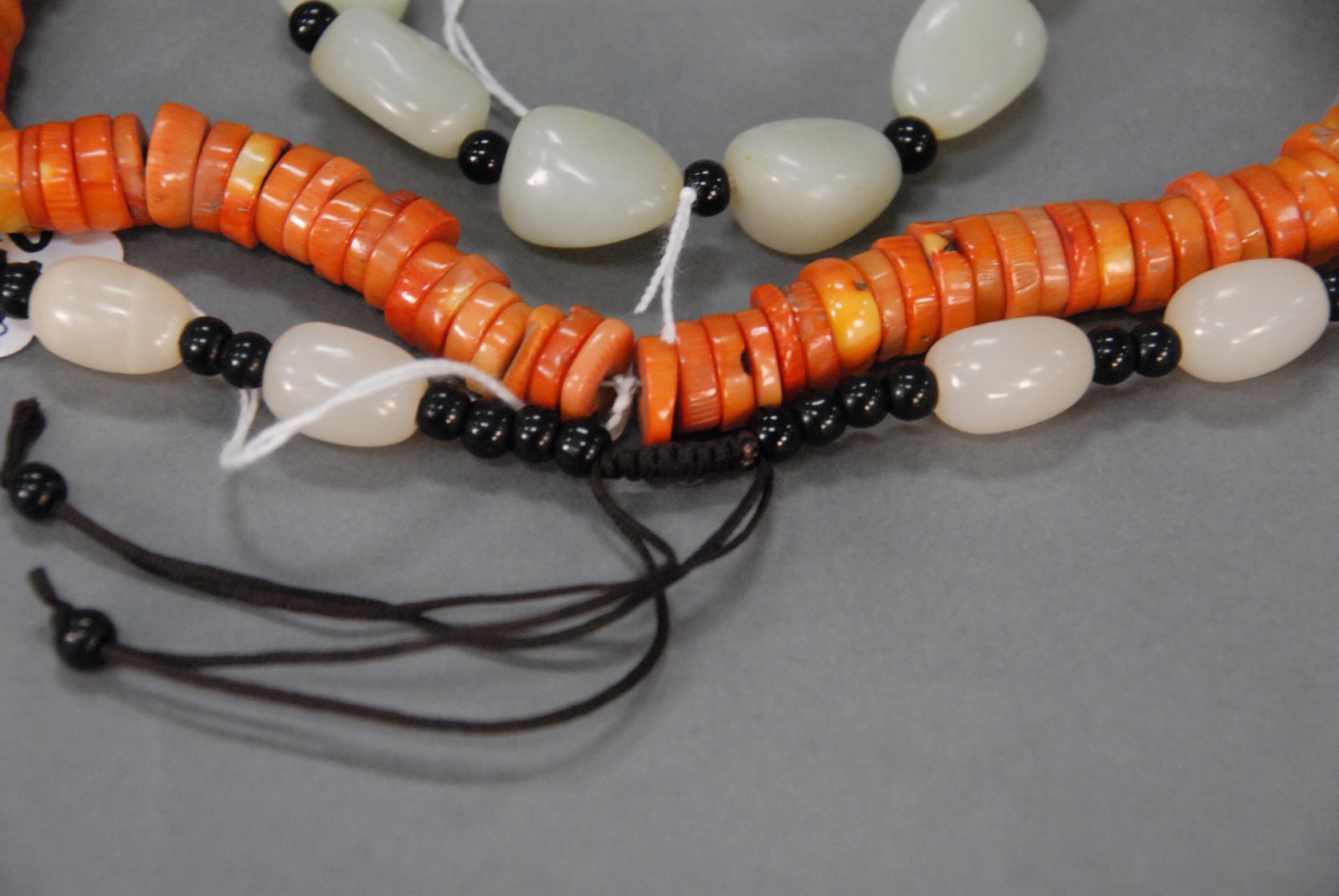 Three piece lot, two necklaces, one jadeite with black beads with matching bracelet, one coral necklace, all 20th century.