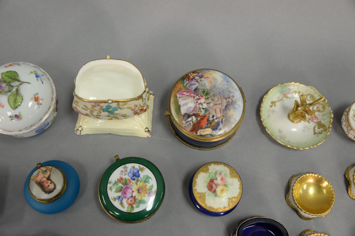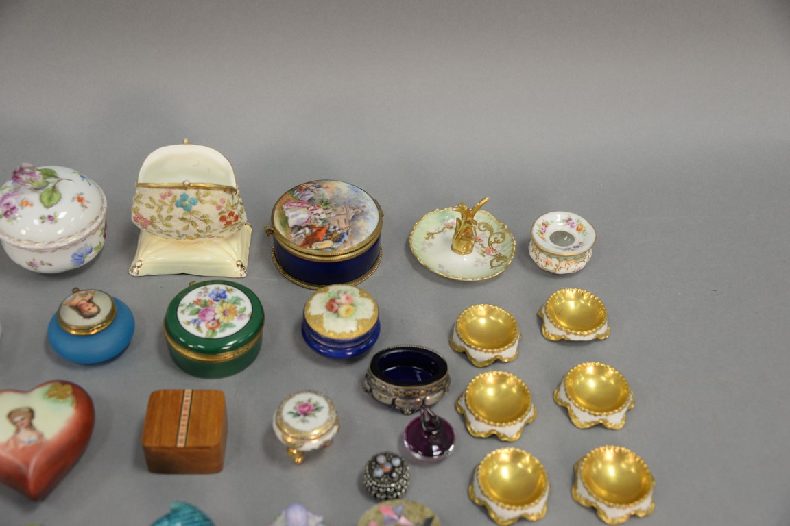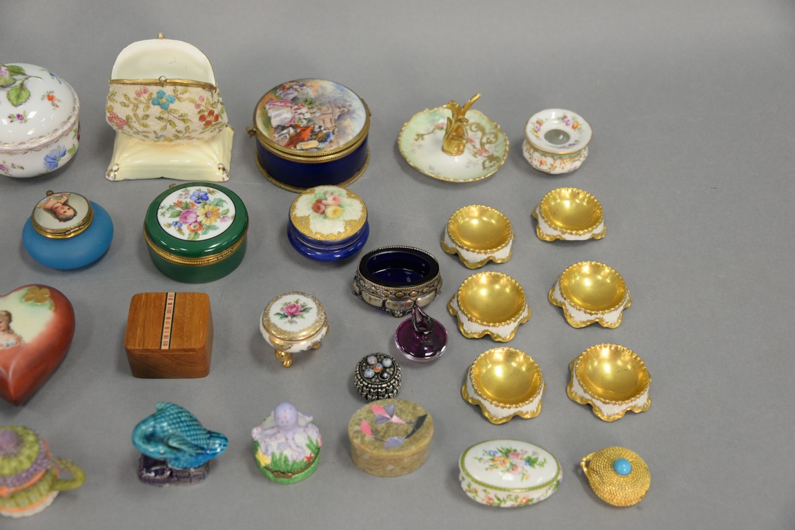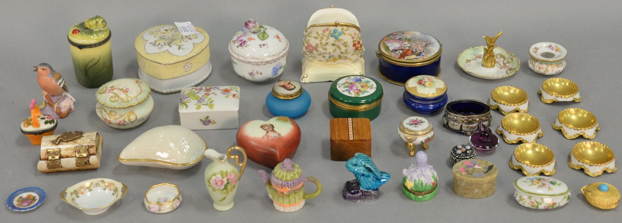 Two tray lots with boxes, trinket and pill boxes, salts, etc. including two Coralene pieces, Dresden box, Lenox shell box, Estee Lauder box, Dresden inkwell, etc.