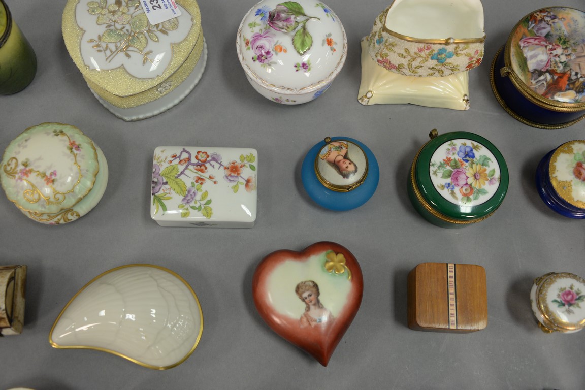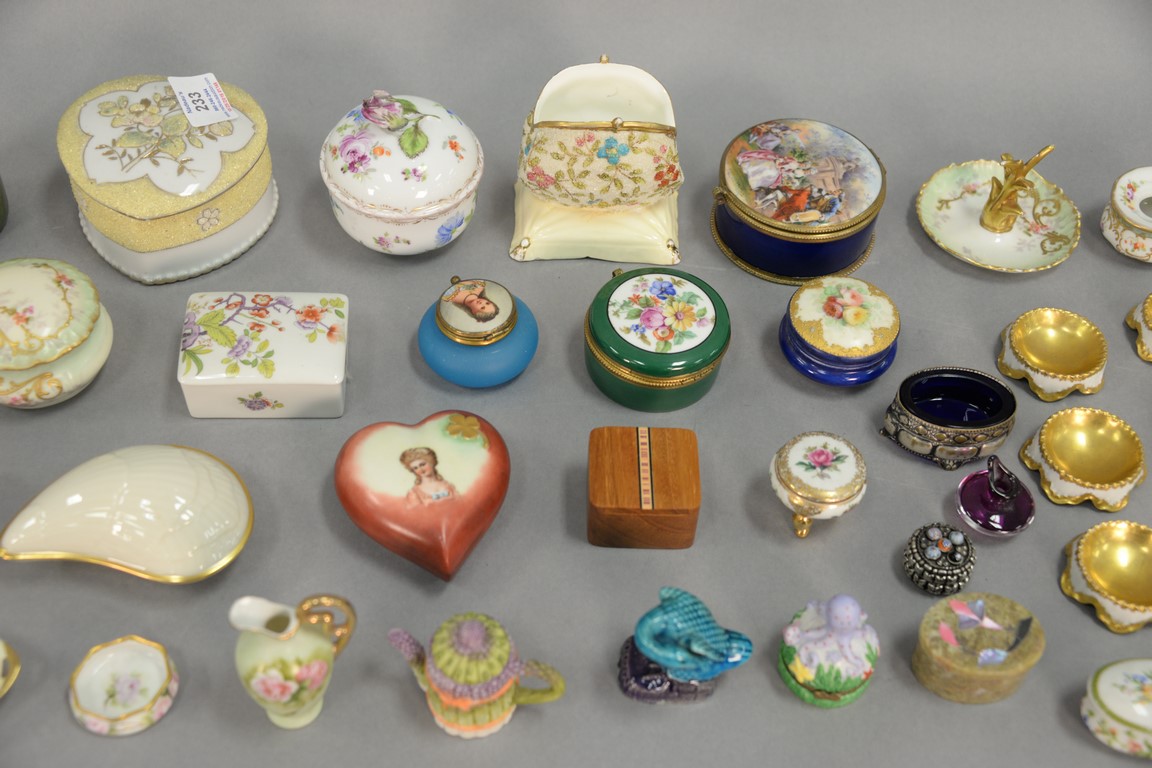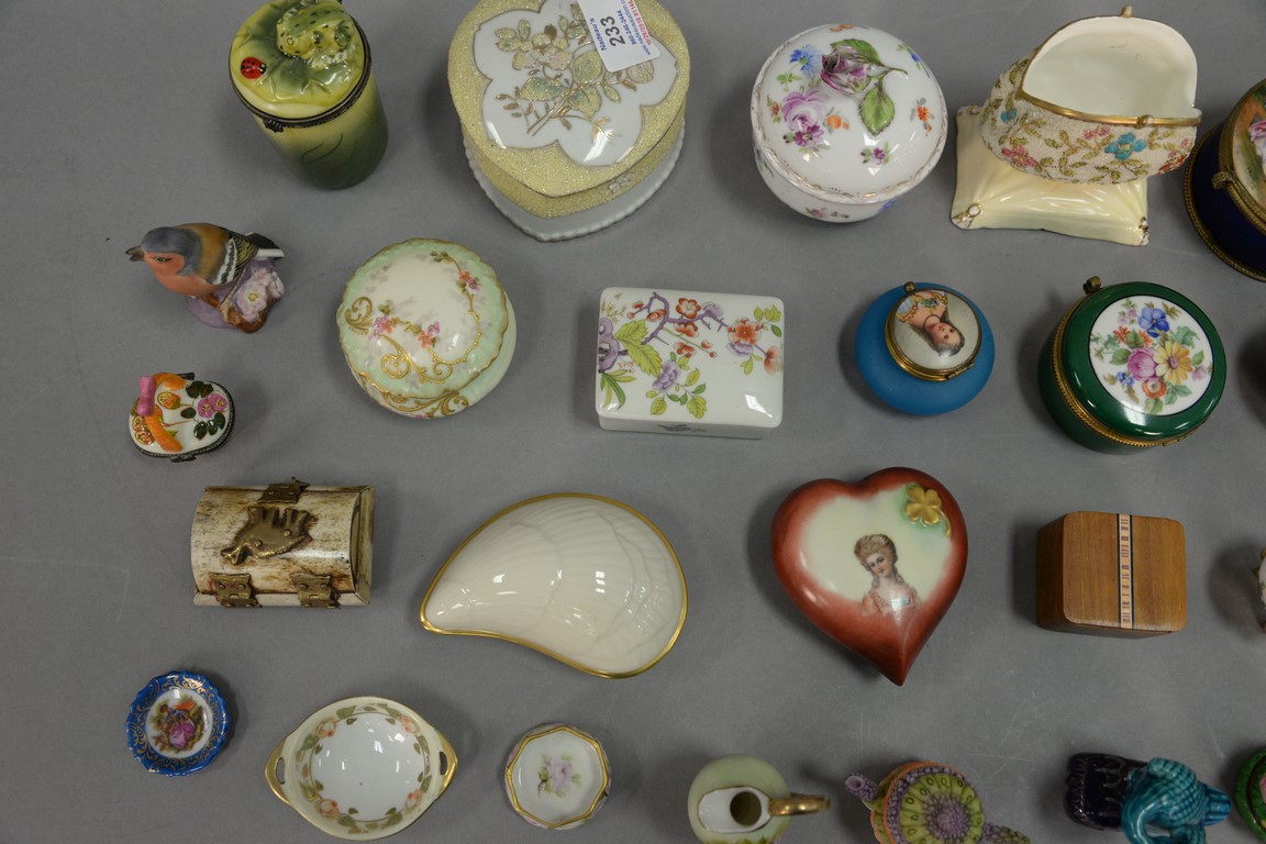 Lot 233: Two tray lots with boxes, trinket and pill boxes, salts, etc. including two Coralene pieces, Dresden box, Lenox shell box, Estee Lau…