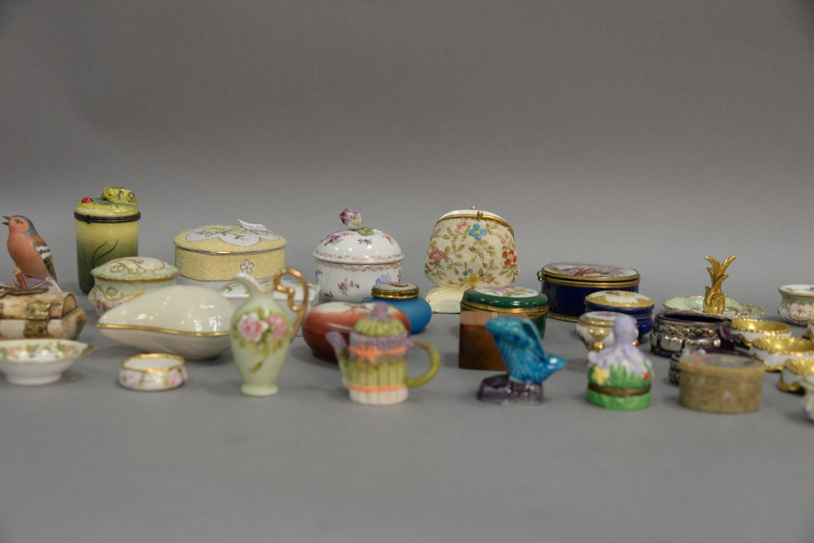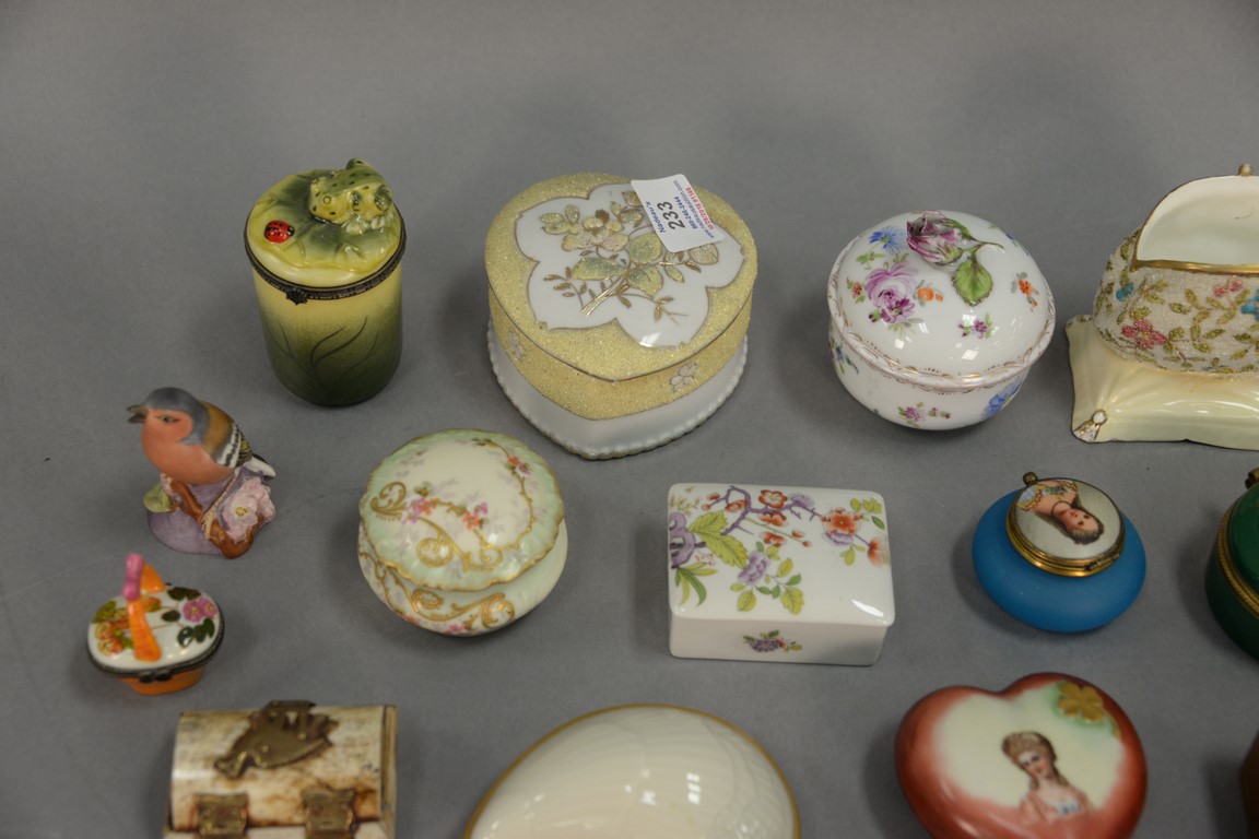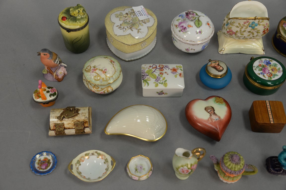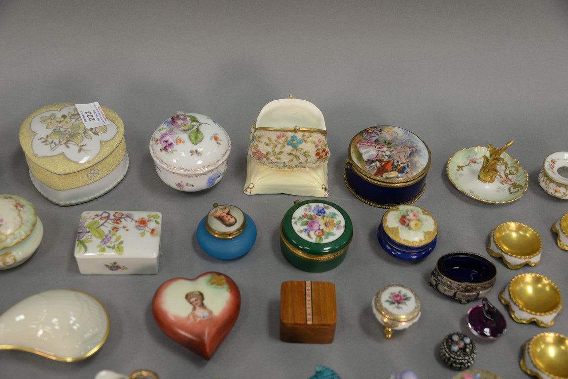 Lot 233: Two tray lots with boxes, trinket and pill boxes, salts, etc. including two Coralene pieces, Dresden box, Lenox shell box, Estee Lau…