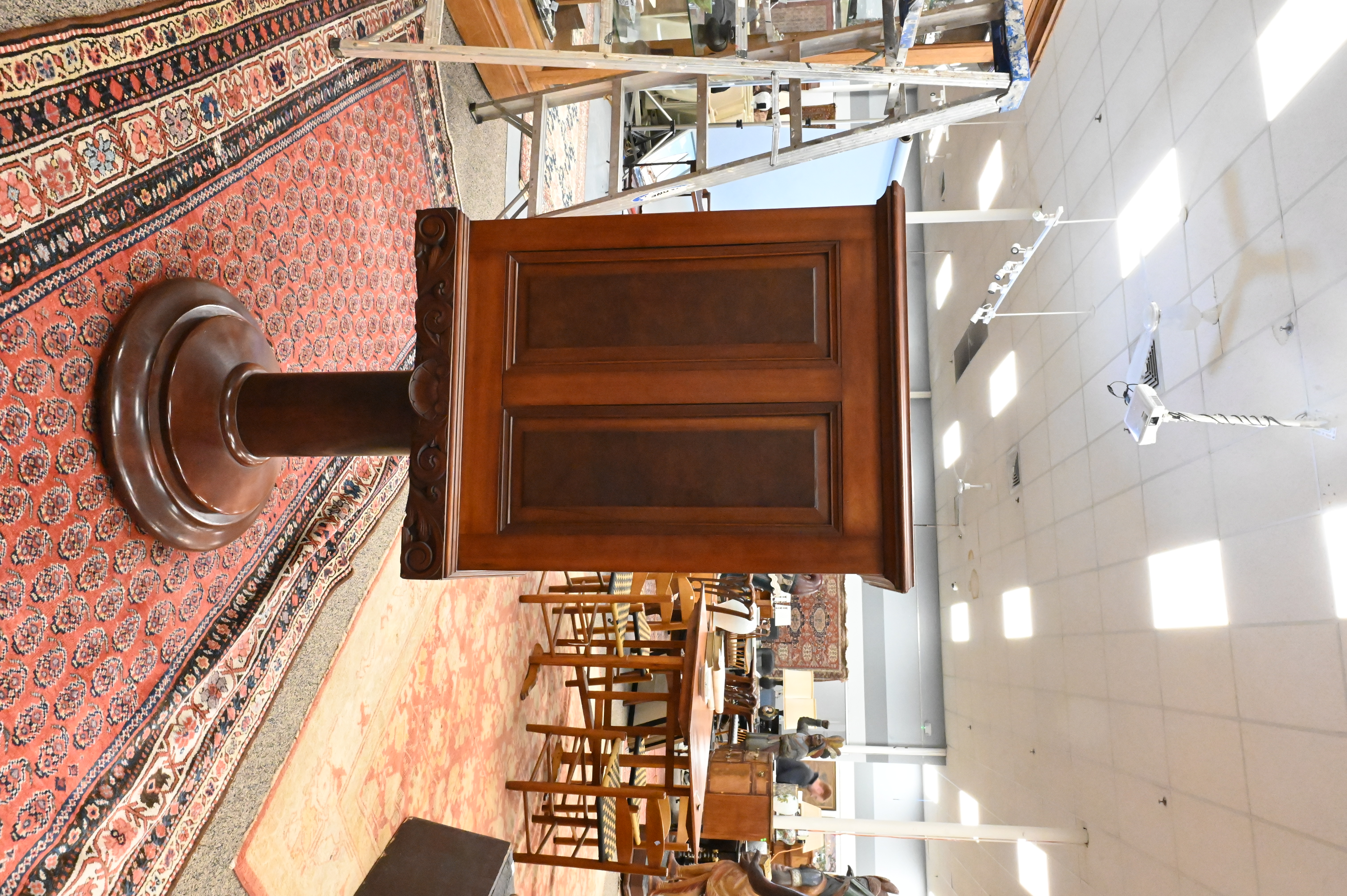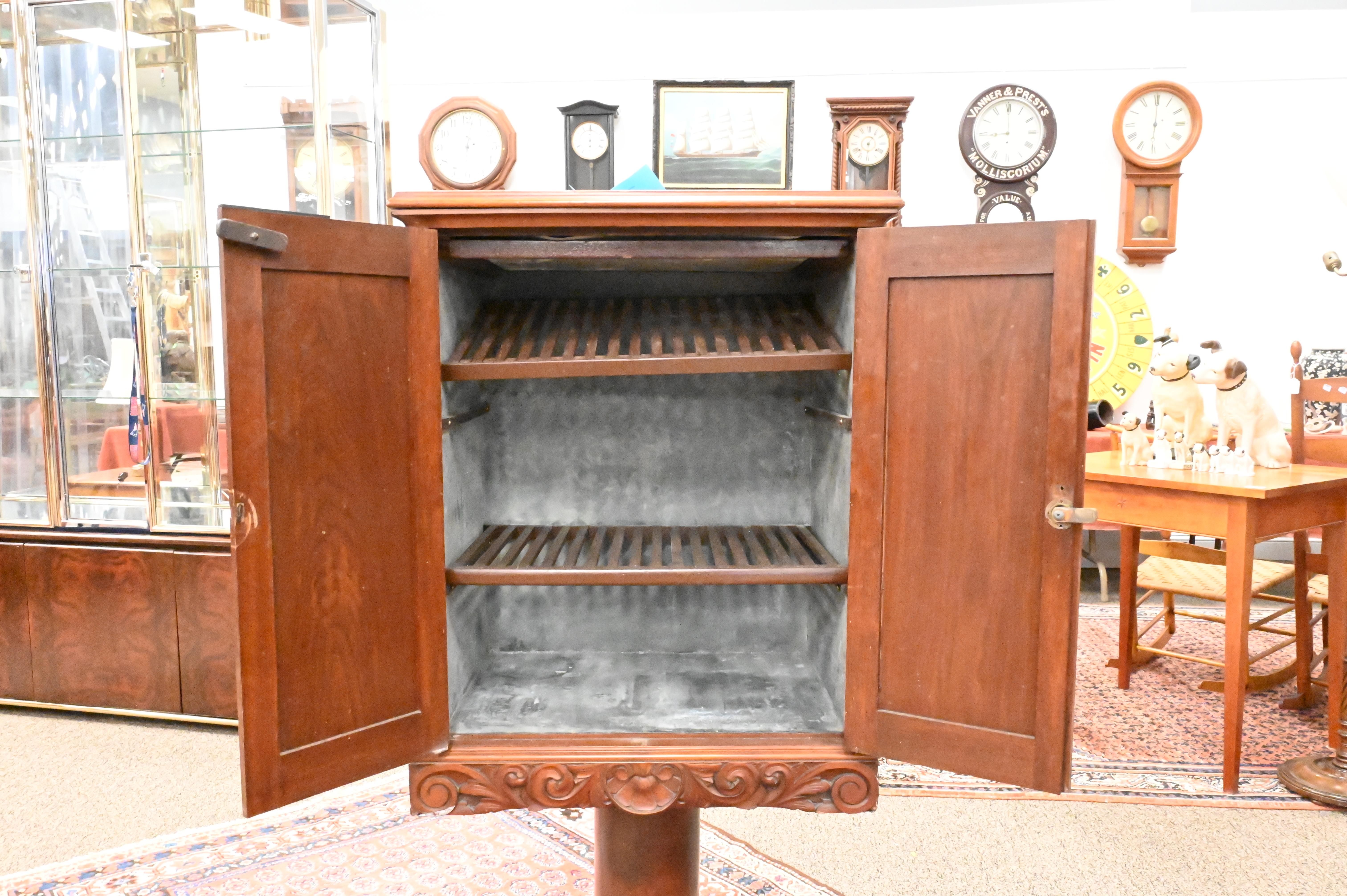 having two burlwood raised panel door sides and back with like burled raised panels with shell and foliage carved bottom edge set on plain turned pedestal on turned base, interior of metal lining and two wood shelves