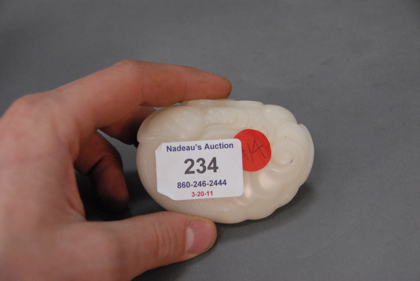 Carved jade of dragon with a cloth fitted box, 20th century.